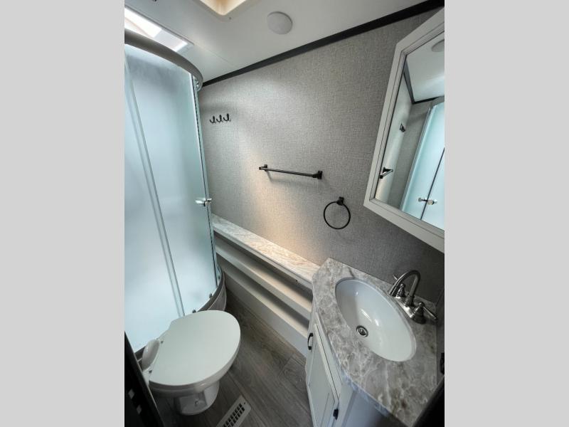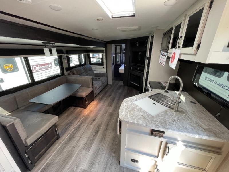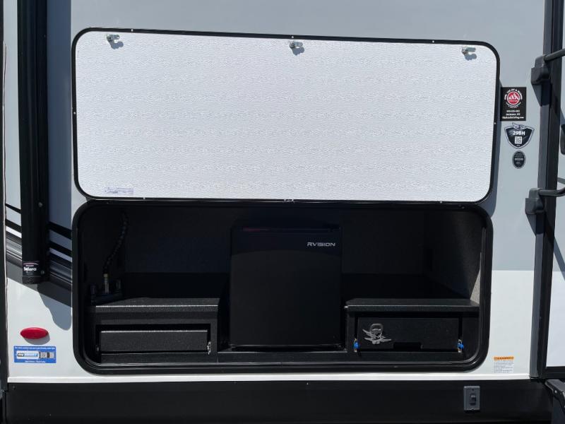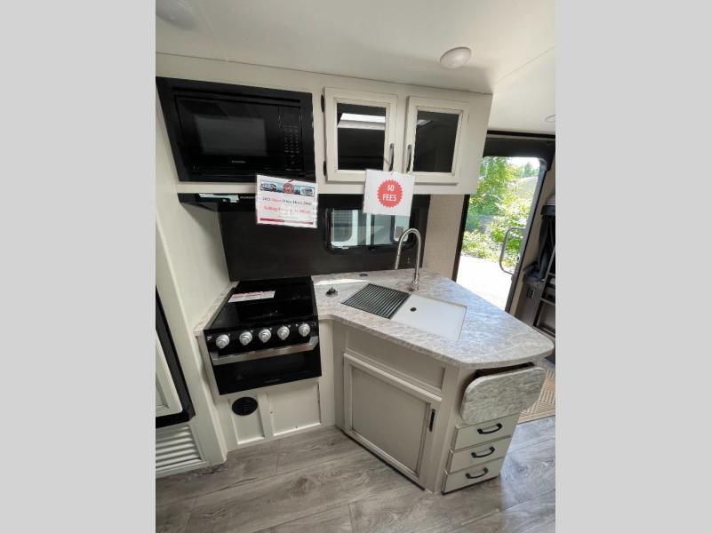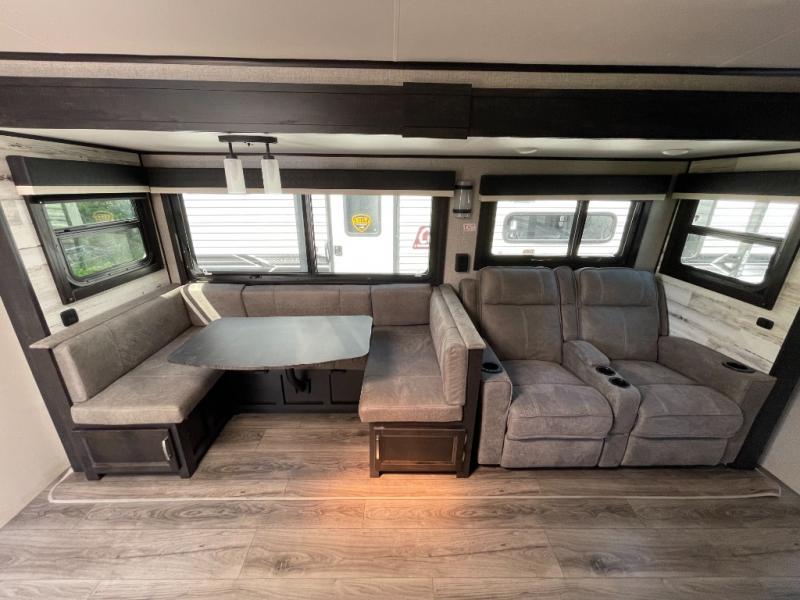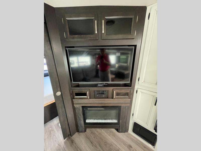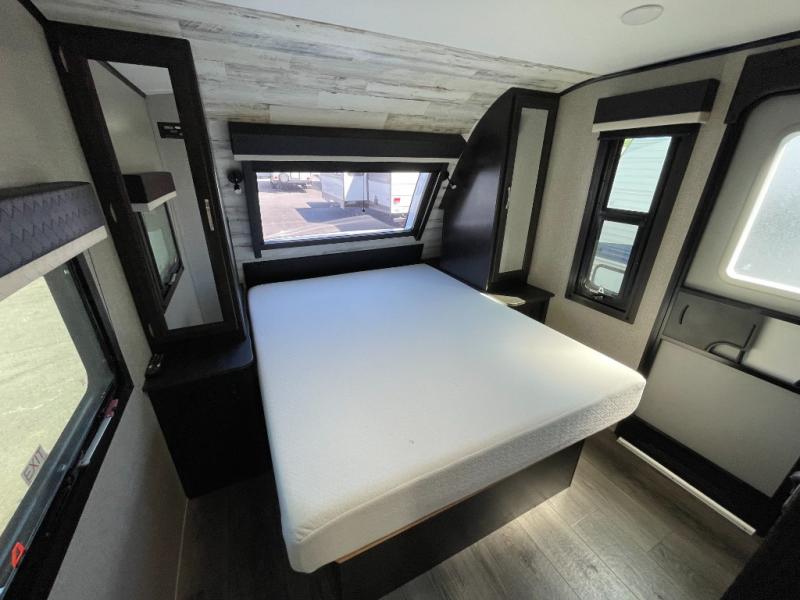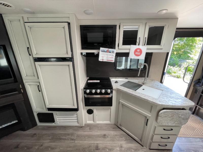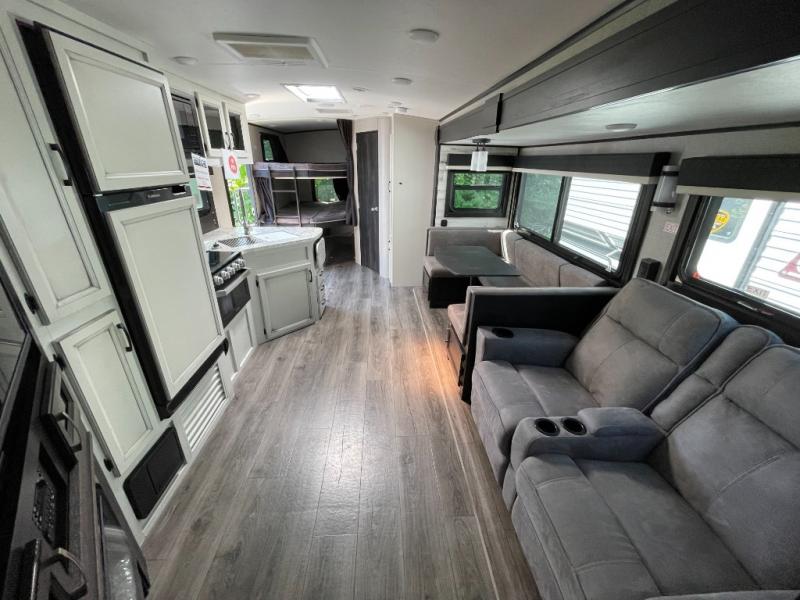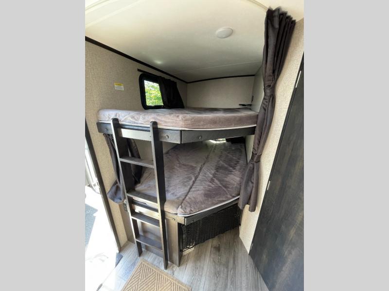 There is something for everyone in this travel trailer! From the double-over-double bunks with a 600 lb. weight rating per bunk with storage below the bottom bunk to the outside kitchen and dual entry doors. The rear corner bathroom is spacious with a glass 34" radius shower that has a skylight above for natural lighting as you get ready and a linen closet to keep your linens close by. You will feel right at home in the front private bedroom with a queen bed that has plenty of walk-around space and a walk-in closet to keep your clothes looking their best. Grab a drink from the 8 cu. ft. refrigerator, fry some bacon on the three burner Furrion glass cooktop, and then head outside and relax underneath the 21' electric awning!