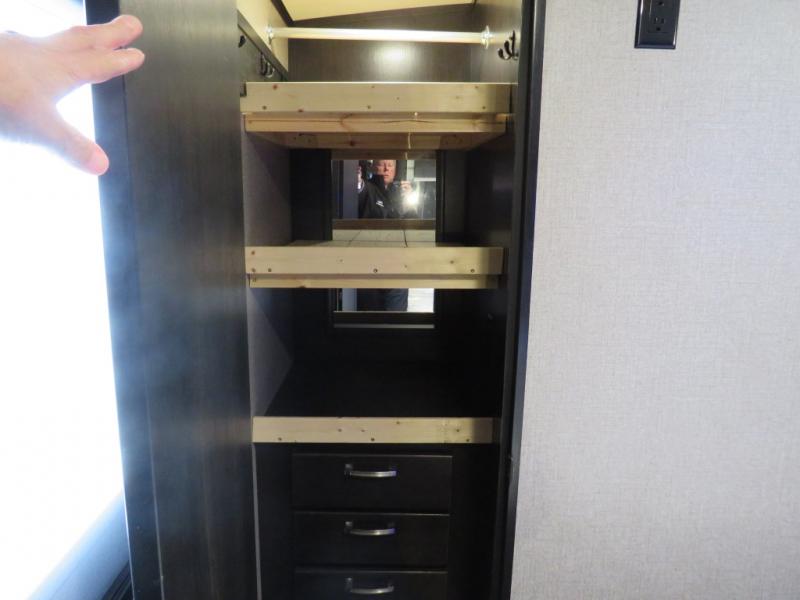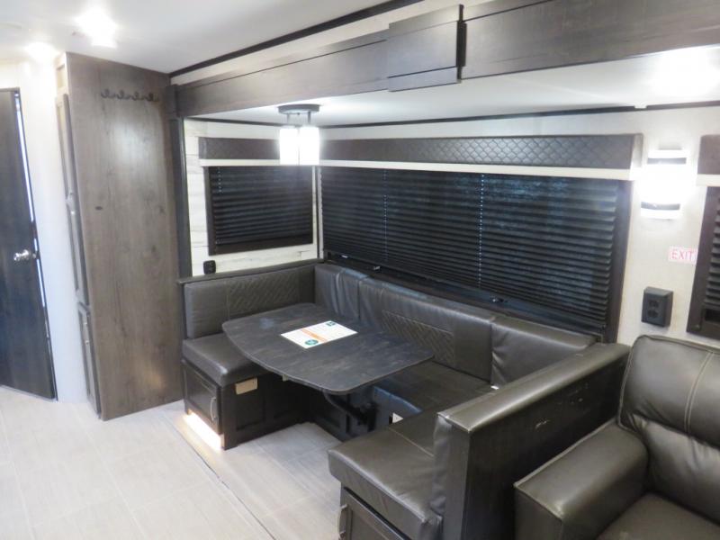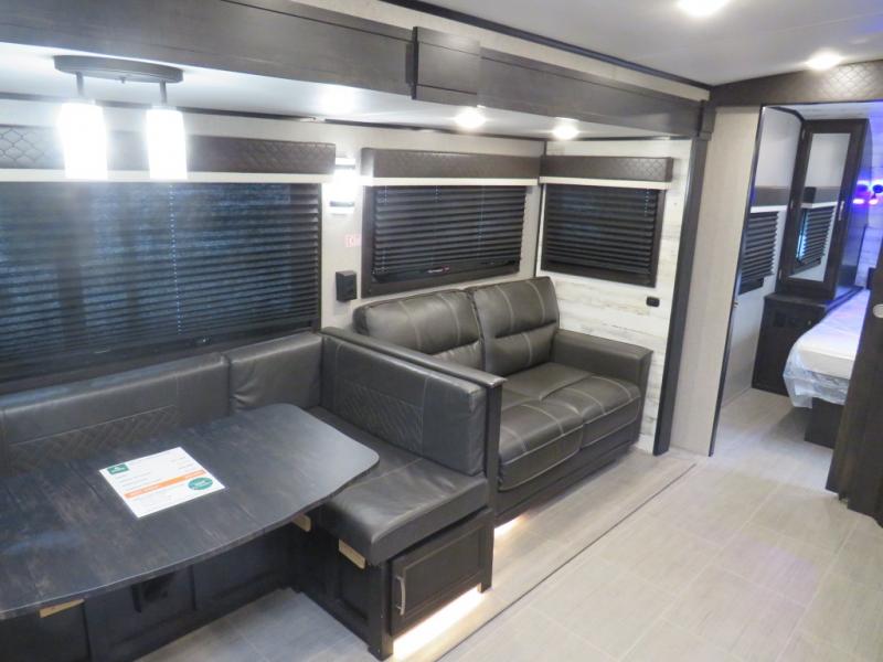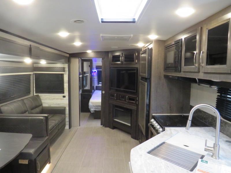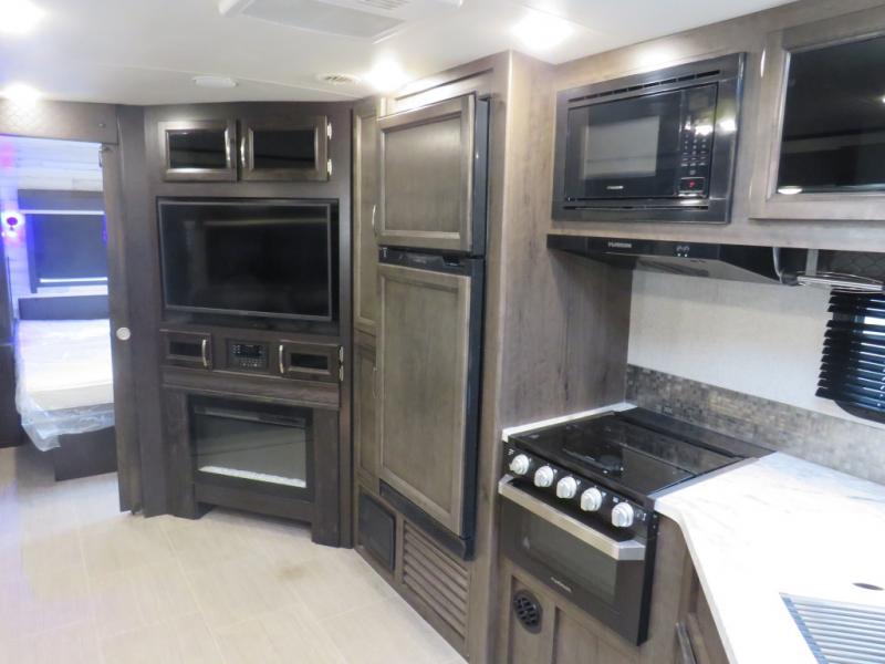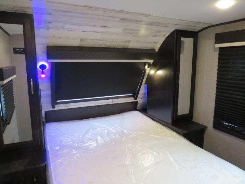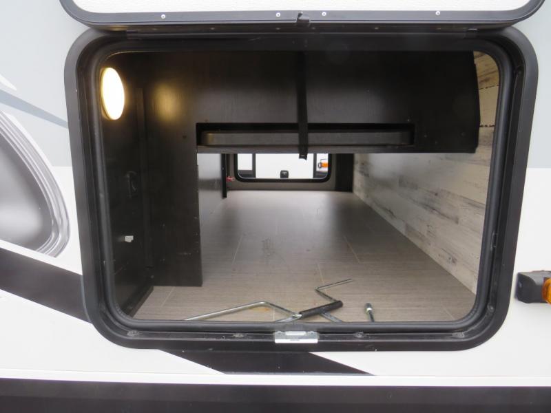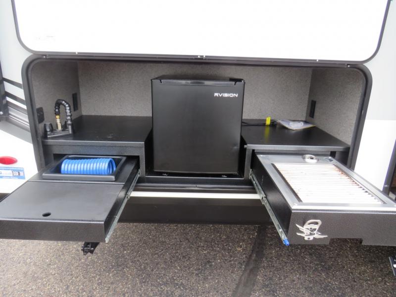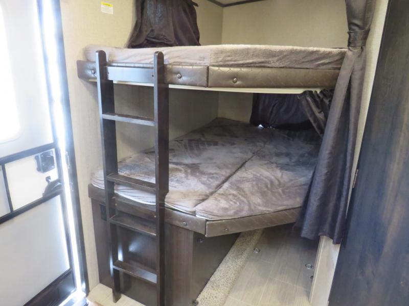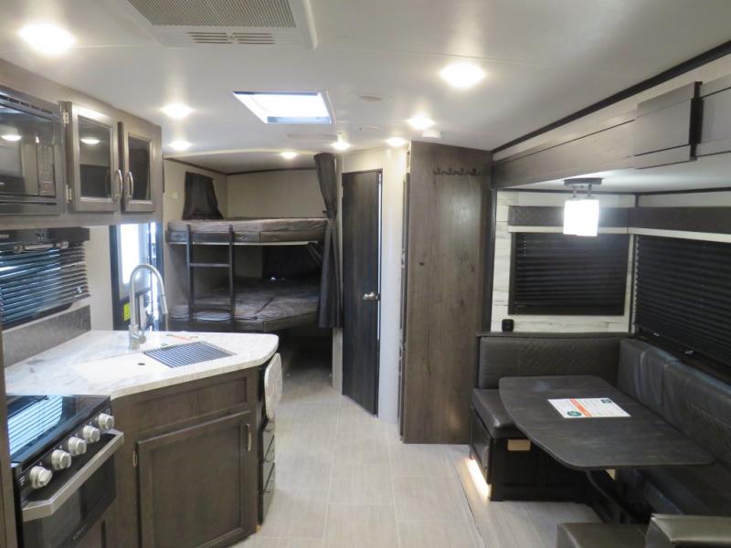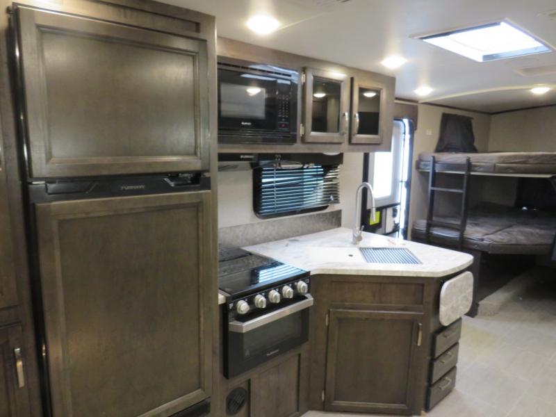 There is something for everyone in this travel trailer! From the double-over-double bunks with a 600 lb. weight rating per bunk with storage below the bottom bunk to the outside kitchen and dual entry doors. The rear corner bathroom is spacious with a glass 34" radius shower that has a skylight above for natural lighting as you get ready and a linen closet to keep your linens close by. You will feel right at home in the front private bedroom with a queen bed that has plenty of walk-around space and a walk-in closet to keep your clothes looking their best. Grab a drink from the 8 cu. ft. refrigerator, fry some bacon on the three burner Furrion glass cooktop, and then head outside and relax underneath the 21' electric awning!