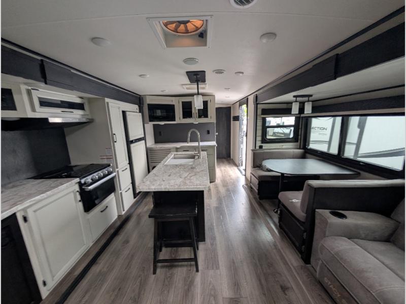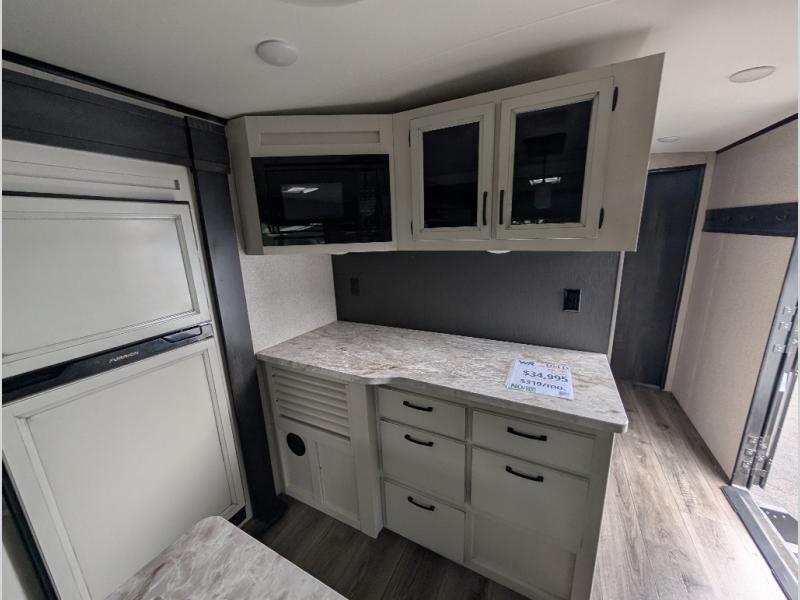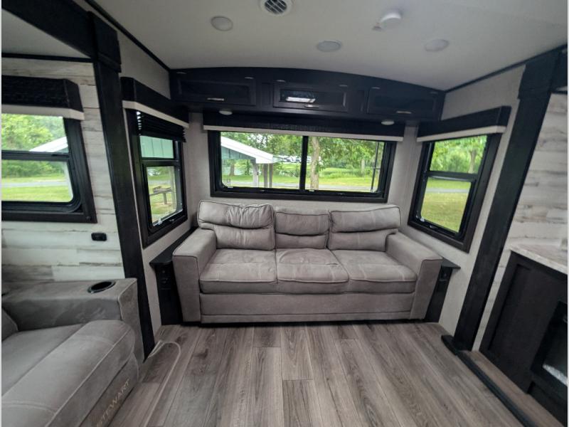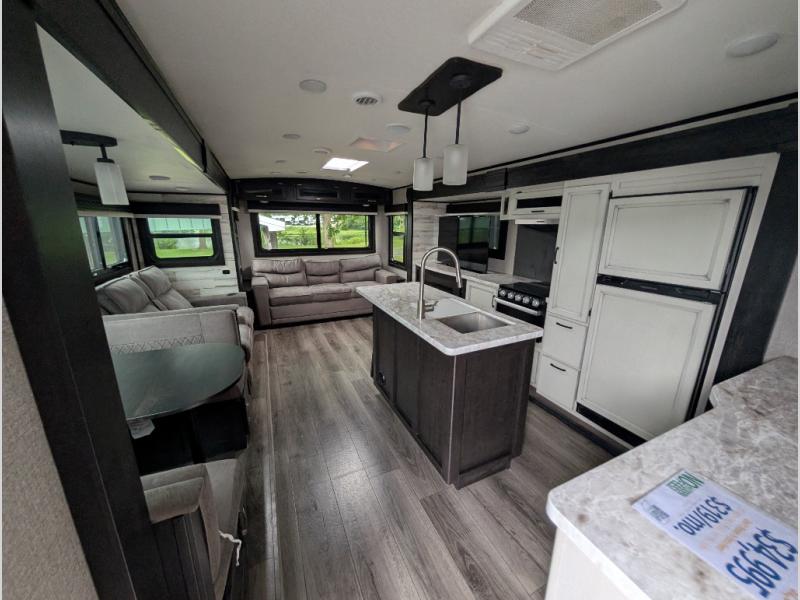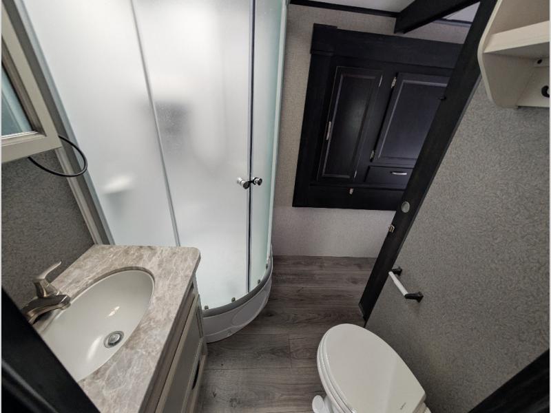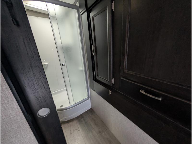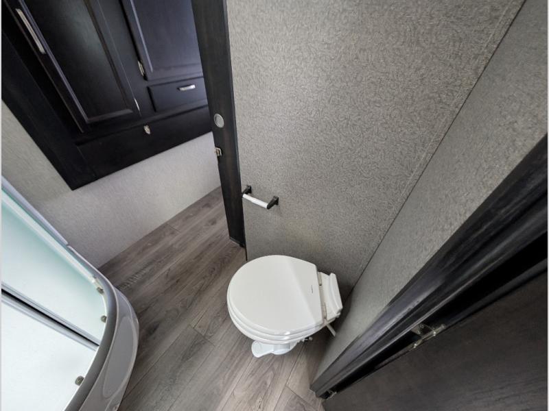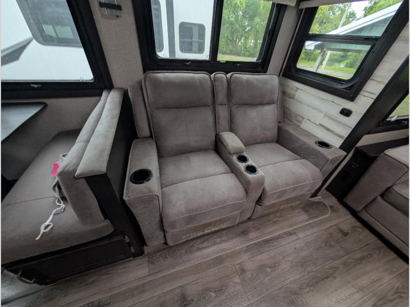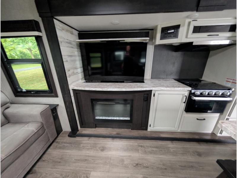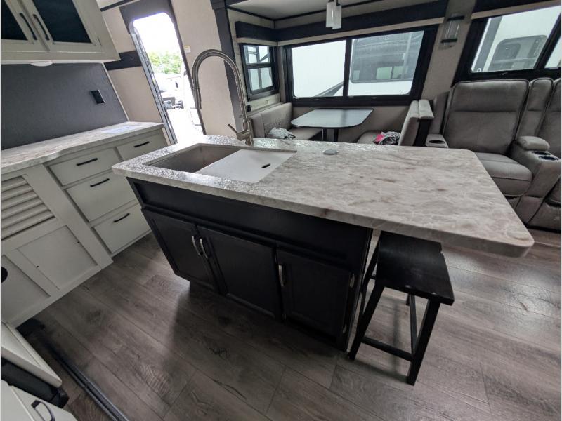 You won't want to camp any other way once you step foot inside this travel trailer with features like the kitchen island with a bar stool at the end and a double sink to make clean up easier! After you have created a delicious home cooked meal with the three burner Furrion glass cooktop, you can head to the booth dinette and enjoy eating it there comfortably. If there happens to be any leftovers you can store them in the 8 cu. ft. refrigerator and then relax on either the tri-fold sofa or the theater seating directly across from the entertainment center with a 50" LED TV and an electric fireplace. The spacious dual entry bathroom has a glass 34" radius shower with a skylight above to let in some natural lighting, a linen closet to keep your towels close by, and an entrance into the front private bedroom. The front private bedroom will meet your storage needs with three wardrobes, and you will enjoy a good night's rest each night on the comfortable queen bed!