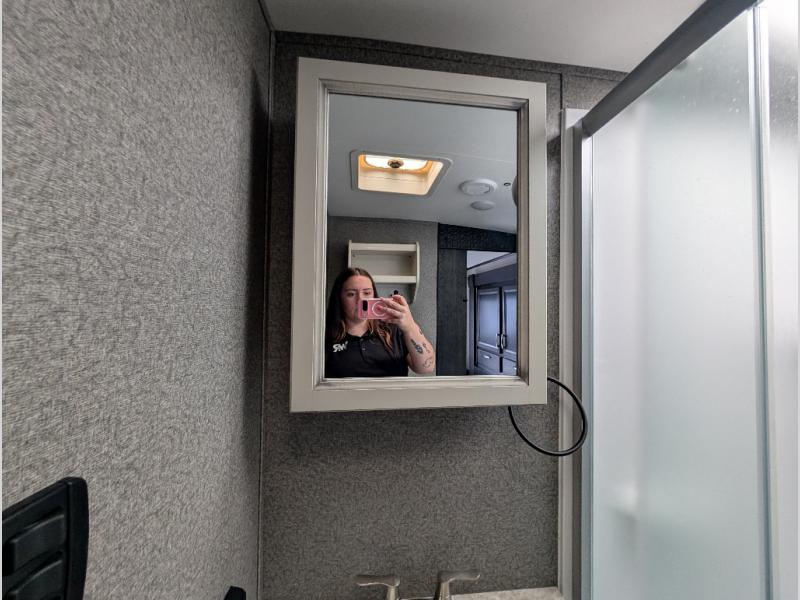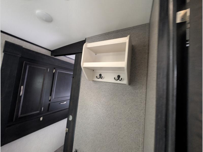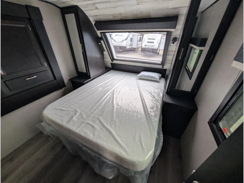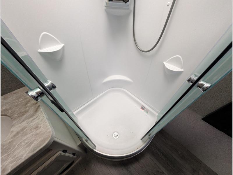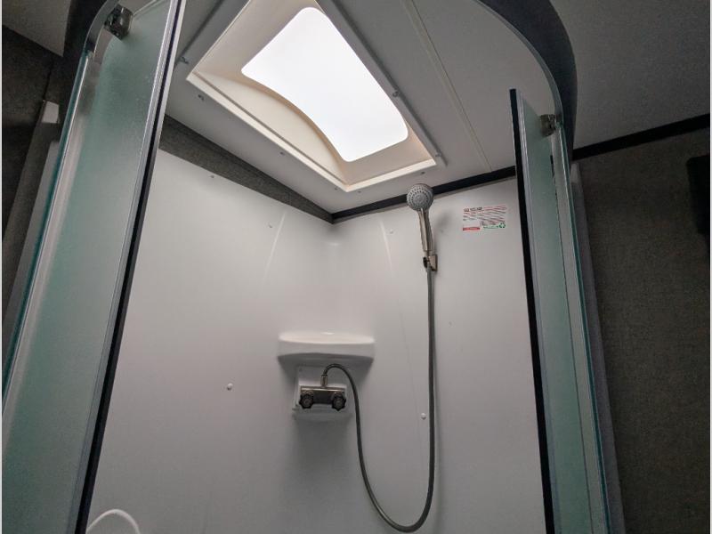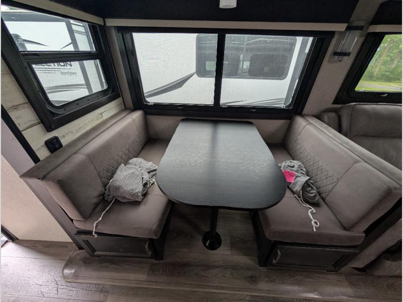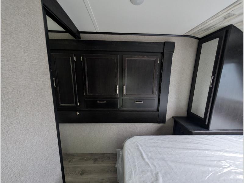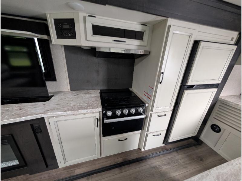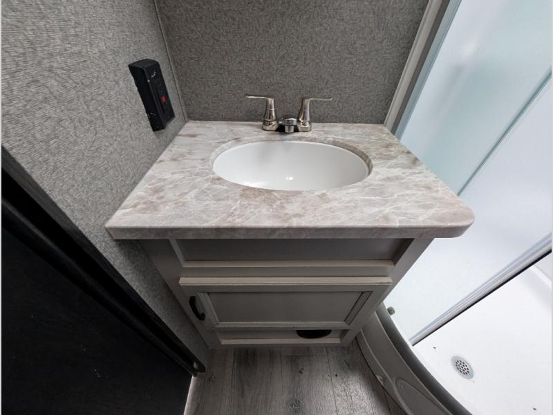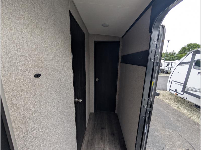 You won't want to camp any other way once you step foot inside this travel trailer with features like the kitchen island with a bar stool at the end and a double sink to make clean up easier! After you have created a delicious home cooked meal with the three burner Furrion glass cooktop, you can head to the booth dinette and enjoy eating it there comfortably. If there happens to be any leftovers you can store them in the 8 cu. ft. refrigerator and then relax on either the tri-fold sofa or the theater seating directly across from the entertainment center with a 50" LED TV and an electric fireplace. The spacious dual entry bathroom has a glass 34" radius shower with a skylight above to let in some natural lighting, a linen closet to keep your towels close by, and an entrance into the front private bedroom. The front private bedroom will meet your storage needs with three wardrobes, and you will enjoy a good night's rest each night on the comfortable queen bed!