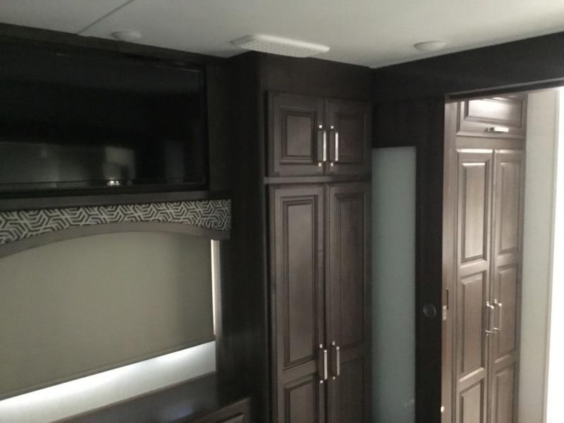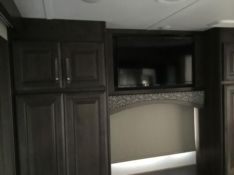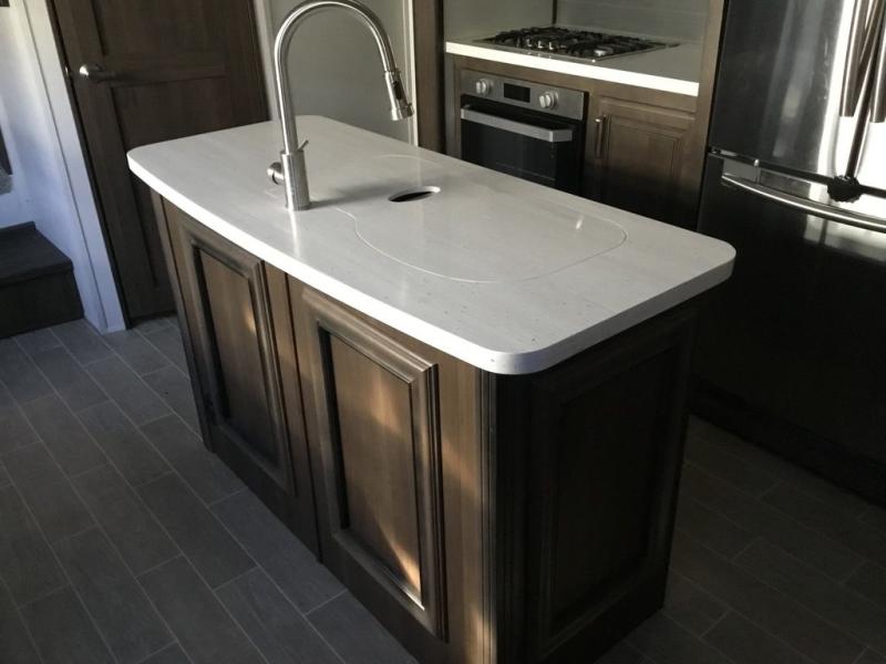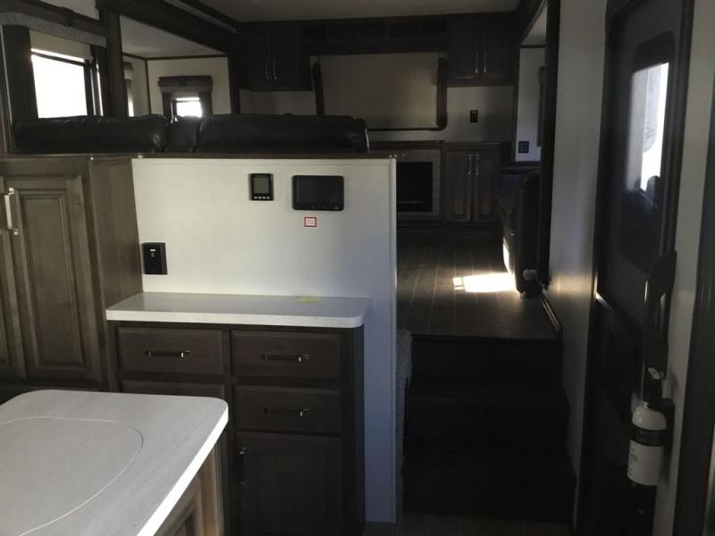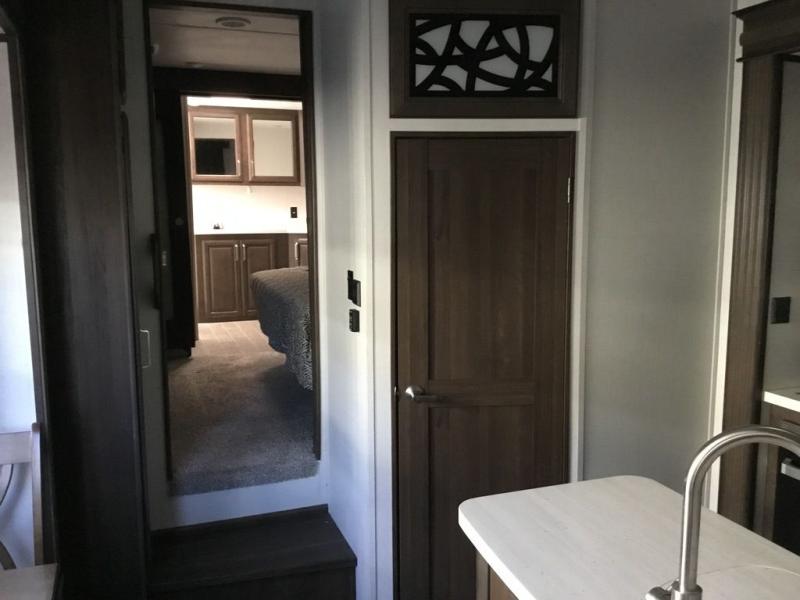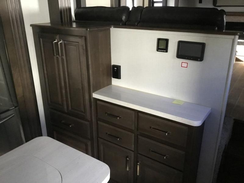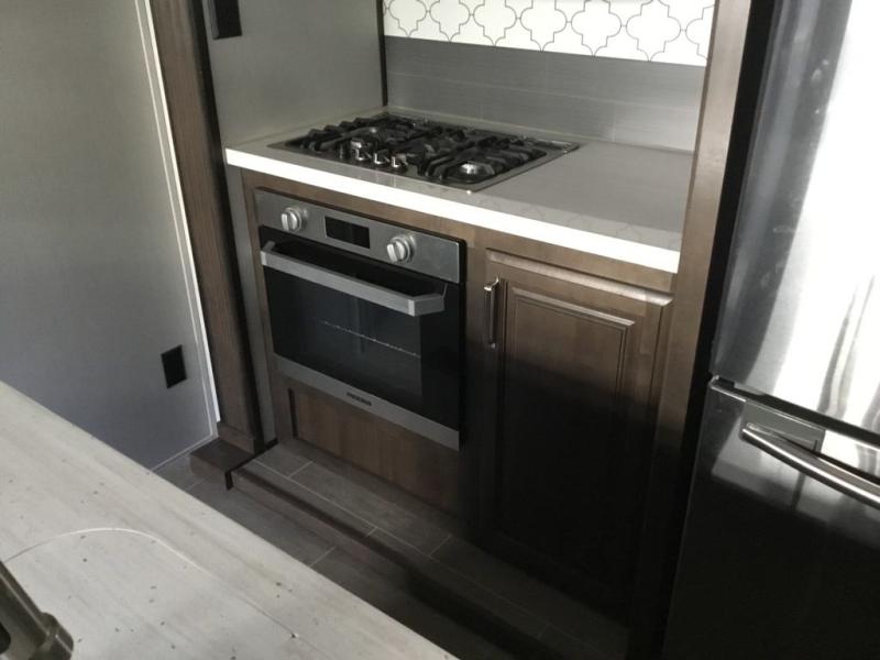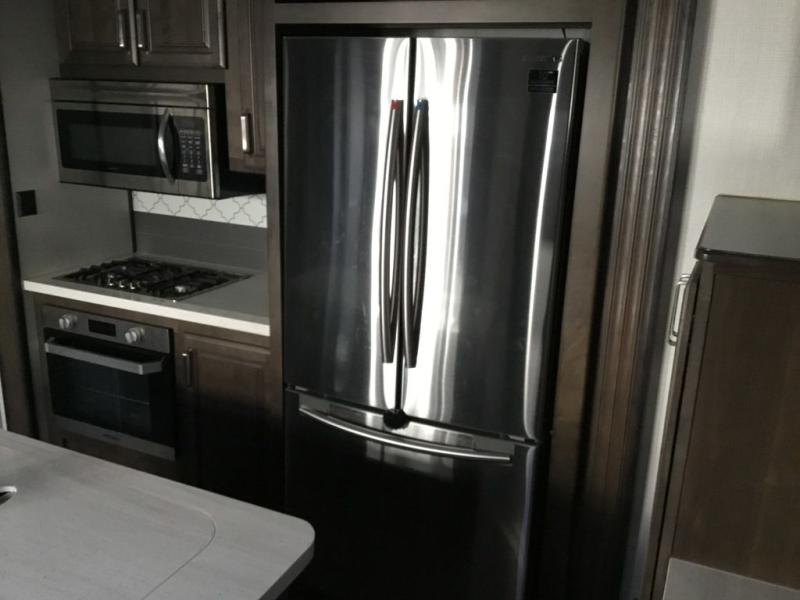 When you choose an Alpine fifth wheel by Keystone RV, you are choosing luxury, innovation, modern style and so much more! The stunning Aspen Oak cabinetry with contrasting Renewed Oak accents and vintage wire mesh glass inserts, the polished natural stone solid surface countertops, and the varied plank width resilient flooring throughout are just a few highlights inside. Some other noteworthy features include the high-fidelity video and audio to withstand road vibration with three, separately controlled sound zones with smartphone app capability, and the iN-Command system with oversized touchscreen monitor giving you control of the slides, awnings, and HVAC. Each Alpine is built with 100" wide body construction, a dual 15,000 BTU Whisper Quiet A/C system, a Nautilus On-Demand water heater for instant, endless hot water, and insulated wrapped tanks with 12 volt heat pads allowing you to travel every season.
