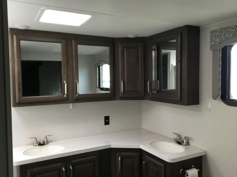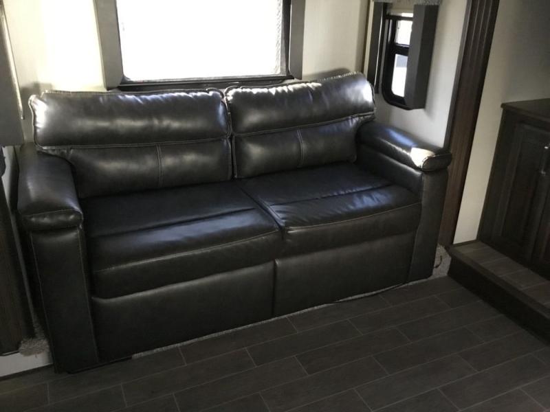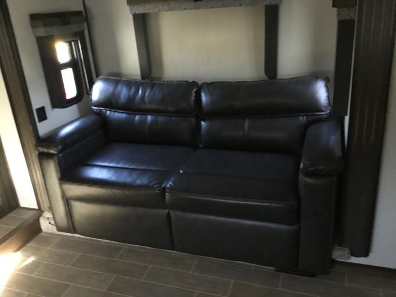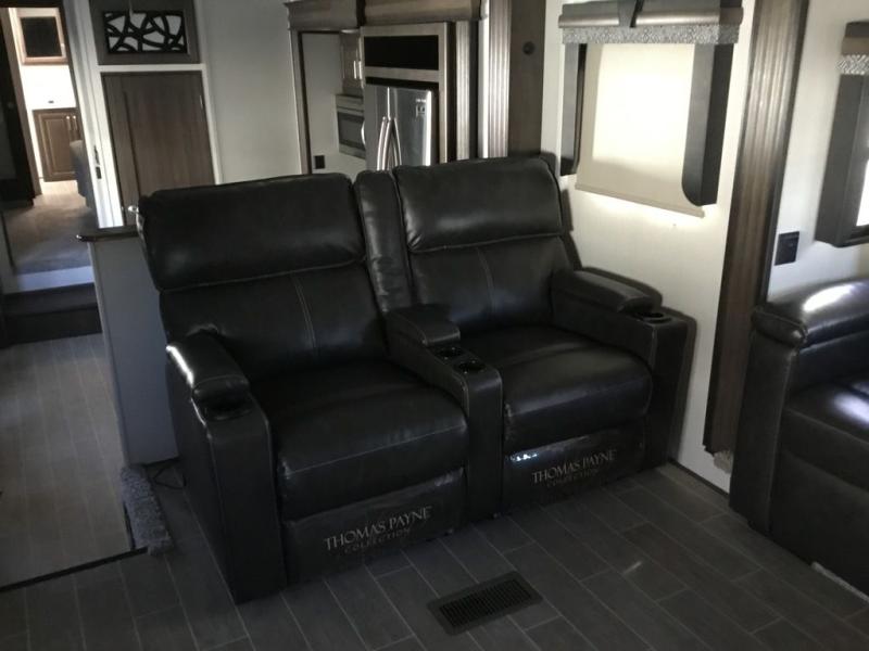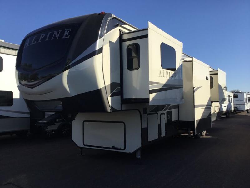 Come see just how fun and easy camping can be with this luxurious five-slide Alpine fifth wheel by Keystone RV. Getting ready for the day is easy with a large master bathroom that has two sinks, plenty of counter space, and a shower with a seat. You'll find the second half bathroom is conveniently located just off of the kitchen for your guests. In the kitchen area, you will find dual opposing slides and all of the amenities you need to fix your favorite meals, such as a convection microwave, and an 18 cubic foot refrigerator or choose the residential option. Step up to the front living room where you will find two tri-fold sofa sleepers, theater seats, a fireplace, and an entertainment center with a 50" LED TV.