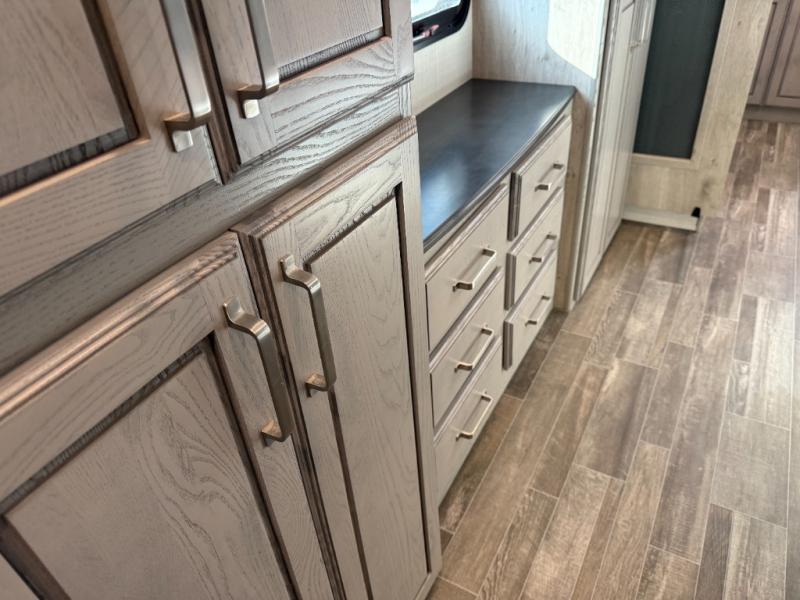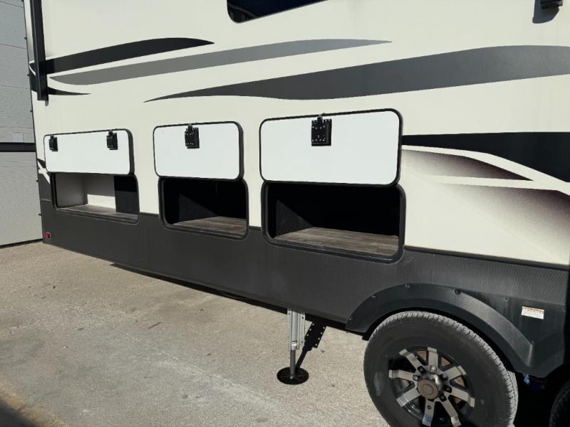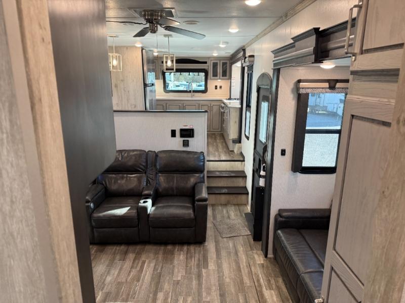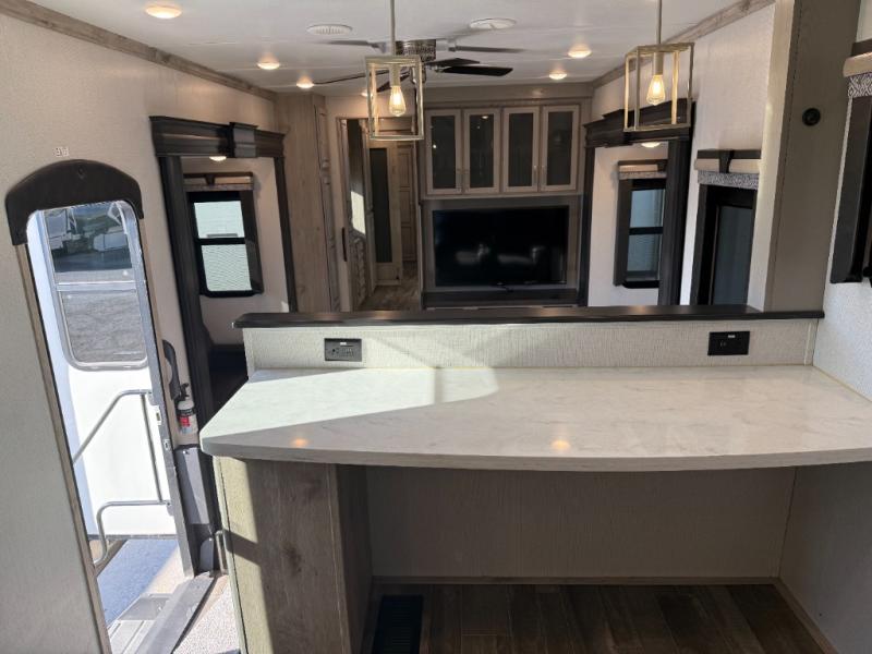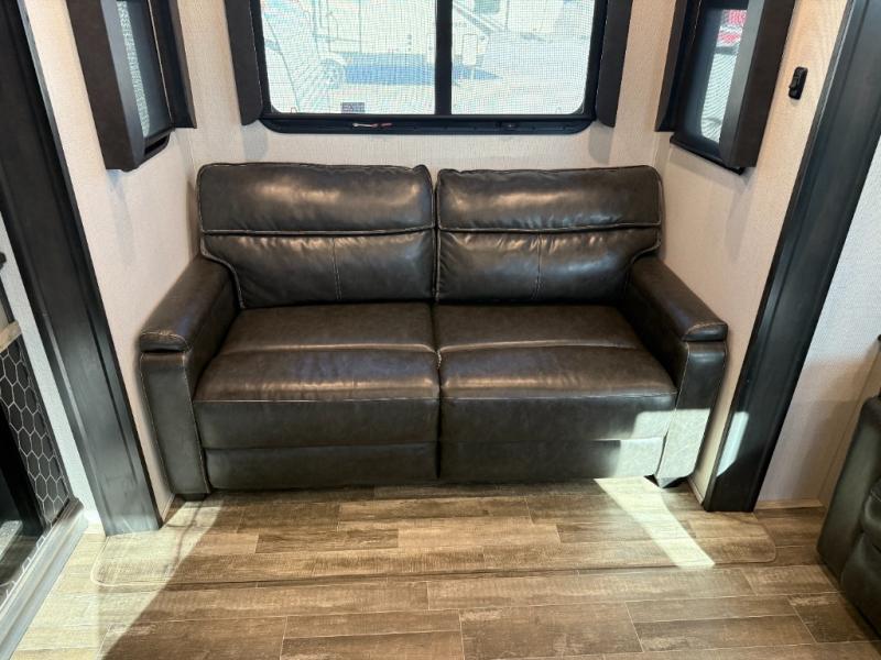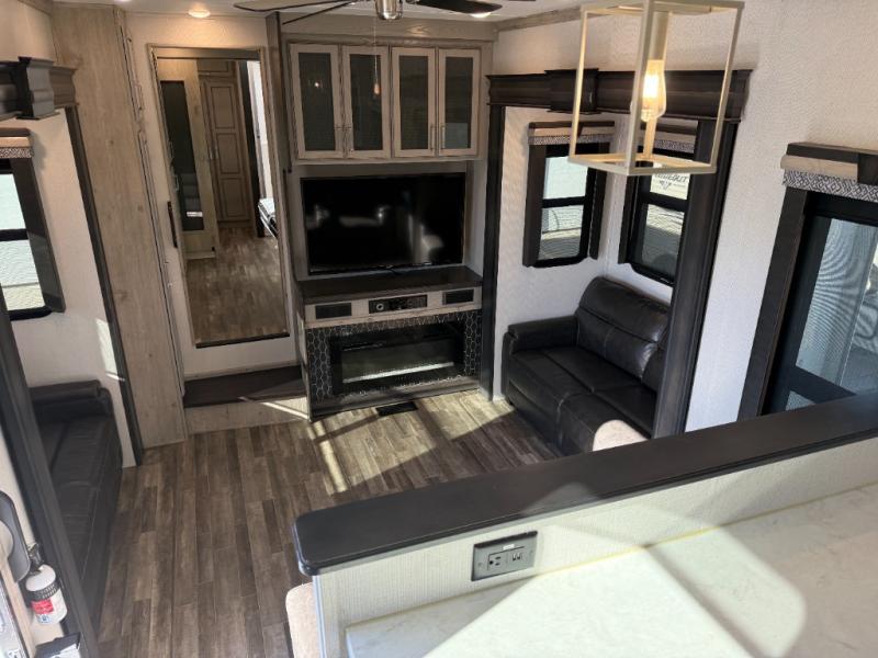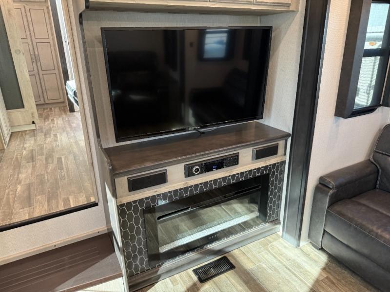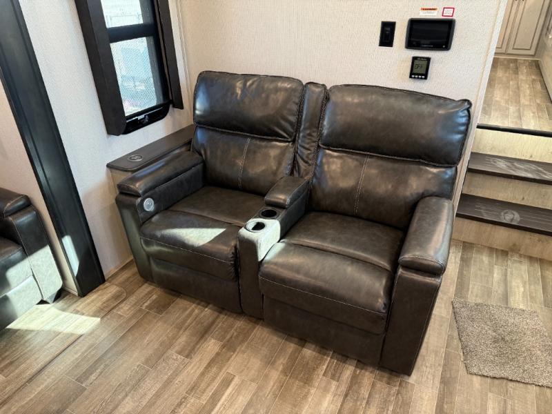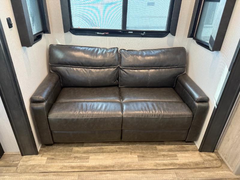 There's something for everyone in this fifth wheel! The chef will love cooking in the front kitchen with the extra counter space and patent-pending windshield, the convection microwave, the large pantry, and the 18 cubic foot refrigerator or choose the residential option, plus there is a breakfast bar that overlooks the middle living area. The living area welcomes you to a relaxing evening by laying on one of the opposing tri-fold sofa sleepers or on the theater seating across from the entertainment center with a fireplace. The walk-through bedroom has a king bed with storage underneath, two wardrobes, and a chest, as well as access to the rear full bathroom. The bathroom features a double sink vanity for two to get ready at once, a large shower, and even a space that is prepped for you to add the optional washer and dryer!