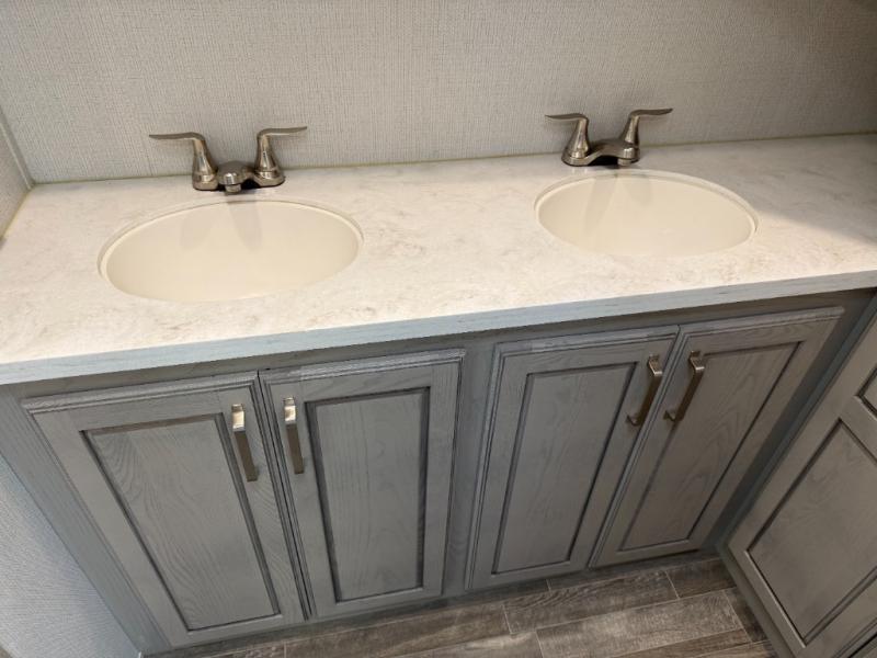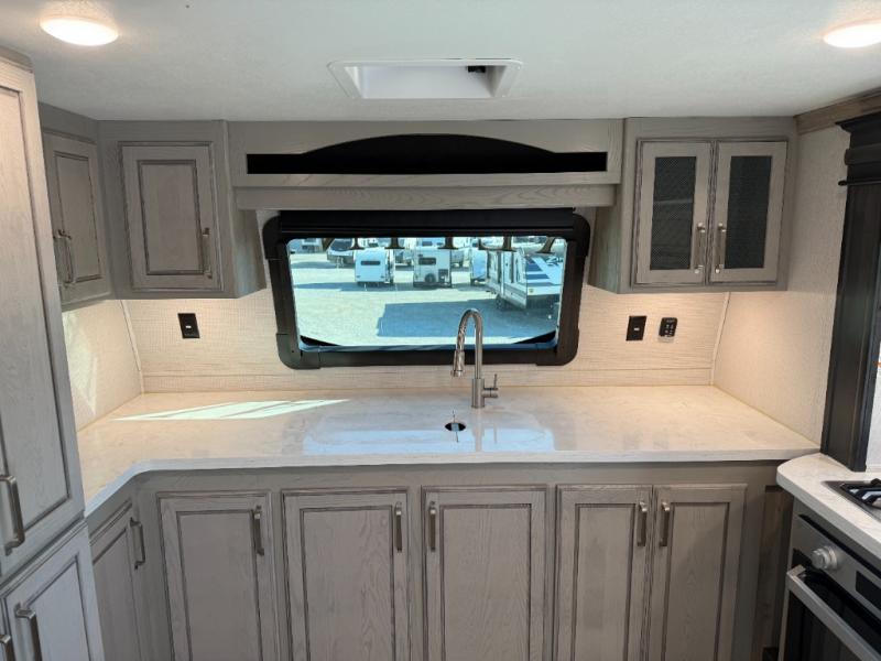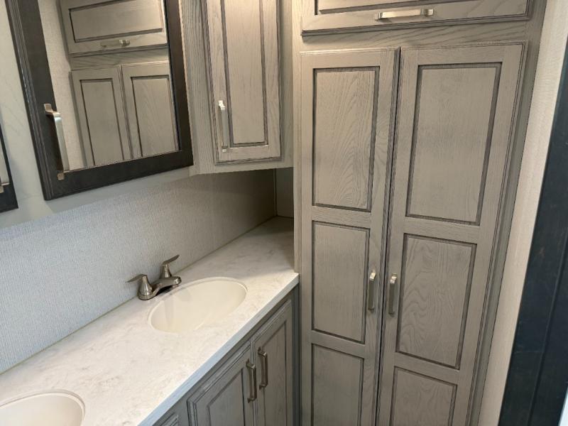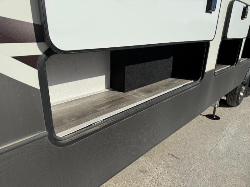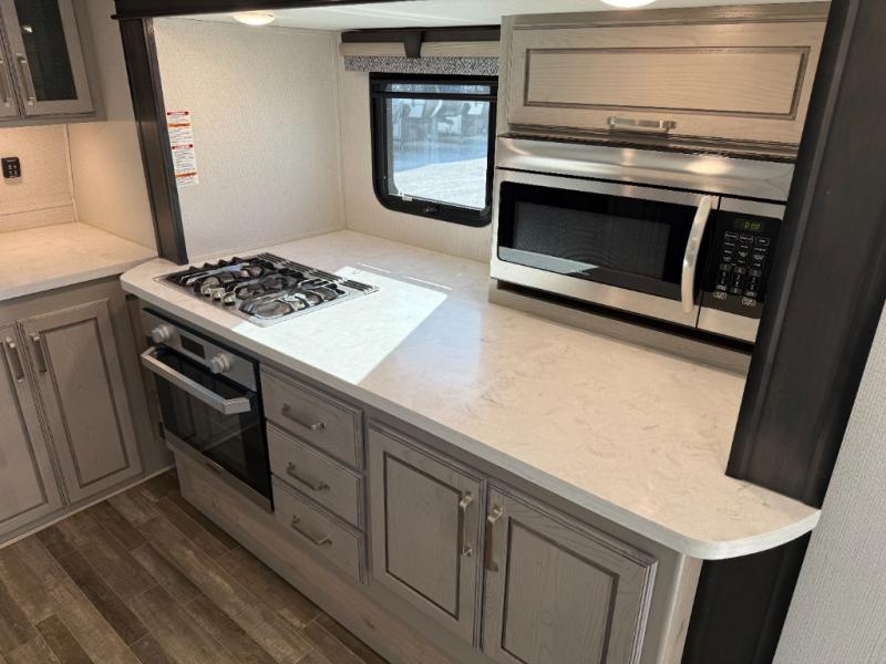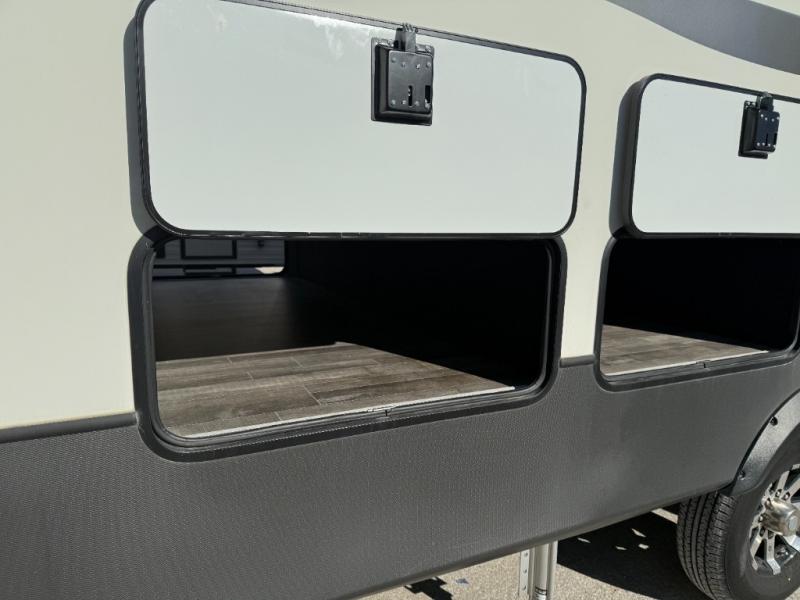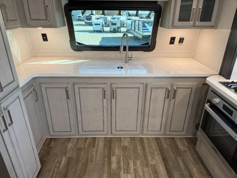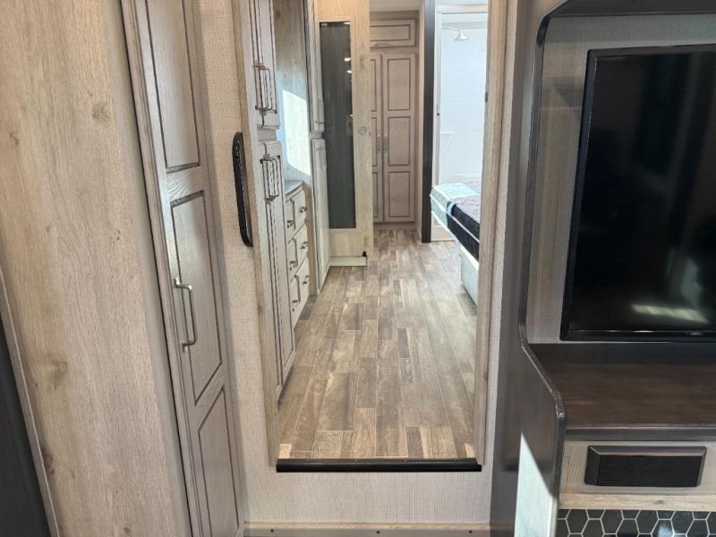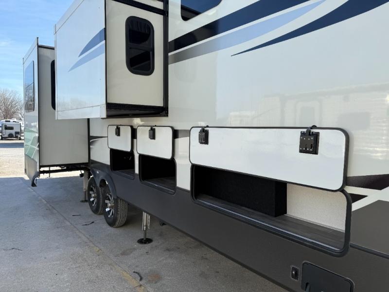 There's something for everyone in this fifth wheel! The chef will love cooking in the front kitchen with the extra counter space and patent-pending windshield, the convection microwave, the large pantry, and the 18 cubic foot refrigerator or choose the residential option, plus there is a breakfast bar that overlooks the middle living area. The living area welcomes you to a relaxing evening by laying on one of the opposing tri-fold sofa sleepers or on the theater seating across from the entertainment center with a fireplace. The walk-through bedroom has a king bed with storage underneath, two wardrobes, and a chest, as well as access to the rear full bathroom. The bathroom features a double sink vanity for two to get ready at once, a large shower, and even a space that is prepped for you to add the optional washer and dryer!