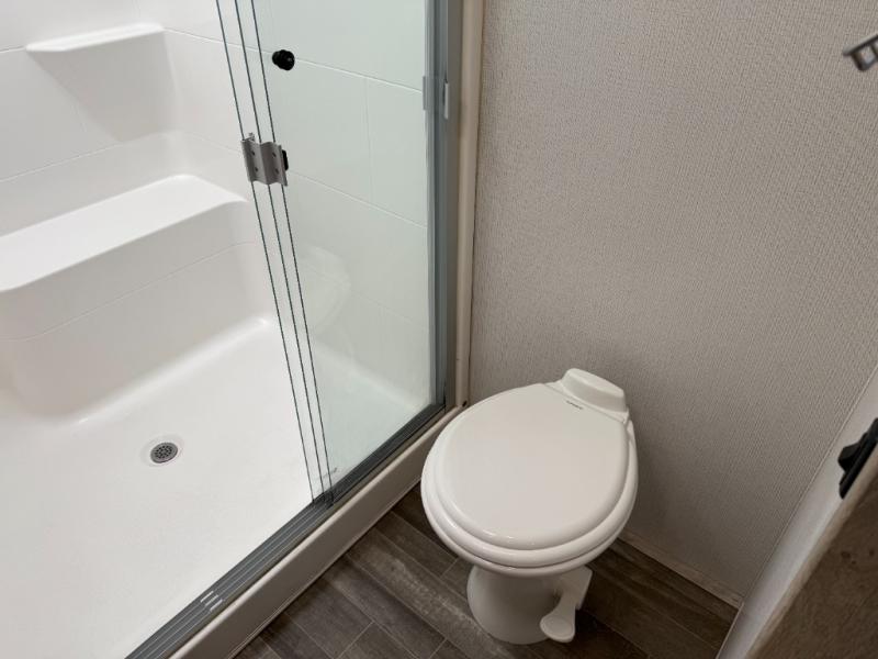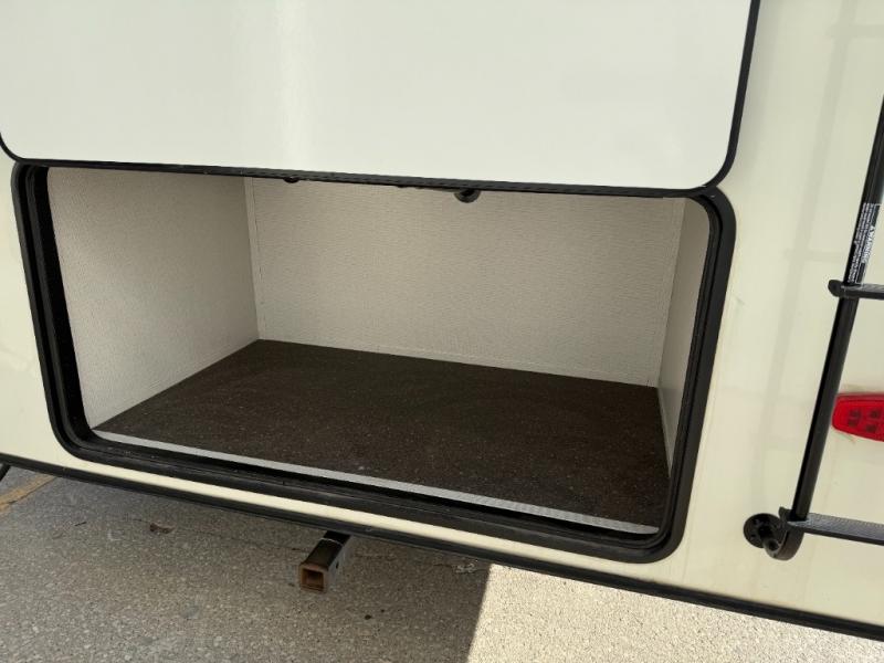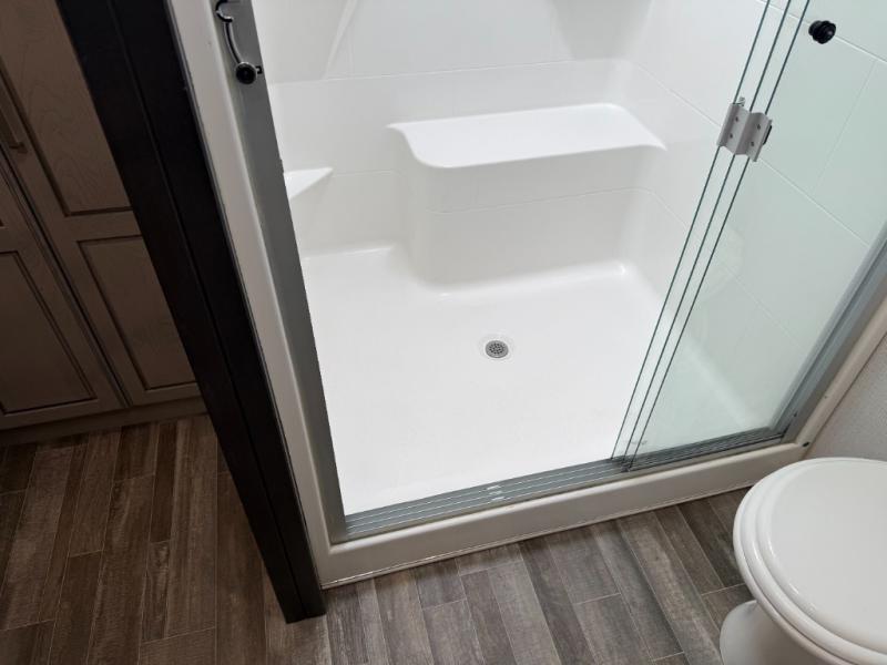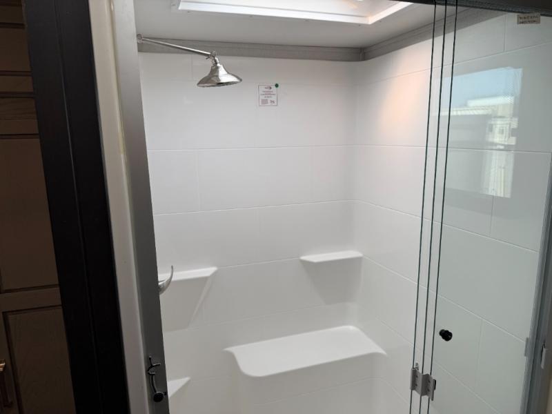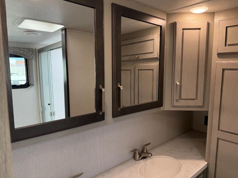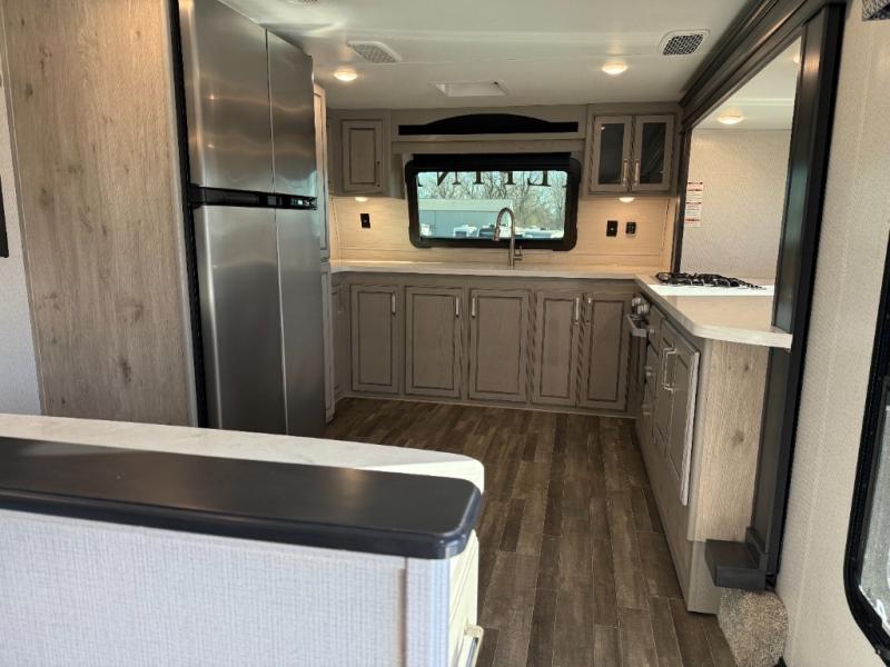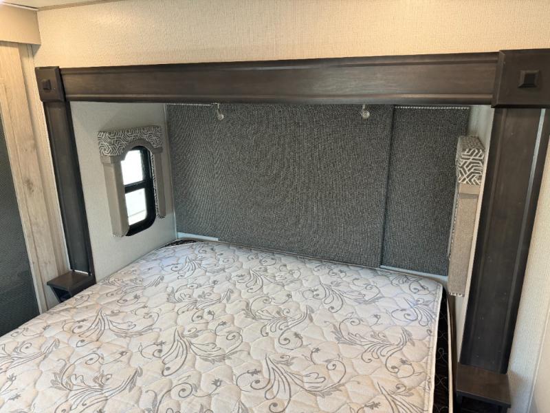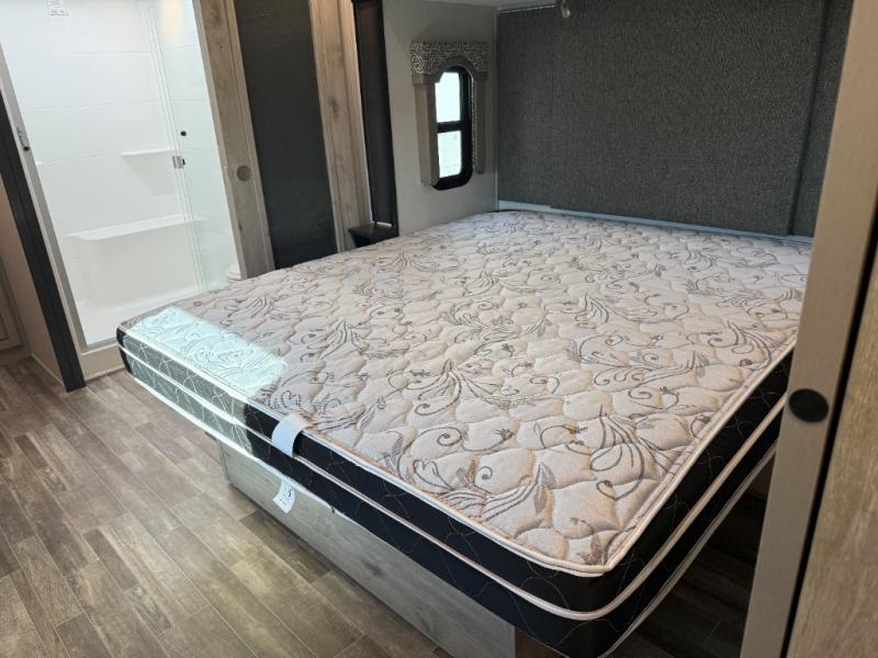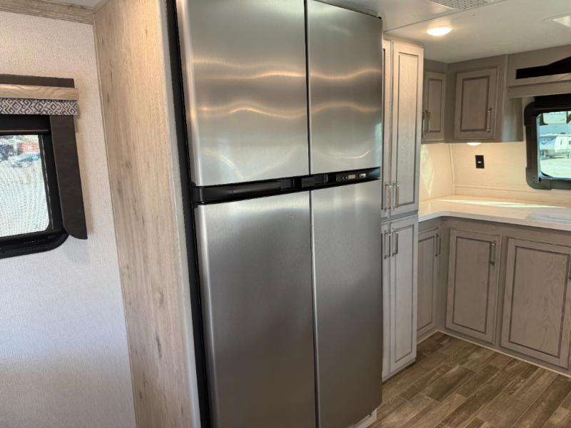 There's something for everyone in this fifth wheel! The chef will love cooking in the front kitchen with the extra counter space and patent-pending windshield, the convection microwave, the large pantry, and the 18 cubic foot refrigerator or choose the residential option, plus there is a breakfast bar that overlooks the middle living area. The living area welcomes you to a relaxing evening by laying on one of the opposing tri-fold sofa sleepers or on the theater seating across from the entertainment center with a fireplace. The walk-through bedroom has a king bed with storage underneath, two wardrobes, and a chest, as well as access to the rear full bathroom. The bathroom features a double sink vanity for two to get ready at once, a large shower, and even a space that is prepped for you to add the optional washer and dryer!