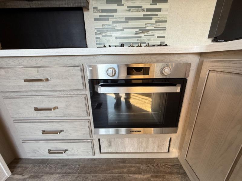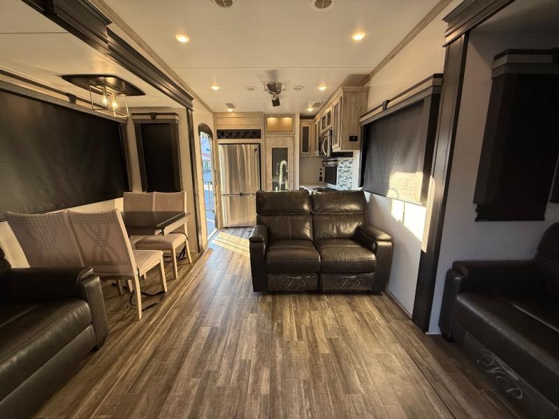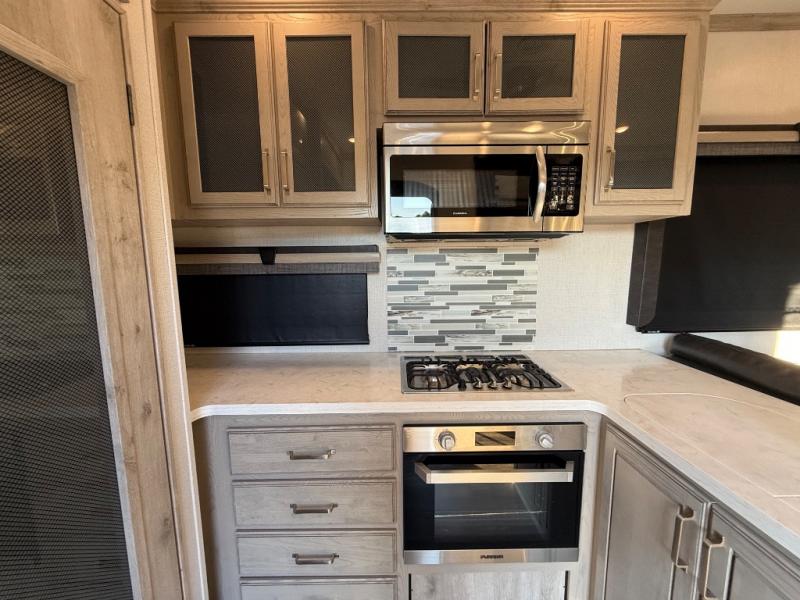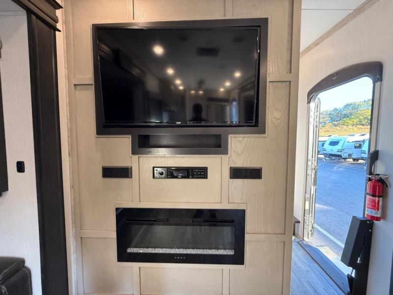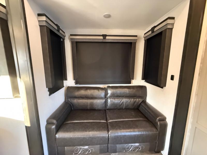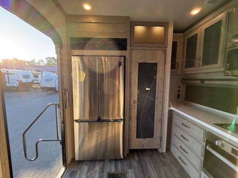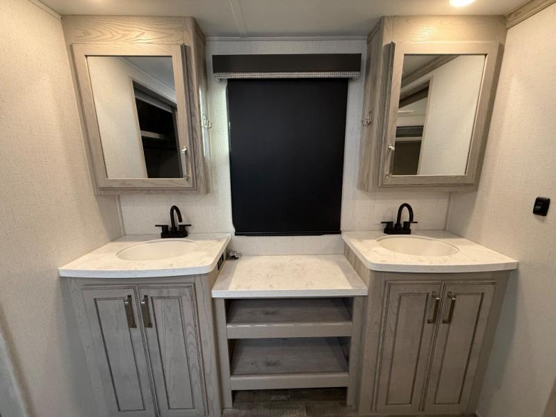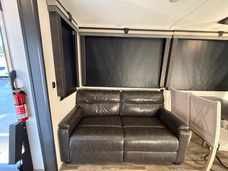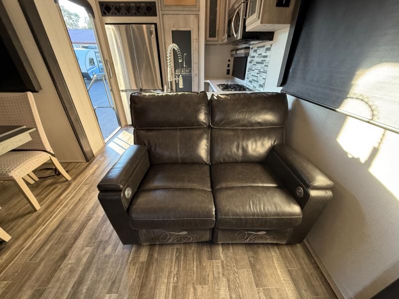 This is the perfect couples RV that has a chef in the family! The rear kitchen offers everything from an 18 cu. ft. gas/electric refrigerator or choose the residential option, a large pantry, and lots of counter space with full amenities to make a thanksgiving meal. The second exterior entry in the kitchen allows you to take food outside to enjoy under one of the two electric awnings without having to walk very far. The chef will even have good sightlines into the separate living area to watch the 50" LED TV and visit with any guests sitting on the tri-fold sofa sleeper slides or the theater seats. You can also dine inside at the free standing dinette. The half bath is conveniently located near the main entry and includes a space prepped for a washer/dryer option, and your front full bathroom is complete with dual sinks and a walk-in wardrobe. And don't forget about sleeping like a king in the master suite!