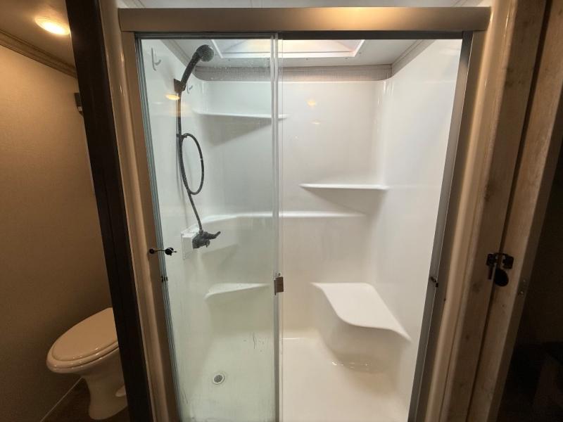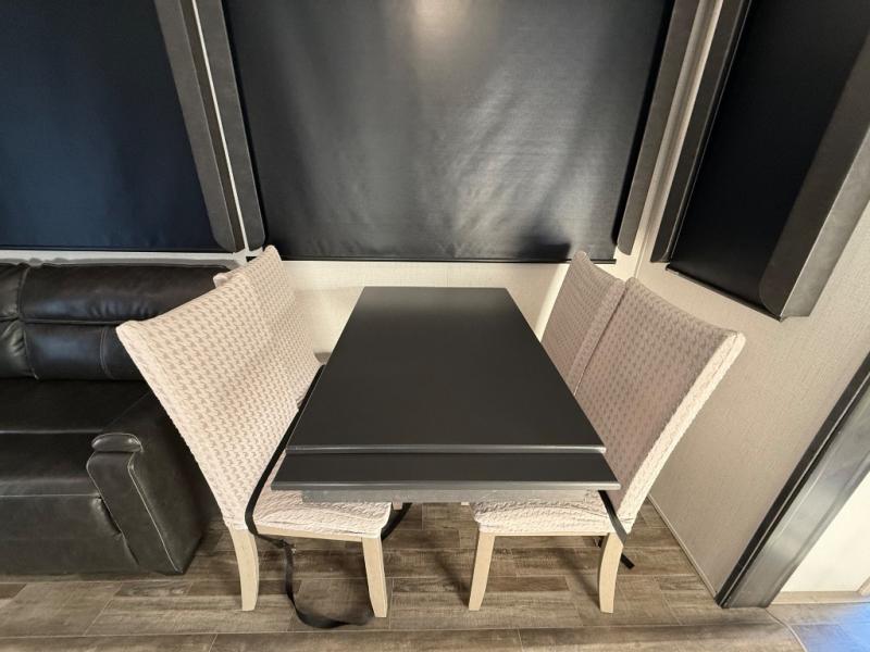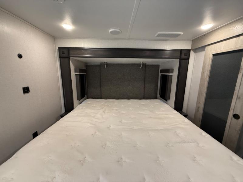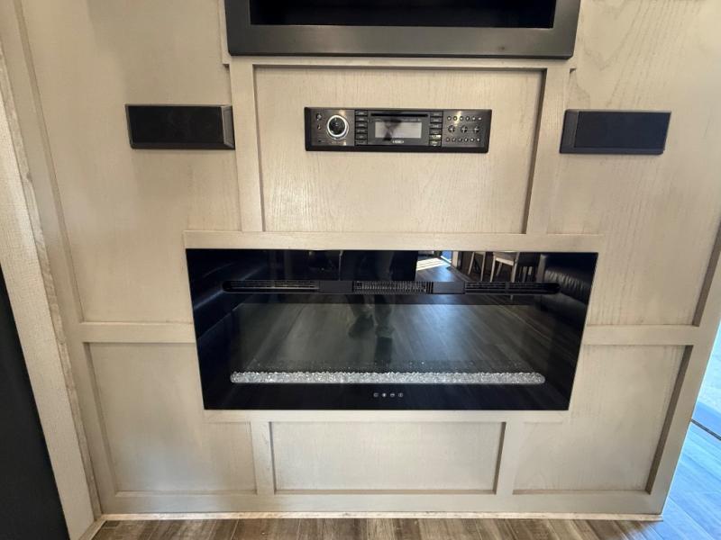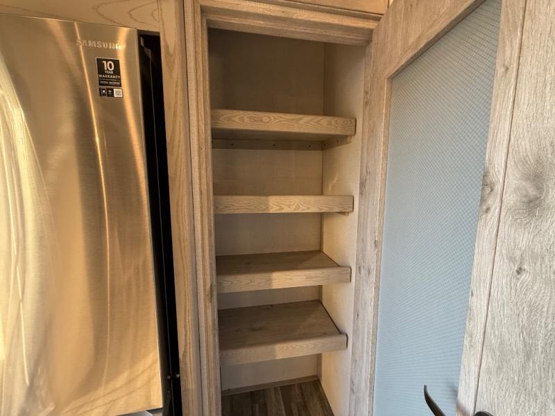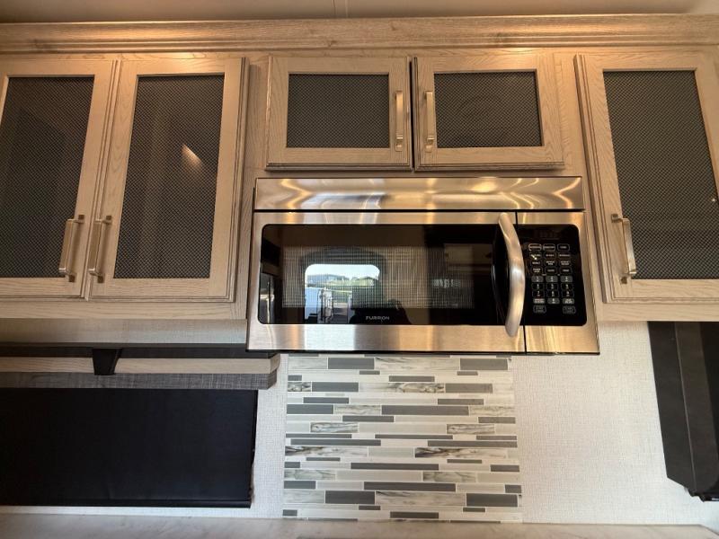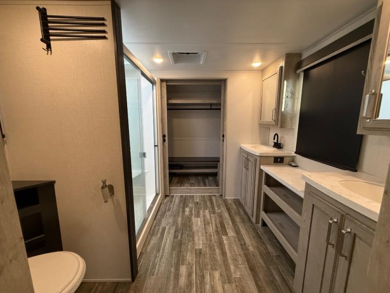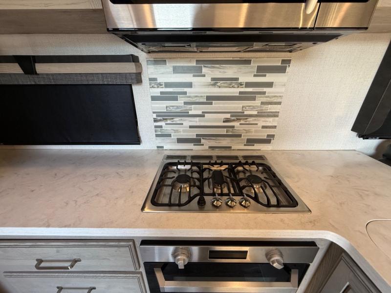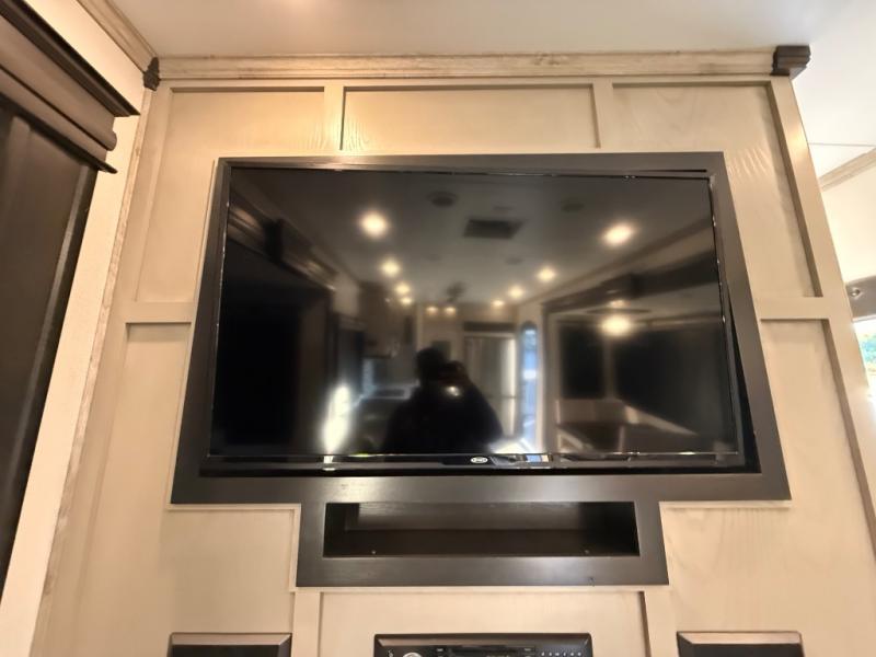 This is the perfect couples RV that has a chef in the family! The rear kitchen offers everything from an 18 cu. ft. gas/electric refrigerator or choose the residential option, a large pantry, and lots of counter space with full amenities to make a thanksgiving meal. The second exterior entry in the kitchen allows you to take food outside to enjoy under one of the two electric awnings without having to walk very far. The chef will even have good sightlines into the separate living area to watch the 50" LED TV and visit with any guests sitting on the tri-fold sofa sleeper slides or the theater seats. You can also dine inside at the free standing dinette. The half bath is conveniently located near the main entry and includes a space prepped for a washer/dryer option, and your front full bathroom is complete with dual sinks and a walk-in wardrobe. And don't forget about sleeping like a king in the master suite!
