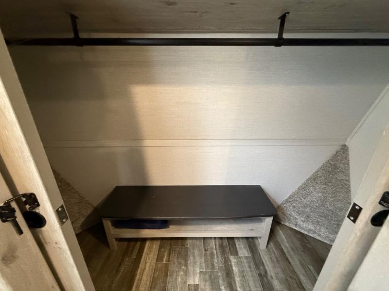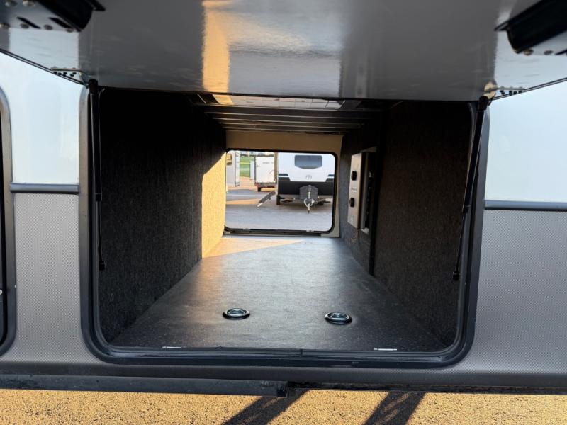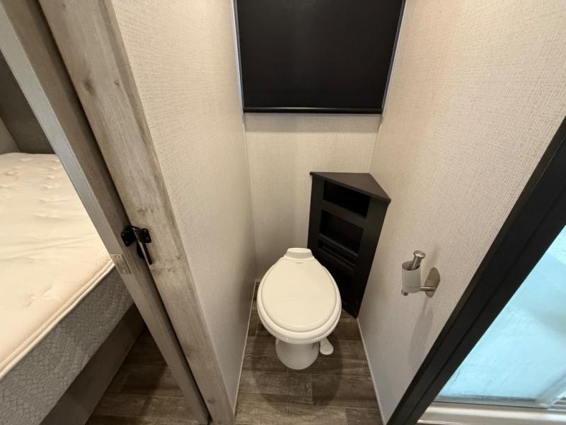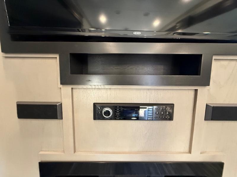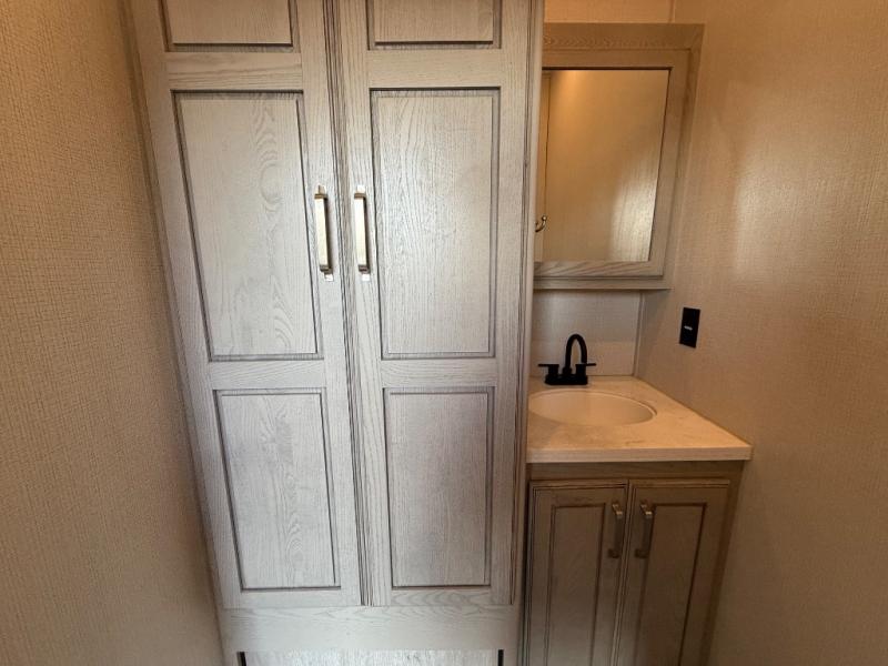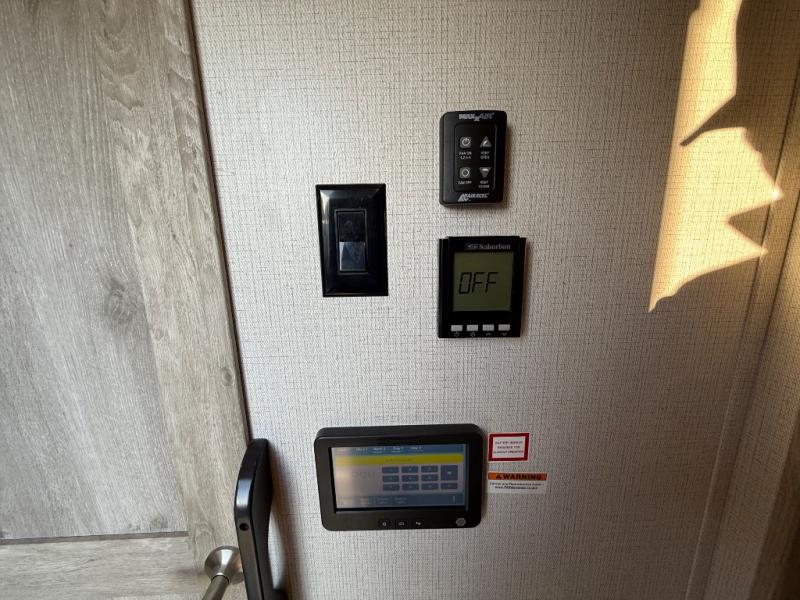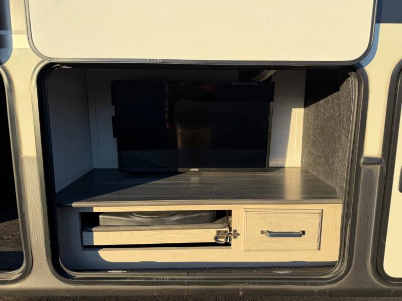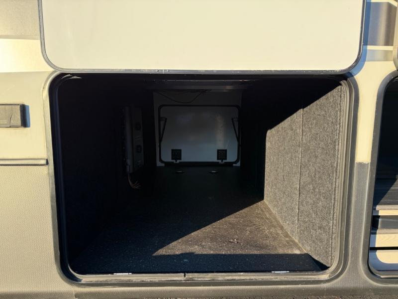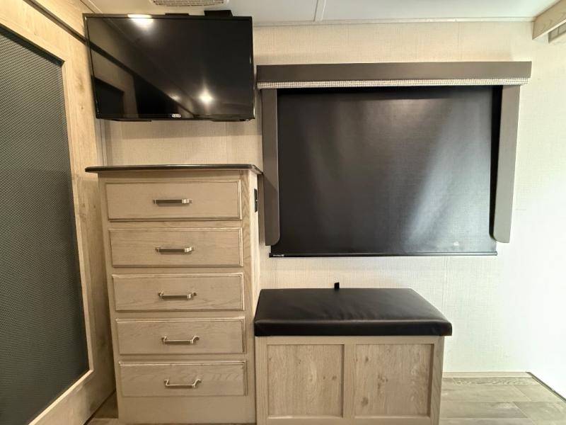 This is the perfect couples RV that has a chef in the family! The rear kitchen offers everything from an 18 cu. ft. gas/electric refrigerator or choose the residential option, a large pantry, and lots of counter space with full amenities to make a thanksgiving meal. The second exterior entry in the kitchen allows you to take food outside to enjoy under one of the two electric awnings without having to walk very far. The chef will even have good sightlines into the separate living area to watch the 50" LED TV and visit with any guests sitting on the tri-fold sofa sleeper slides or the theater seats. You can also dine inside at the free standing dinette. The half bath is conveniently located near the main entry and includes a space prepped for a washer/dryer option, and your front full bathroom is complete with dual sinks and a walk-in wardrobe. And don't forget about sleeping like a king in the master suite!