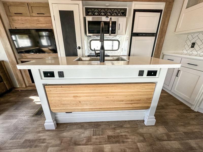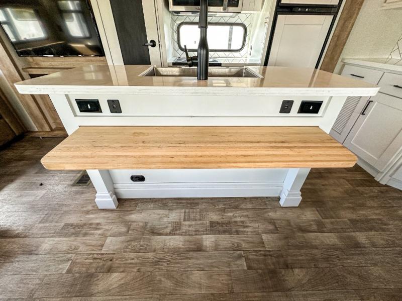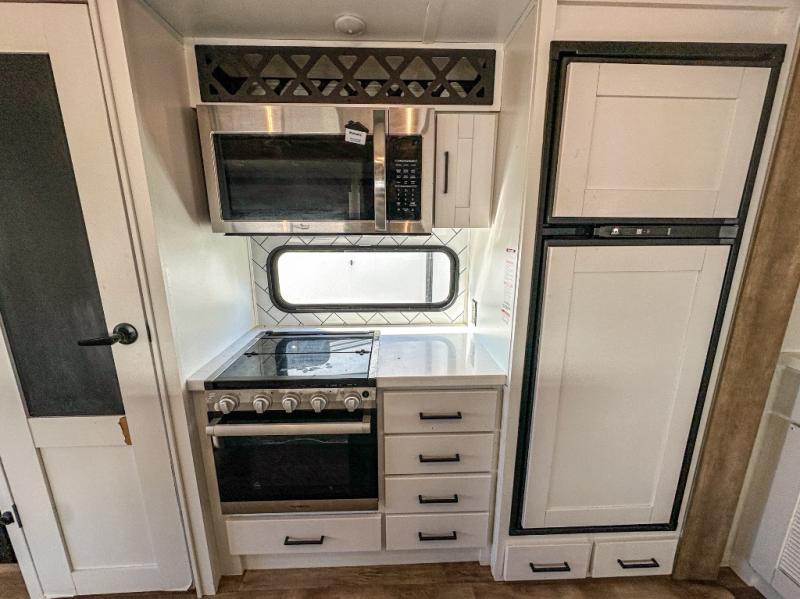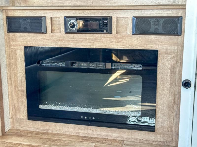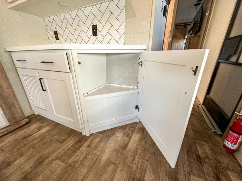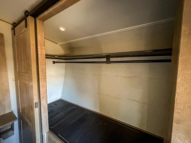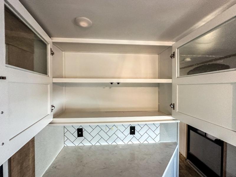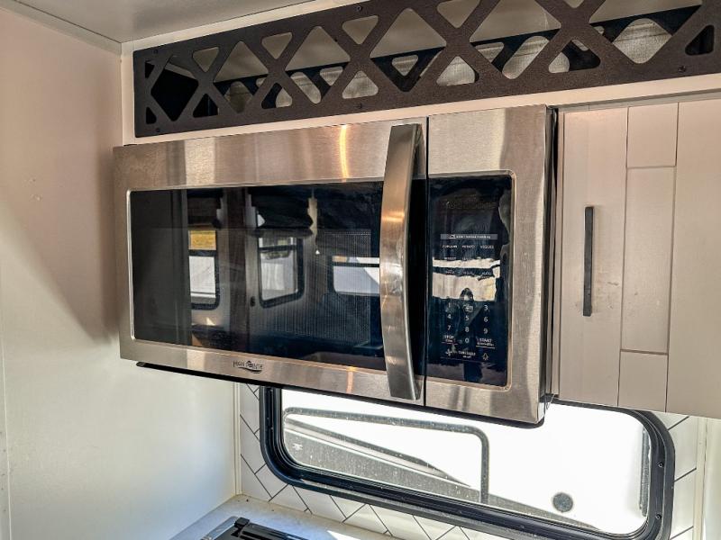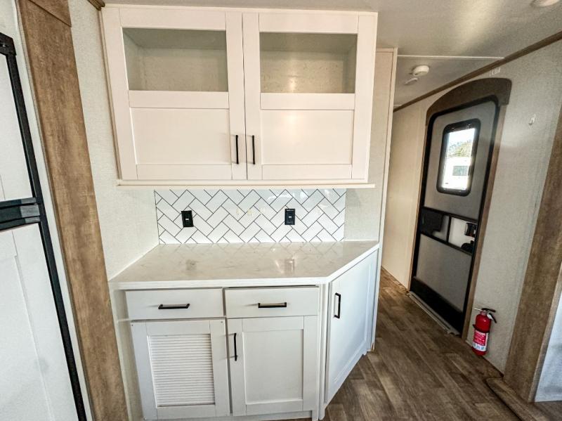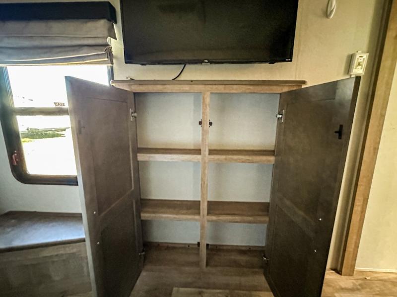 You are going to get so much use out of this Arcadia travel trailer! Whether it's a guy's trip to ride dirt bikes, a family trip to the mountains, or a girl's weekend of coffee and s'mores, this trailer will accommodate. The front private bedroom has a California king bed sitting on a slide out so that you have more space to sit down on the bench seat and put on your clothes. There is also some under-bed storage and a full-width closet with wrap-around shelving for storing your belongings, and the TV sits across from the bed for nighttime viewing. You'll be able to sit down with friends at the free-standing table with chairs in the main living area to play a game or chat, and there is also a wine rack above the microwave so that you can grab a drink whenever you like.