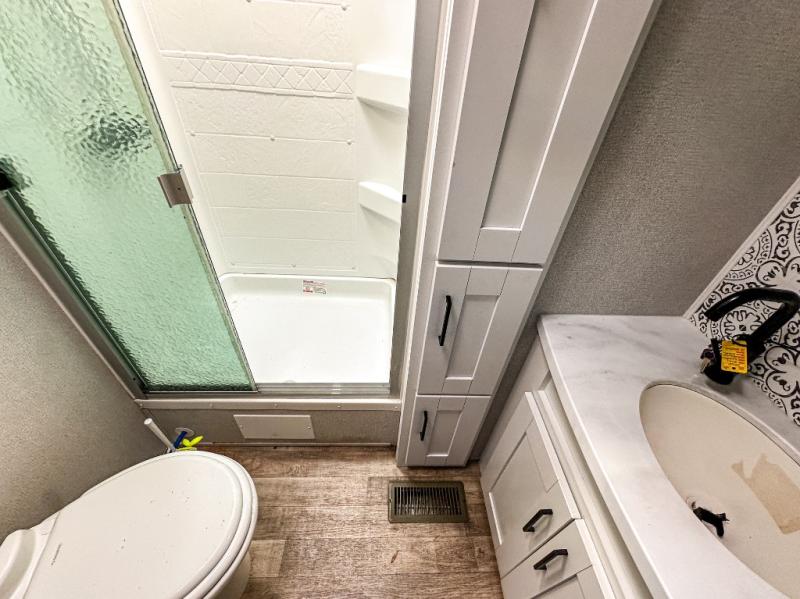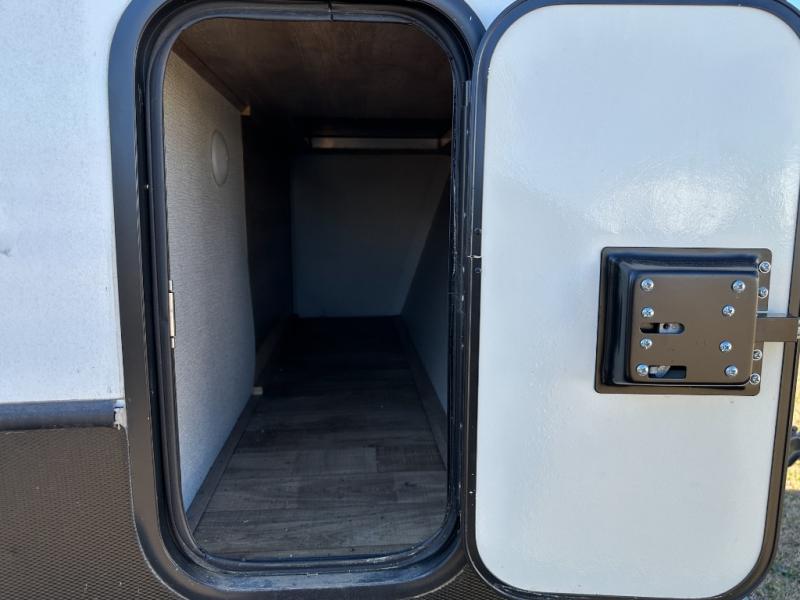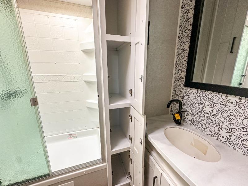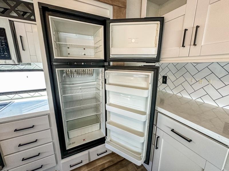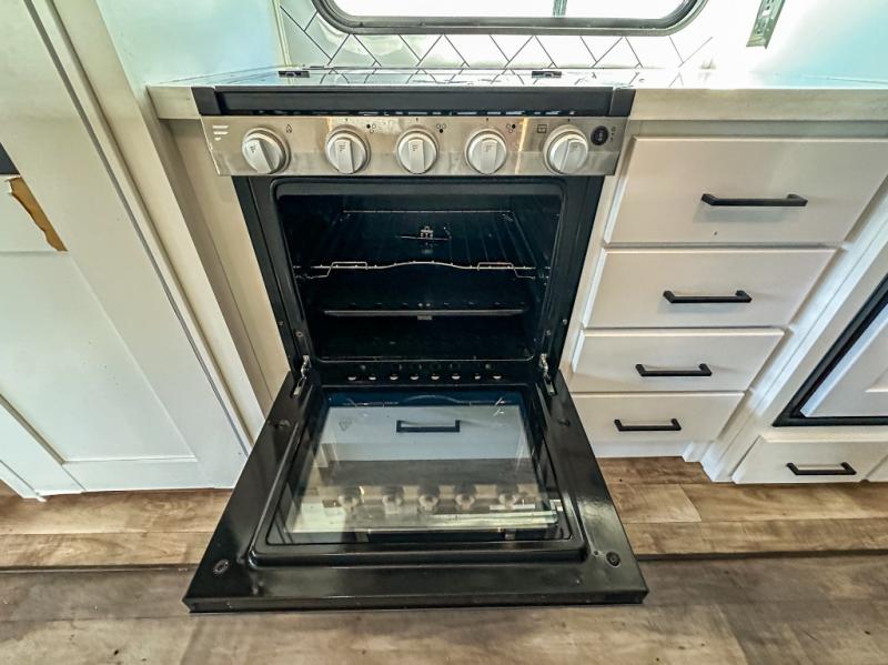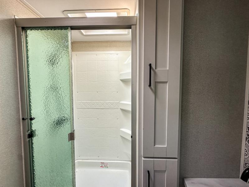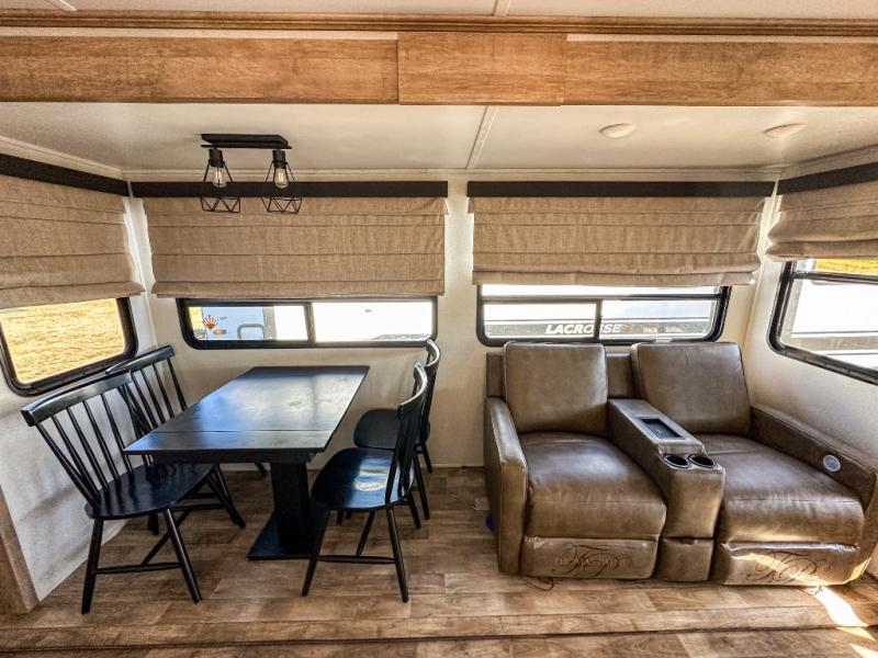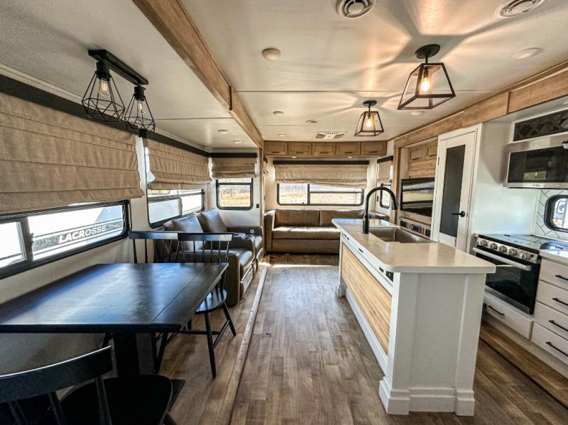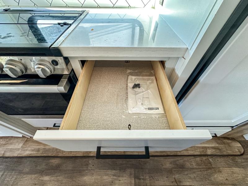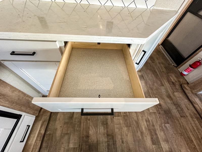You are going to get so much use out of this Arcadia travel trailer! Whether it's a guy's trip to ride dirt bikes, a family trip to the mountains, or a girl's weekend of coffee and s'mores, this trailer will accommodate. The front private bedroom has a California king bed sitting on a slide out so that you have more space to sit down on the bench seat and put on your clothes. There is also some under-bed storage and a full-width closet with wrap-around shelving for storing your belongings, and the TV sits across from the bed for nighttime viewing. You'll be able to sit down with friends at the free-standing table with chairs in the main living area to play a game or chat, and there is also a wine rack above the microwave so that you can grab a drink whenever you like.