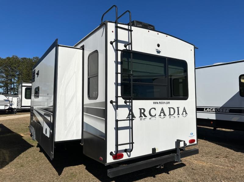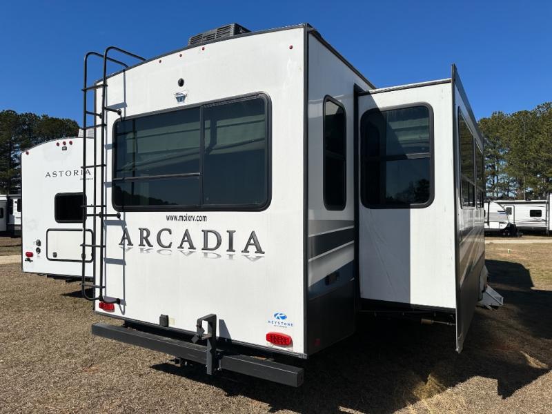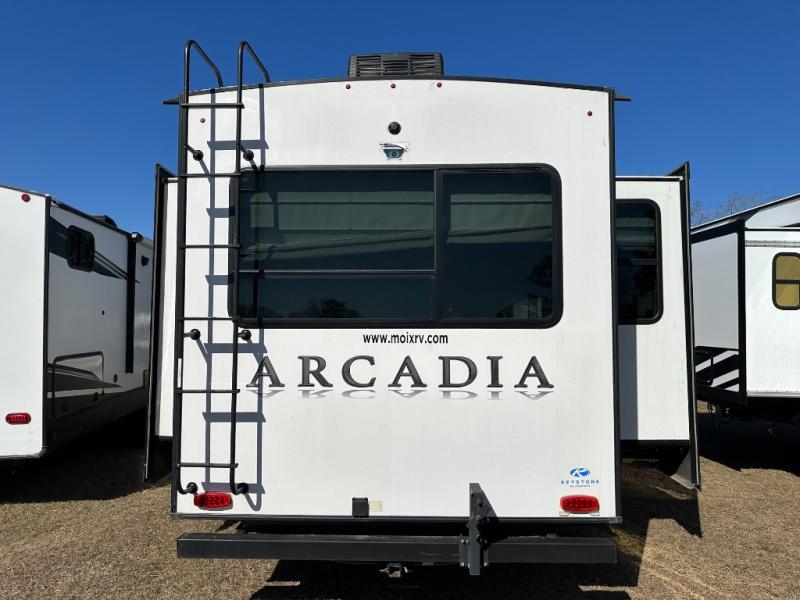 The Keystone Arcadia is a premium brand of fifth wheels and travel trailers that offers you a deluxe assortment of features! Some of these features are exclusive to Keystone, like the HyperDeck RV floor, the residential in-floor heating ducts, the 12V color-coded wiring, and the preparations for 4G LTE and Wi-Fi. Some of the other aspects of the Arcadia that you'll fall in love with are the designer vinyl flooring, flush-floor slides, fireplace with remote, and the Peak Seasonal Camping Package. The Arcadia has been constructed with a Next-Generation Crawlspace chassis, Curt equalized suspension, a Ground Control™ 3.0 auto-leveling system, and a Trunk™ pass-through storage with large clutter-free capacity.