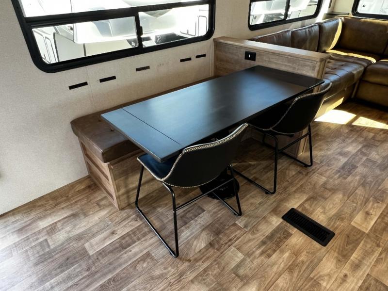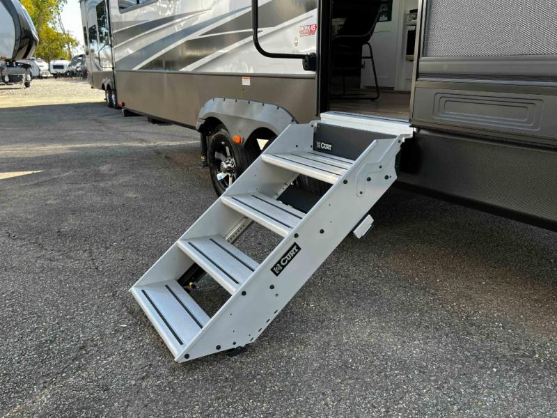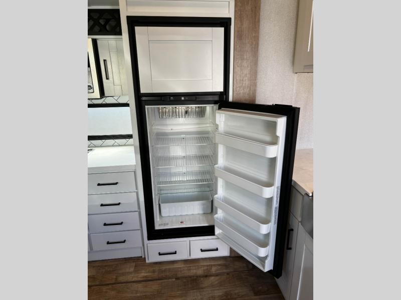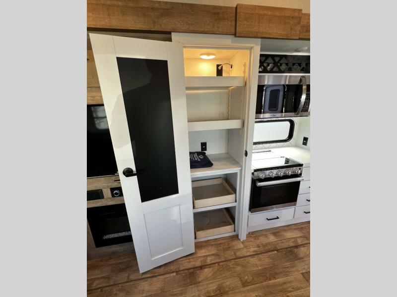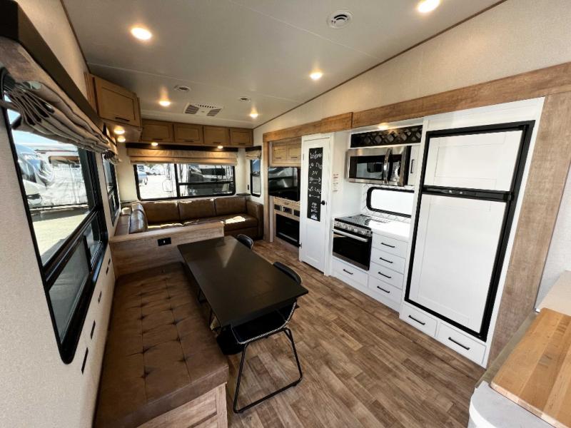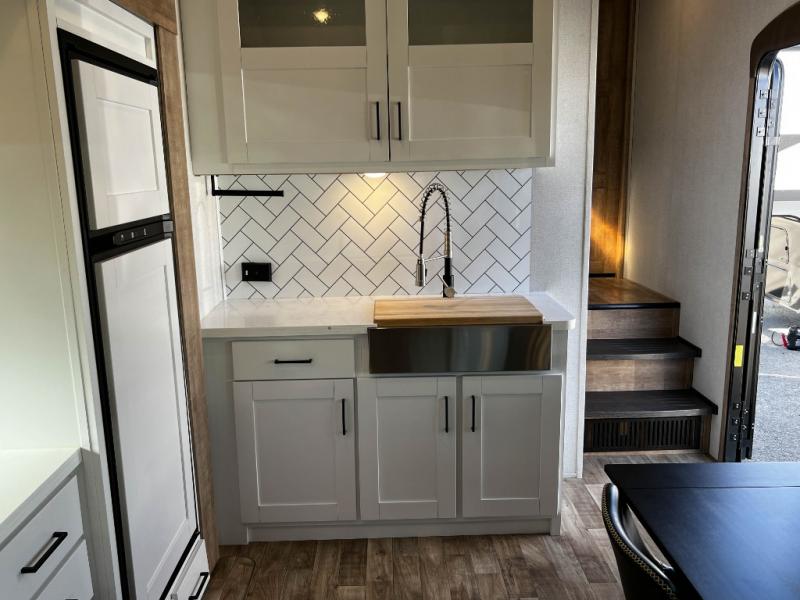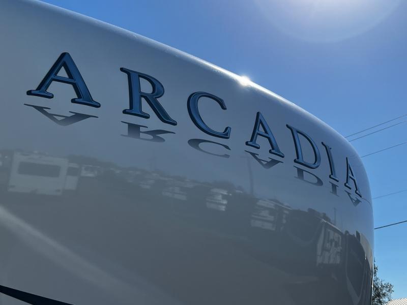 The Keystone Arcadia Half-Ton fifth wheel is stunning, bright, and residential, allowing you to enjoy the inside as much as the outdoors! The classy interior has a chic and trendy vibe with its modern styling, and offers designer vinyl flooring throughout for style and easy care, residential, adjustable hidden hinges on kitchen cabinet doors, and a wine rack above the microwave to mention a few more highlights. The exterior construction is quality at its very core with the Next Generation Crawlspace chassis, the SpaceSaver upper deck chassis design, the Curt rubberized equalization suspension system, the Max Turn Technology front cap design for improved turning radius and the Ground Control 3.0 auto-leveling system for easier setup.