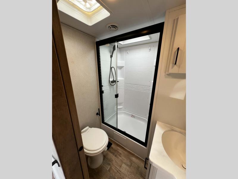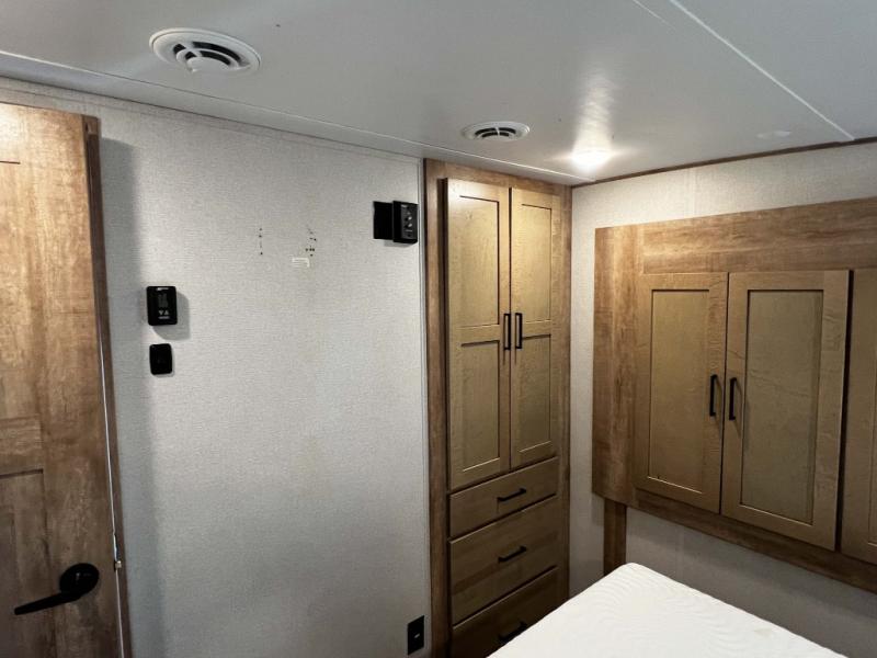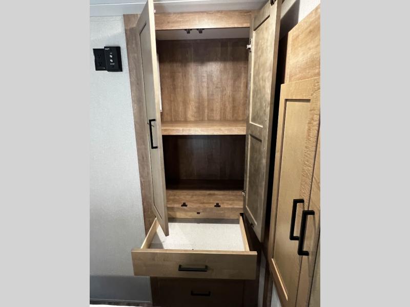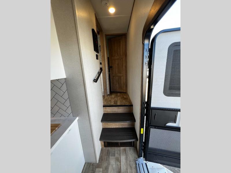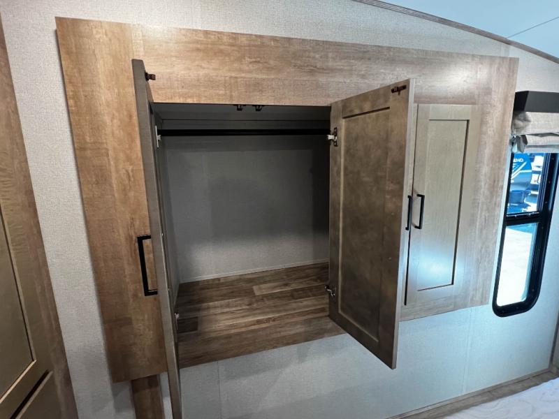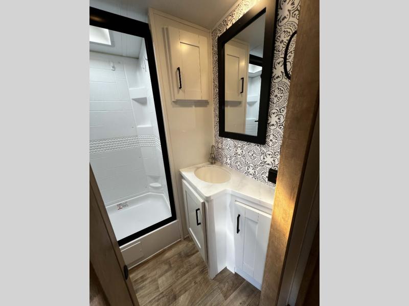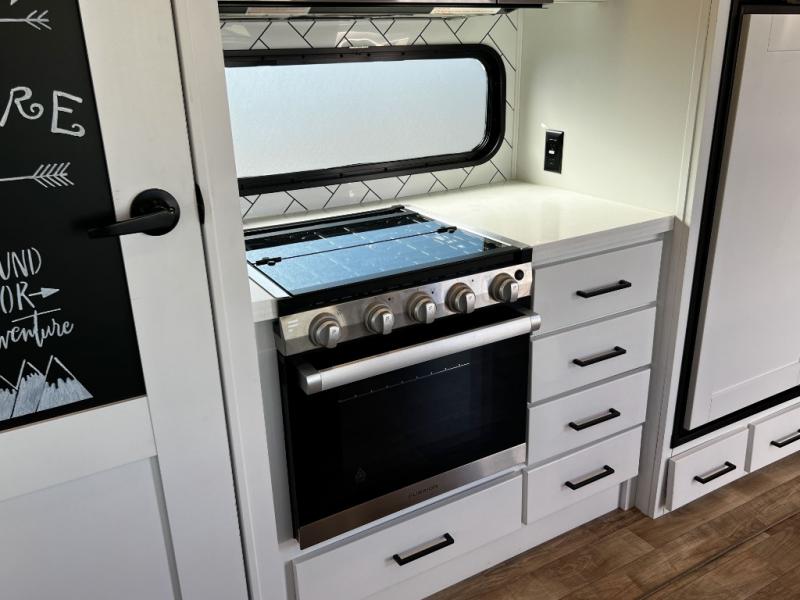 The Keystone Arcadia Half-Ton fifth wheel is stunning, bright, and residential, allowing you to enjoy the inside as much as the outdoors! The classy interior has a chic and trendy vibe with its modern styling, and offers designer vinyl flooring throughout for style and easy care, residential, adjustable hidden hinges on kitchen cabinet doors, and a wine rack above the microwave to mention a few more highlights. The exterior construction is quality at its very core with the Next Generation Crawlspace chassis, the SpaceSaver upper deck chassis design, the Curt rubberized equalization suspension system, the Max Turn Technology front cap design for improved turning radius and the Ground Control 3.0 auto-leveling system for easier setup.