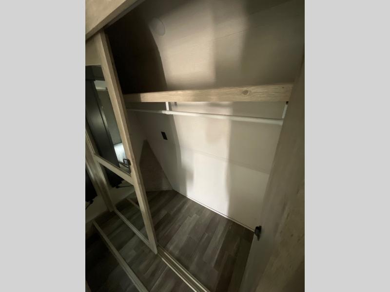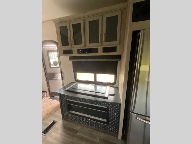 Looking for a spacious rear kitchen with everything you need to make meals, dine at the legless dinette table with storage and four high-back dinette chairs with storage, and enjoy a cozy evening inside with the designer fireplace? Look no further! This perfect couples fifth wheel offers just that plus a hutch for more storage and a place to display your family photos, a pop-up 50" LED TV to watch, and a double entry bathroom for convenience. You will find storage under the king bed slide out, and within the master closet, the chest, and there is a place for a stackable washer/dyer if you decide to add that option. You might like to choose the residential refrigerator option as well.