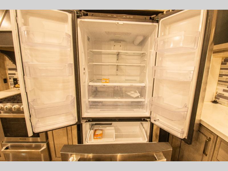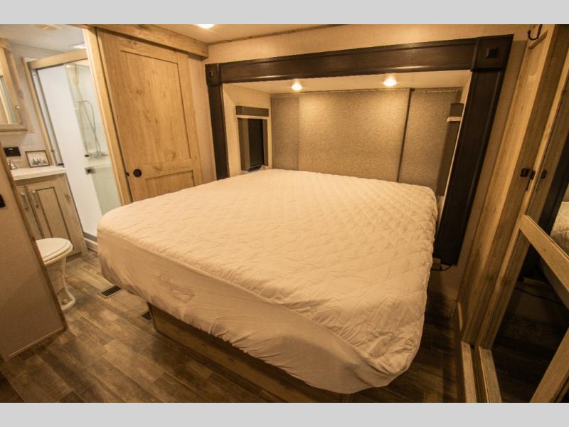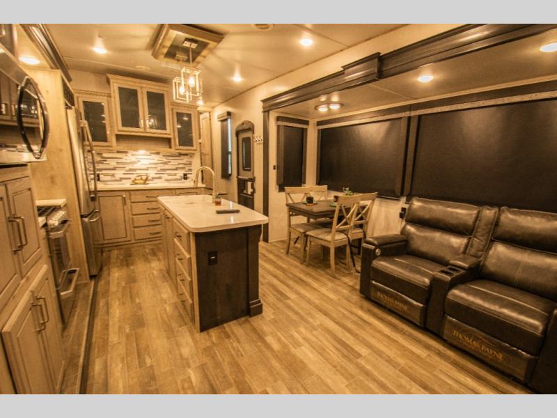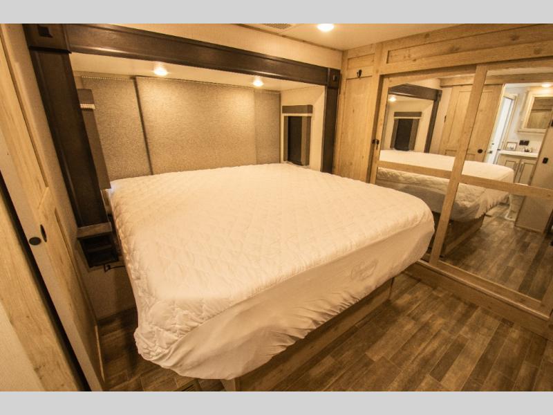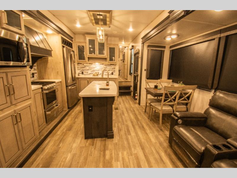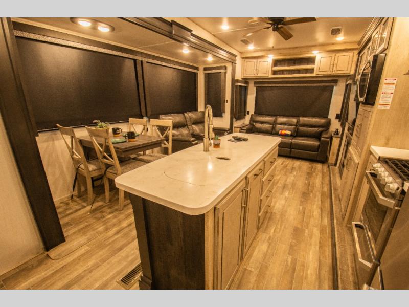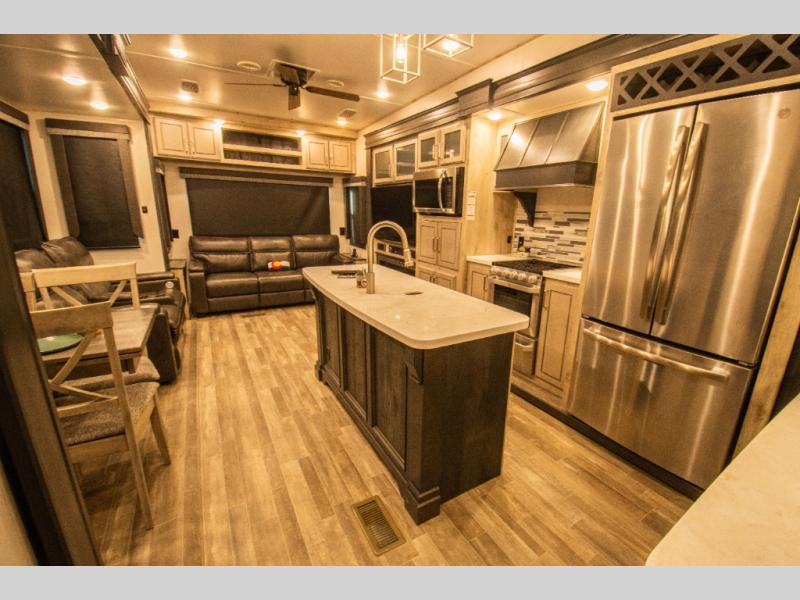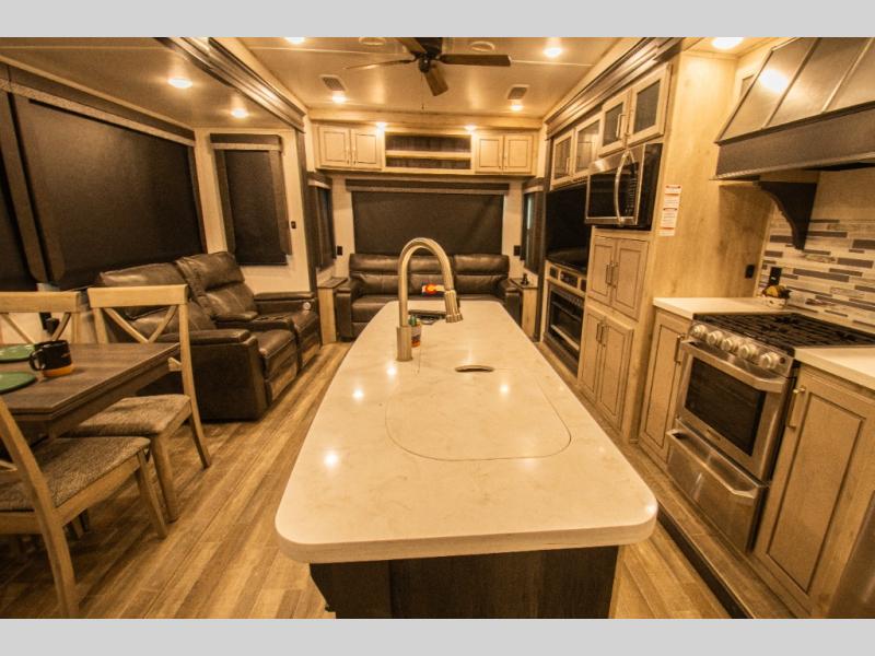 You and your family of four will love the spacious rear living area and mid-kitchen with dual opposing slides, a hide-a-bed sofa sleeper, theater seating for movie night, and a free standing dinette for meal time and game night. The kitchen island offers extra counter space to prepare and serve snacks as well as wash the dishes, and the hutch gives you more storage and a place to set your keys and cellphone. You might like to upgrade your 18 cu. ft. refrigerator to a residential refrigerator, just choose that option! Relax outside under one of the two awnings, and the LCl SolidStep entry gives you a secure way to enter and exit the fifth wheel. The master bedroom is spacious as well with the third slide out, and the master closet, chest, bench and storage under the king bed will allow you to travel with everything you need.