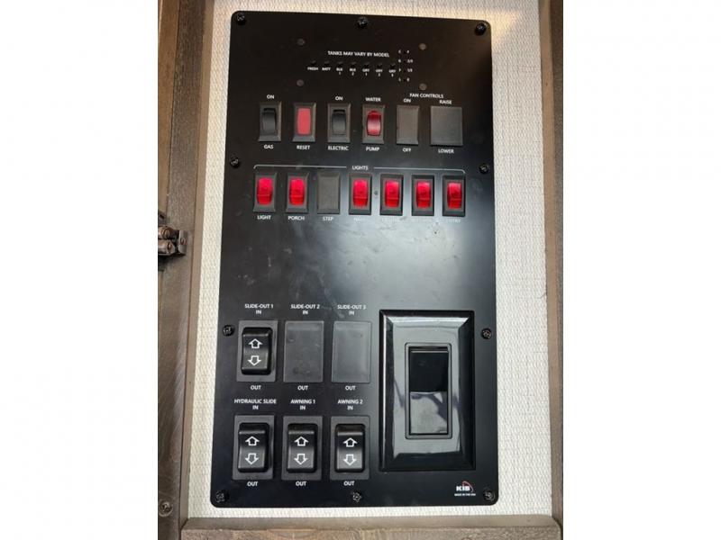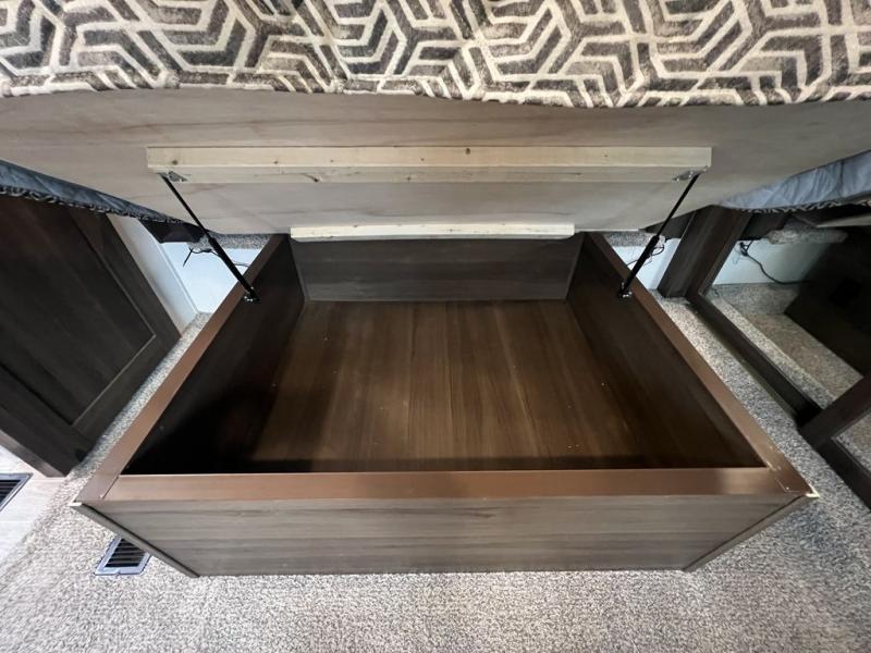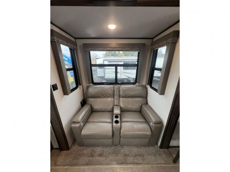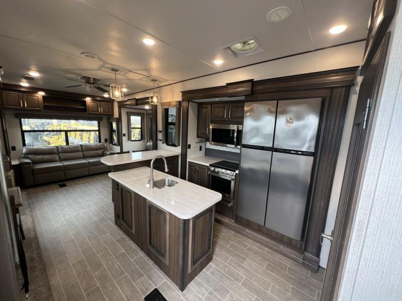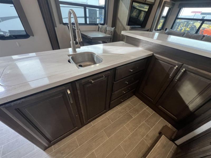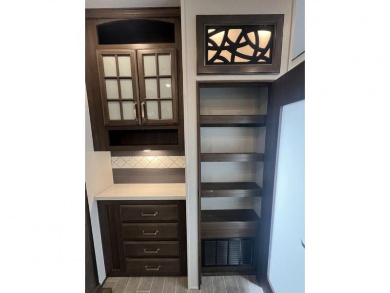 This grand kitchen offers the cook their own space to prepare and serve meals from the large L-shaped counter peninsula bar with stools, and the large pantry and curio will come in handy as well. Dining is also available at the free standing dinette with four chairs and some might even enjoy sitting on the hide-a-bed sofa sleeper, and theater seats that are equipped with heat, massage, LED lights and USB charging. The master bedroom offers a king bed with storage underneath and lots of storage plus a space prepped for a washer/dryer option. Having a separate living area from the kitchen gives everyone their space and outside there are two power awnings offering an outdoor living area protected from the elements. The cook will enjoy the outside kitchen amenities, and if you need more cold storage, add the optional residential refrigerator.