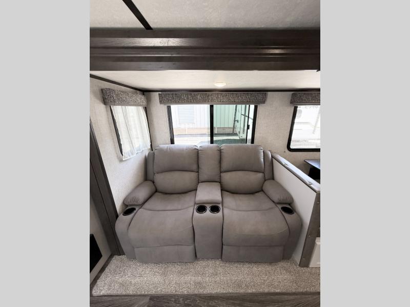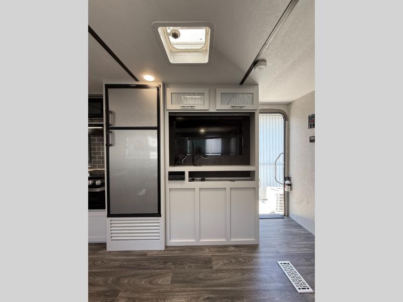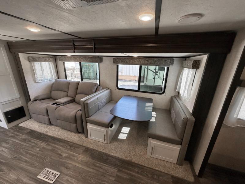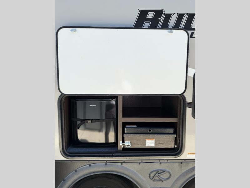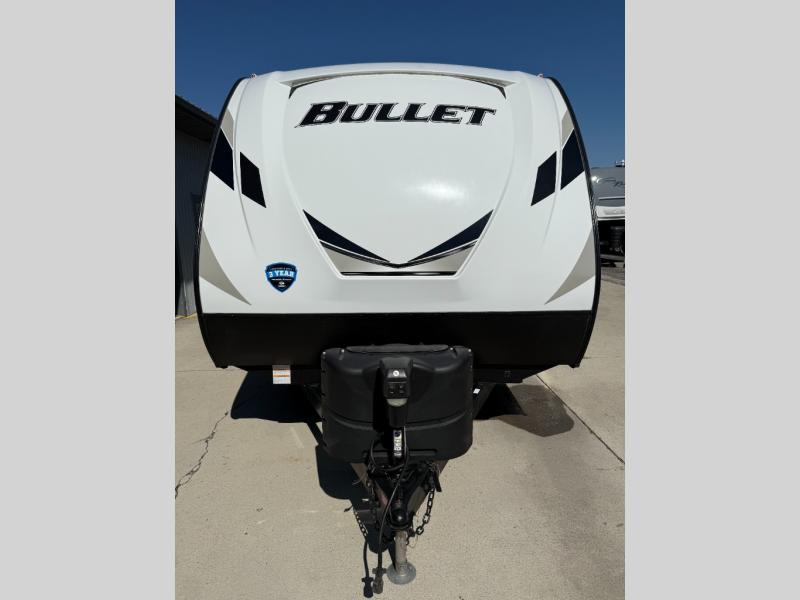 Load up your family or friends and head out to a quiet retreat at your favorite campground with this Bullet travel trailer by Keystone. Before you head inside, check out the outdoor kitchen which features a two-burner range top and mini refrigerator that will keep your drinks or snacks cool. In the evening, you can sit underneath the 19' electric awning with LED light strip and enjoy the scenic sunset. Inside this trailer you will love how open and spacious the kitchen and living area feel with the single slide that includes the Dream dinette and theater seats. The large bathroom is in the rear of this trailer and includes linen storage, and the private bedroom is in the front and includes a space saving sliding door and plenty of storage.