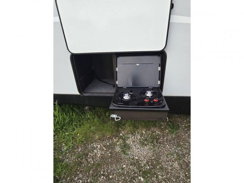 It's time to camp with your family or friends in this trailer that sleeps nine to ten people between the two bedrooms and the furniture in the main living and kitchen area. The private bunkhouse in the rar is a wonderful location to house any guests or children that you have traveling along with you because it contains its own wardrobe so that everyone has a place to store their clothing. The full bathroom has everything you need to get ready for the day including a tub/shower. The outdoor kitchen is a perfect addition for those who love a little fresh air while they cook, and the mini refrigerator will keep your drinks handy for a cool refreshment on a hot summer day.