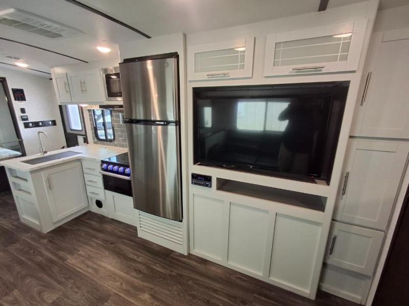 You will love how accommodating this Bullet is! Because this travel trailer can sleep nine people, it is a great choice for those who travel with large families or like to host big weekend parties with their friends. The front private bedroom will give you a place to escape when you need some alone time. With the addition of the large slide, you will have plenty of room indoors to get together for a movie night with the entertainment center and the LED TV. And the outdoor kitchen will be perfect for hosting other RVers while enjoy the great outdoors.