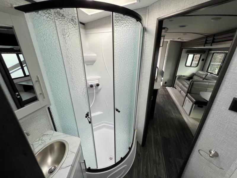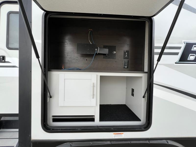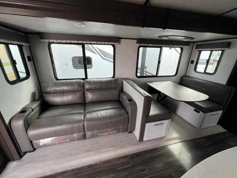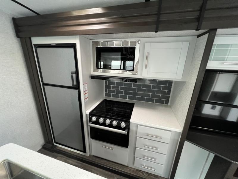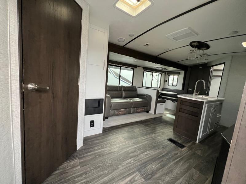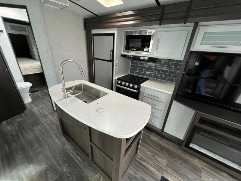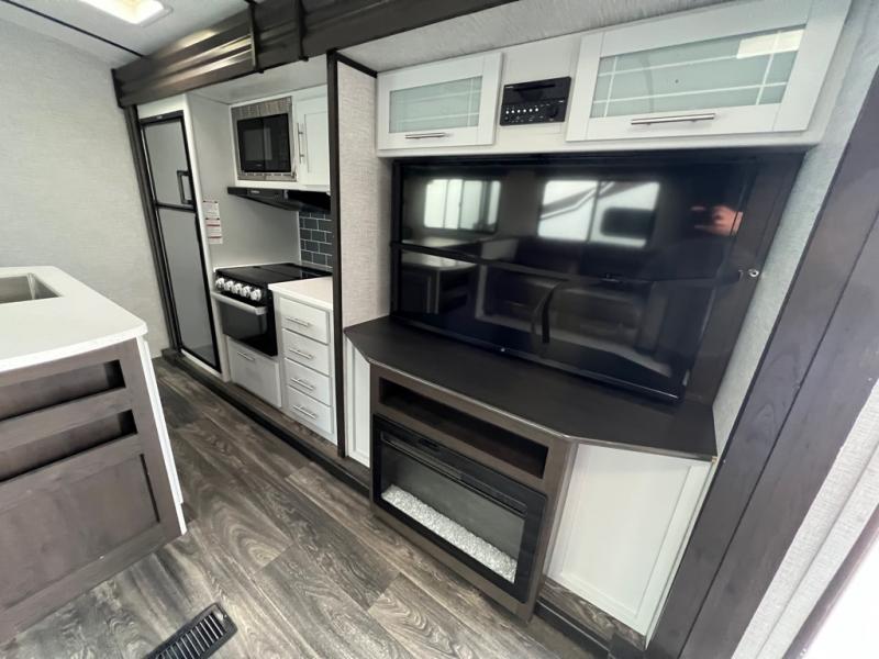 The kids will love having their own privacy with the rear bunkhouse in this travel trailer! It not only has a set of bunk beds, but also a flip-up bunk with a 68" tri-fold sofa below and a wardrobe/entertainment center. The dual entry bathroom makes it easy for everyone to access the radius shower, especially those staying in the front private bedroom. If the big game is on but you don't want to stay inside head to the outdoor entertainment center with a refrigerator to keep your beverage cold. And when mother nature rains on your parade, head inside to warm up by the fireplace across from the 68" tri-fold sofa which can be replaced for the optional luxury cinema recliners. The kitchen island will make meal prepping easier, and you can enjoy your meals at the Dream Dinette or switch it out for the optional free standing dinette!