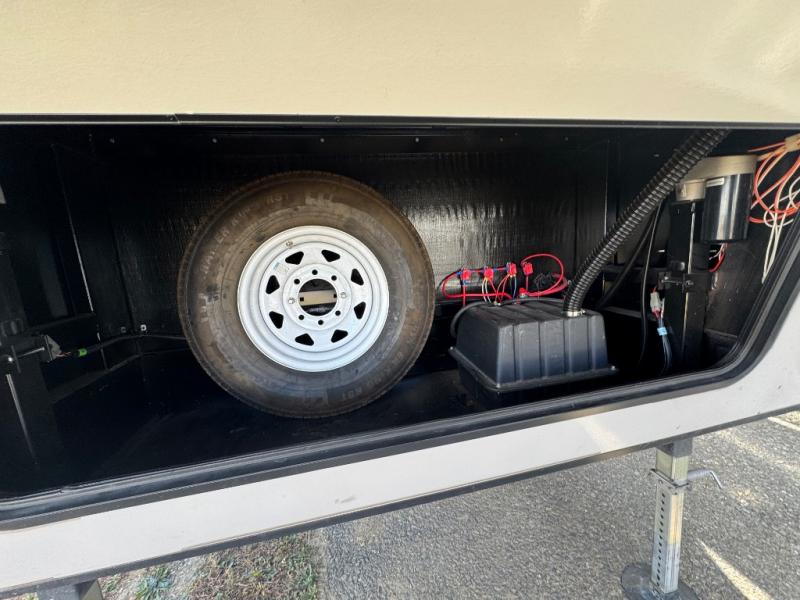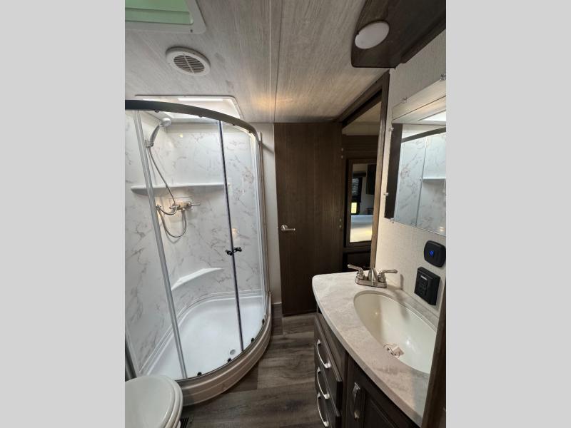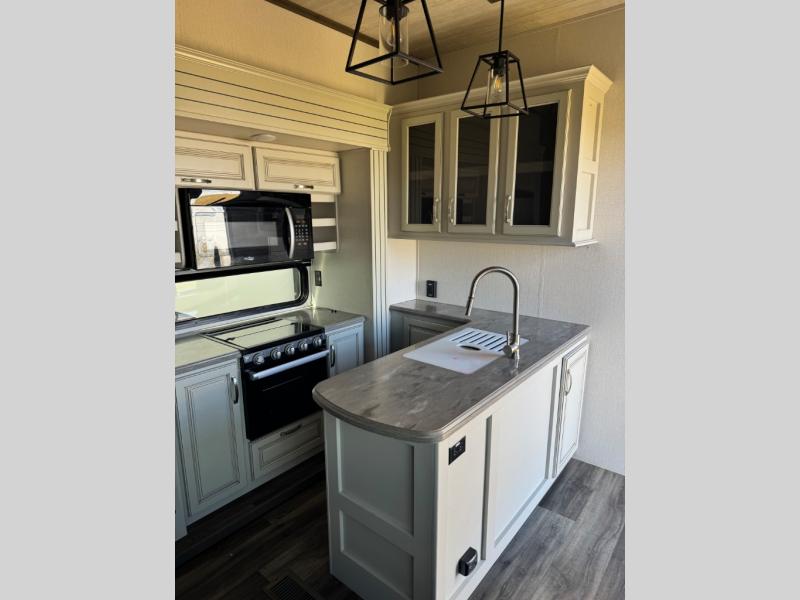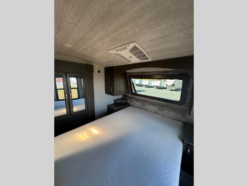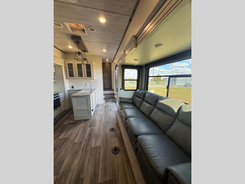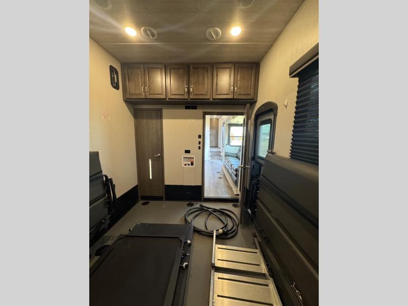 Bring along your toys and your family in this toy hauler that offers a 10' separate garage with a ramp door that has side steps which turns into a patio deck with a magnetic screen and rear awning. This makes for the perfect place to rest after hitting the trails. You will also find a handy side man door, dual sofas, a washer/dryer prepped space, and a half bathroom adjacent to the garage. The combined living and kitchen area offers everything you will need to be comfortable from the counter peninsula, all the appliances, and the sofa with recliners and a table, plus you will have your own full bathroom and master suite. You will find storage throughout in the wardrobes, overhead cabinets, storage on either side of the entertainment center, plus the exterior offers an unobstructed pass-through compartment for the larger outdoor items.