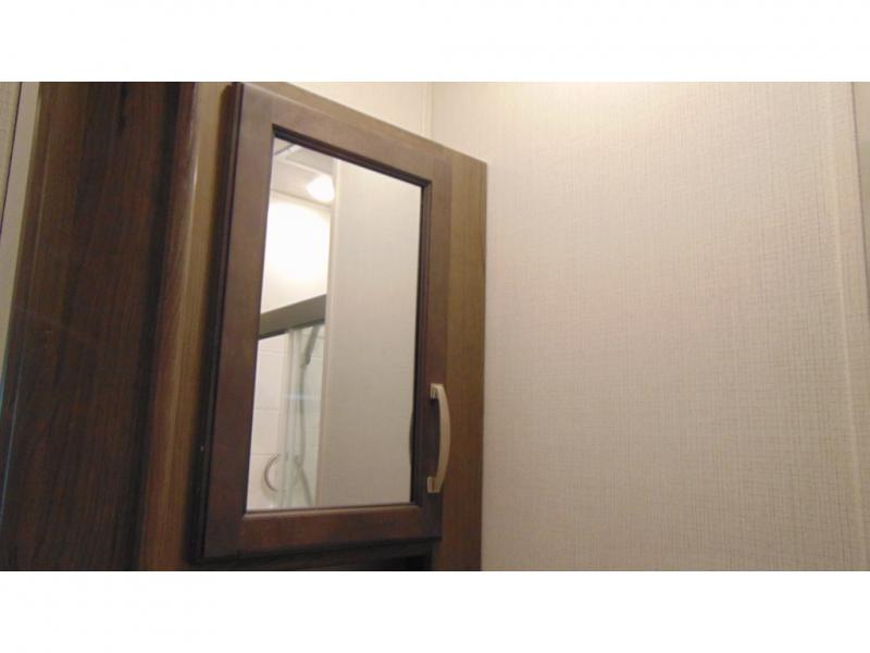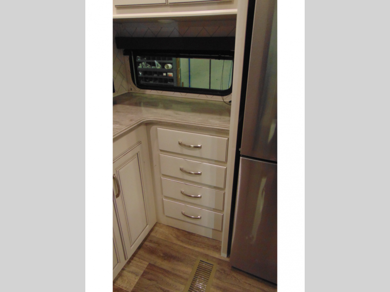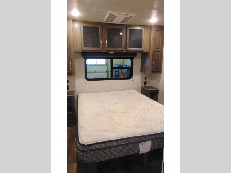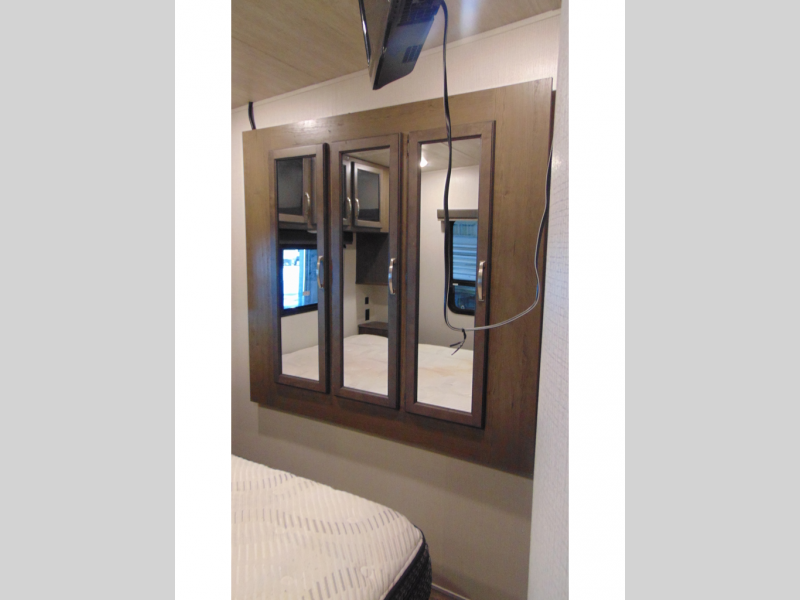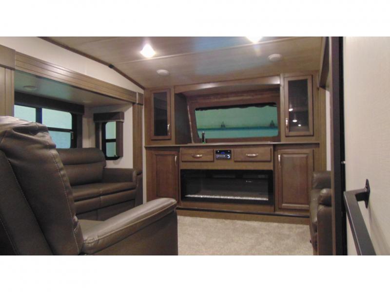 Man cave, TV room, family space, and/or extra bedroom are a few ways you can use the front living area with a pop-up TV that has a fireplace below. Everyone will have seating with two tri-fold sleeper sofa slides and two theater seats, and/or some might decide to play games at the legless dinette table or choose the free standing dinette option in the separate kitchen. The dual entries offer a smooth flow of traffic when the whole family is with you, and the spacious kitchen has lots of counter space, a pull-out pantry, and all the kitchen amenities needed to keep everyone fed. Access the full bathroom from the hallway to get cleaned up, and relax on your own queen bed in the rear bedroom whenever needed. You will find a closet prepped for a washer/dryer option, shoe garage underneath the bed, and three wardrobes for plenty of clothing storage.