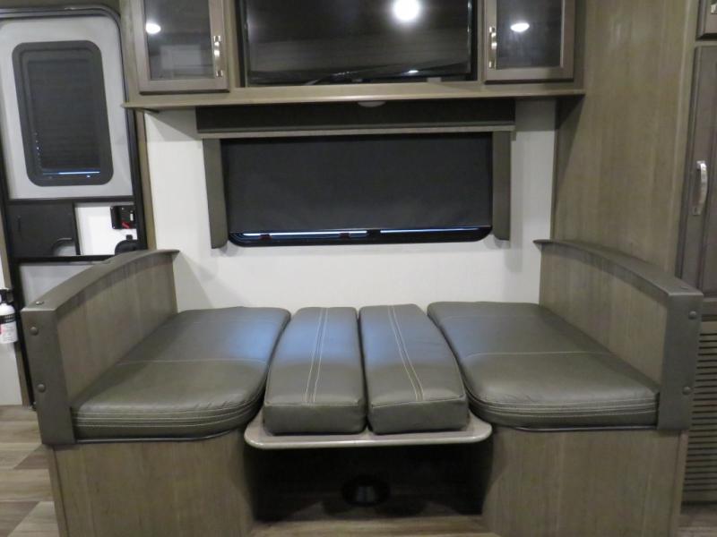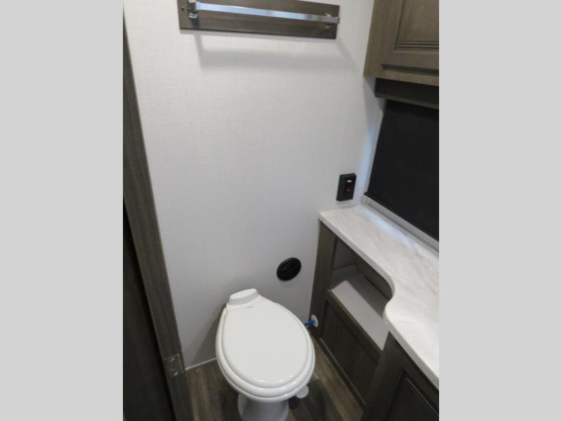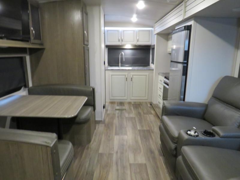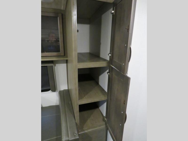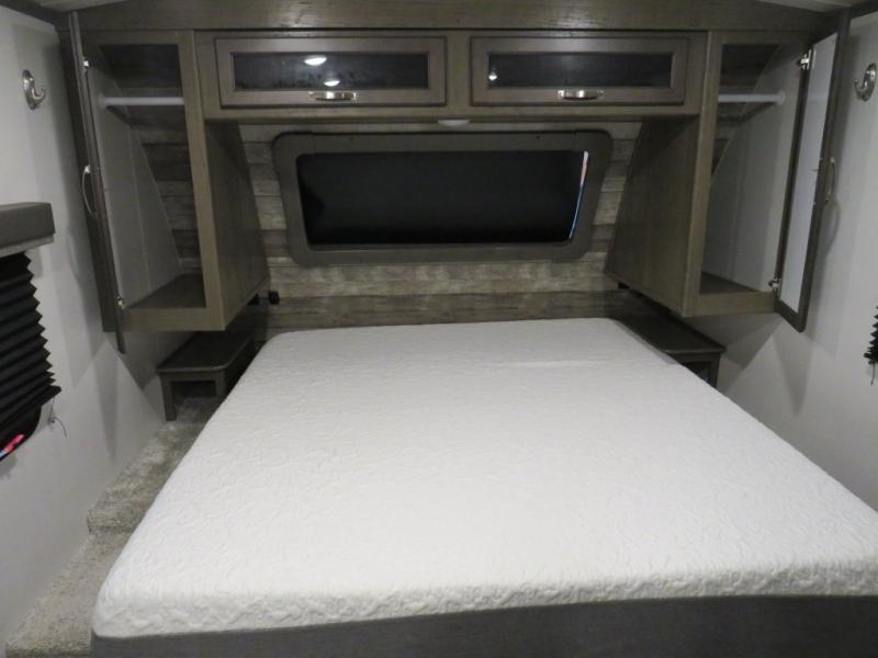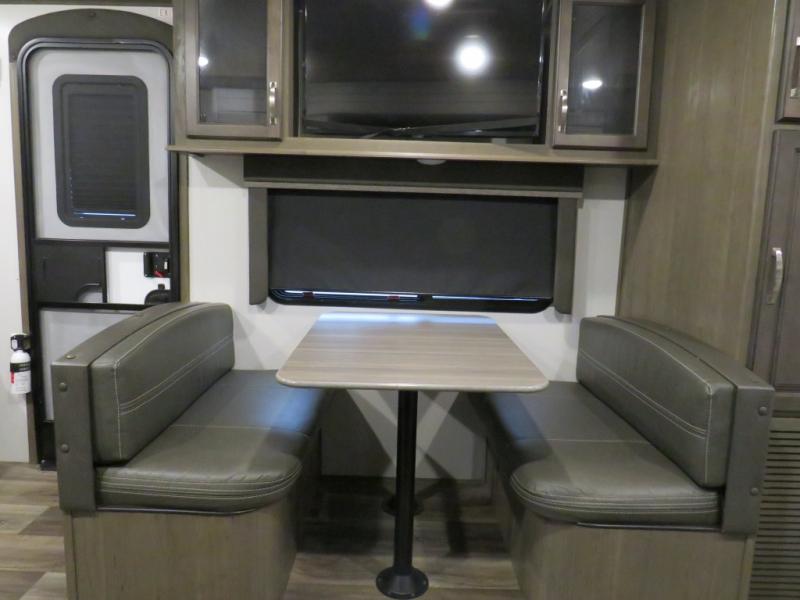 With a king-size bed, this Cougar Half-Ton travel trailer shows that you can still be comfortable even while you're away from home! The bed has wardrobes and nightstands on either side, and it also has a privacy curtain to section it off from the rest of the trailer. When you use the MORryde Solid Step entry to get inside, you'll notice and appreciate the shoe cubby to your left. Right next to the booth dinette is the pantry, and next to the pantry is the full bathroom which is certainly one of the most valuable features to any trailer.