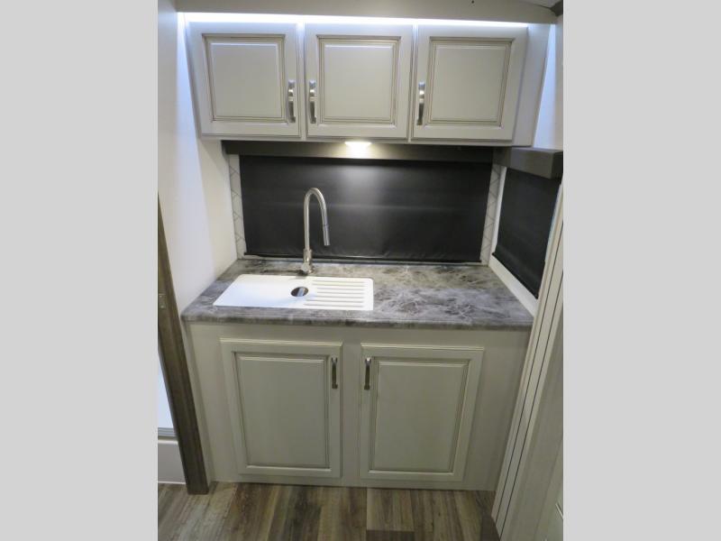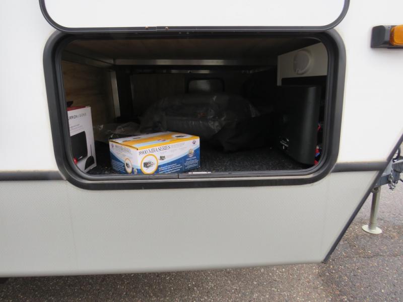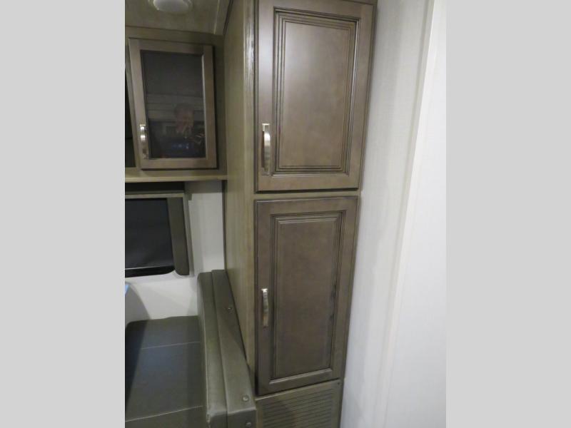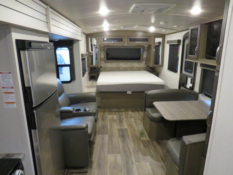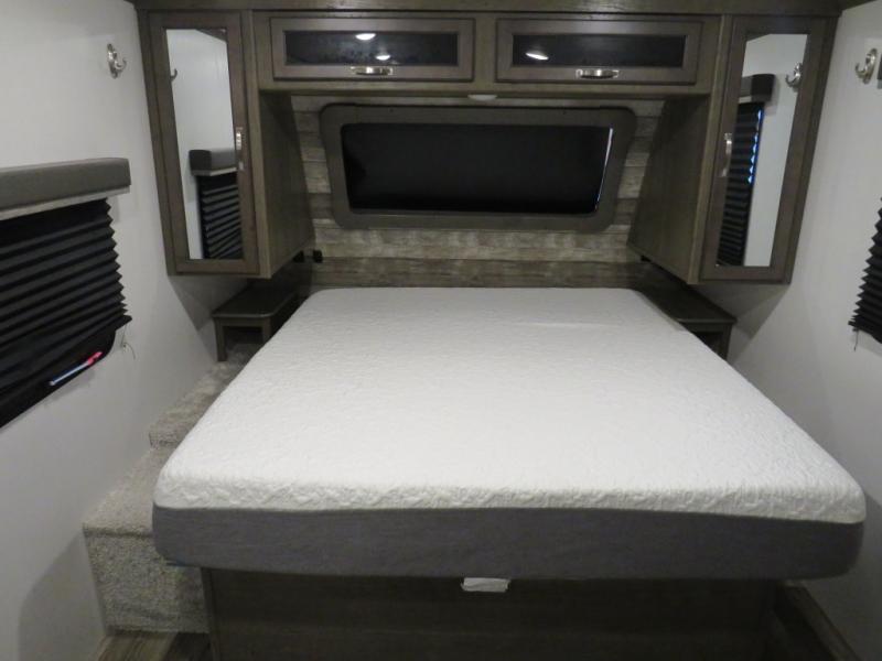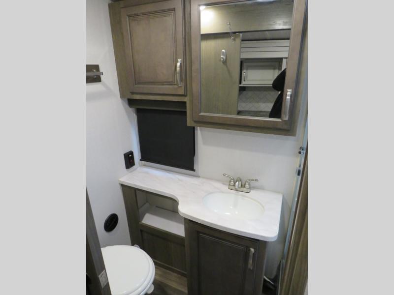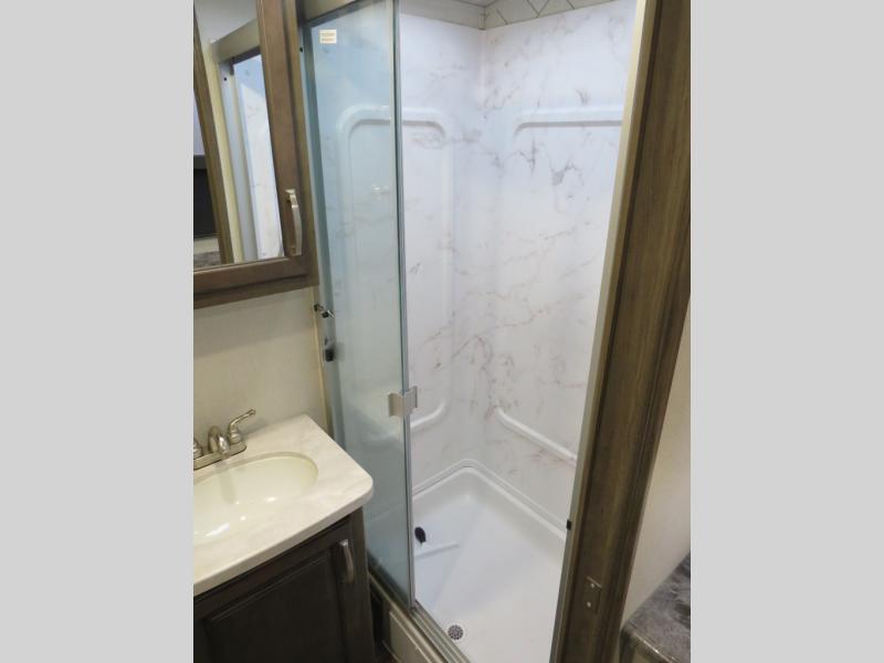 With a king-size bed, this Cougar Half-Ton travel trailer shows that you can still be comfortable even while you're away from home! The bed has wardrobes and nightstands on either side, and it also has a privacy curtain to section it off from the rest of the trailer. When you use the MORryde Solid Step entry to get inside, you'll notice and appreciate the shoe cubby to your left. Right next to the booth dinette is the pantry, and next to the pantry is the full bathroom which is certainly one of the most valuable features to any trailer.