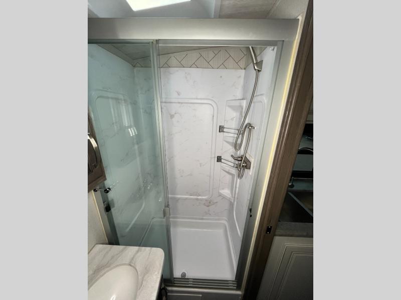 With a king-size bed, this Cougar Half-Ton travel trailer shows that you can still be comfortable even while you're away from home! The bed has wardrobes and nightstands on either side, and it also has a privacy curtain to section it off from the rest of the trailer. When you use the MORryde Solid Step entry to get inside, you'll notice and appreciate the shoe cubby to your left. Right next to the booth dinette is the pantry, and next to the pantry is the full bathroom which is certainly one of the most valuable features to any trailer.