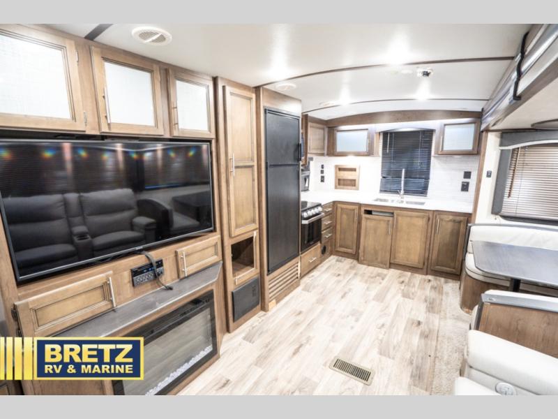 How does a king bed slide within a master suite sound? With this Cougar Half-Ton travel trailer, you'll have extra floor space and a full-width wardrobe allowing you to stay at your favorite campsite for long periods of time. The second slide located in the main living and kitchen area opens up this space for you to enjoy time spent inside just as much as outdoor adventures. The furniture even doubles as sleeping space for the kids or overnight guests. The rear kitchen layout is a convenience, and you will appreciate all the counter space for preparing and serving meals. You will find hidden storage behind the entertainment center, and next to the entertainment center is a pantry where you can store your favorite snacks.