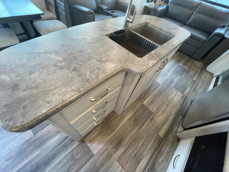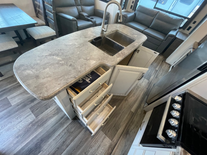 A kitchen island with a stainless steel undermount sink and chef's sprayer faucet creates an inviting space in which to prep dinner each evening with this Cougar Half-Ton travel trailer! Not only that, but this model also comes with a 21" Furrion range with Piezo ignition and microwave oven so that you can have all of the same dishes you love to make at home. The front private bedroom is spacious and accommodating with its king bed slide, full-width wardrobe, and dresser, and the rear living area is just as great because it has an entertainment center that everyone can watch from the comfort of the theater seating or sleeper sofa. You can also add an optional fireplace to this model.