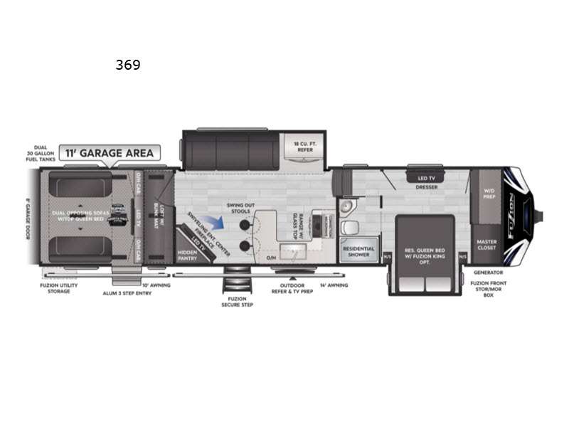 Seek new thrills and see new sights in a Fuzion toy hauler fifth wheel by Keystone. A few of the advantages you'll find with these models are Adjust-A-Track frame-welded tie-downs, Tru-fit slide construction, 12V color-coded wiring, plus much more. The Max Turn technology makes turning and parking easier than ever, and the MORryde CRE 3000 suspension will provide smooth towing to the campground. You will stay comfortable year around with the in-floor heating ducts and the Blade high performance air flow system that gives 20% more air flow. Each model includes many interior comforts, including residential-style furniture, extra tall ceilings with crown molding, and fiberglass backed linoleum floors. The garage features gas and oil resistant tuff-fly flooring, an 8' ramp door, a fuel station with dual 30 gallon tanks, and double electric beds with dual opposing sofas so you can invite more friends along!