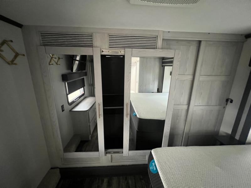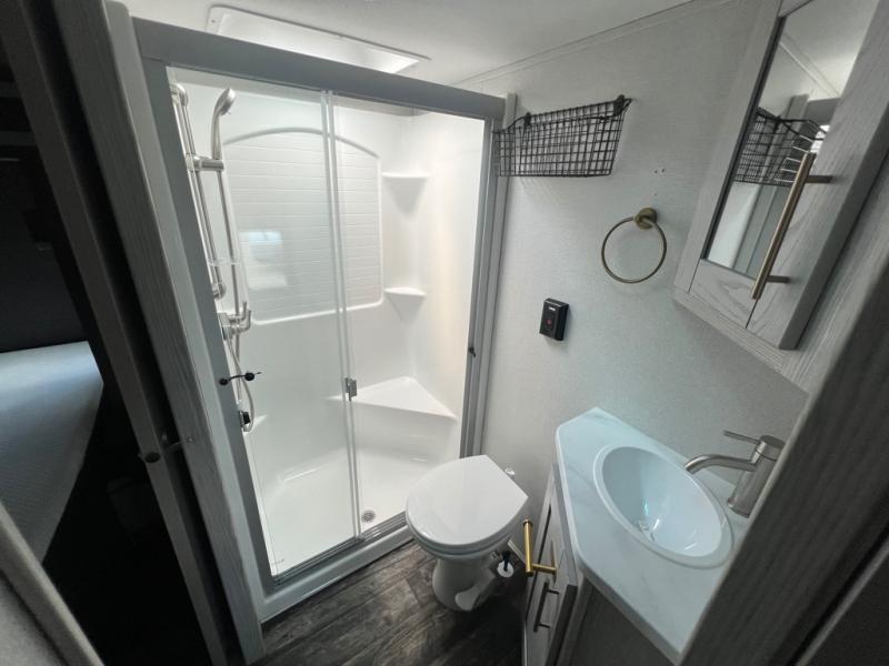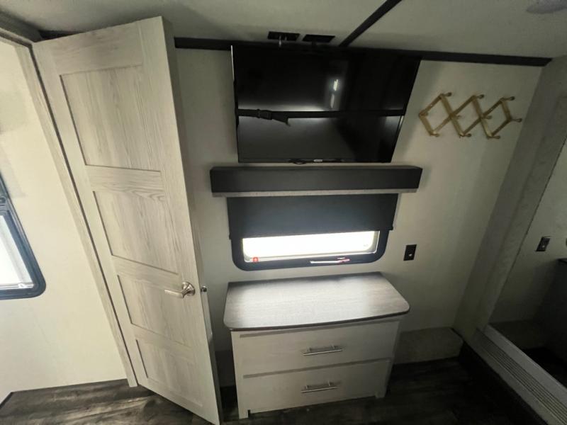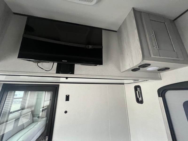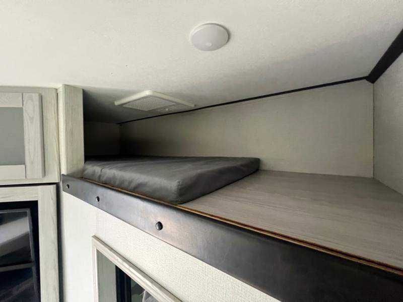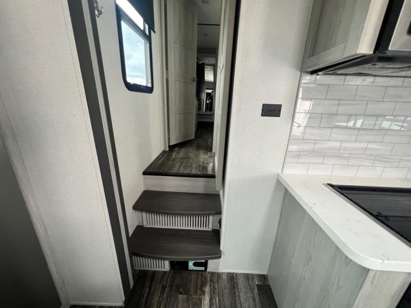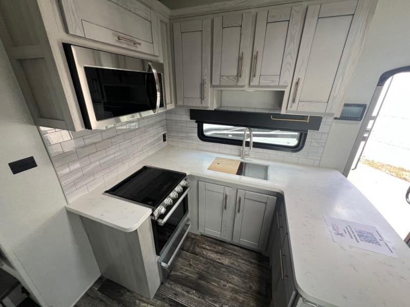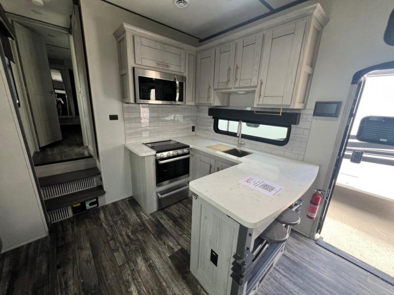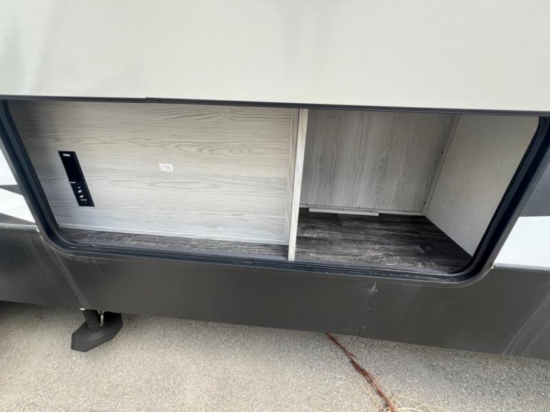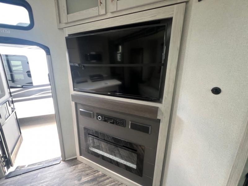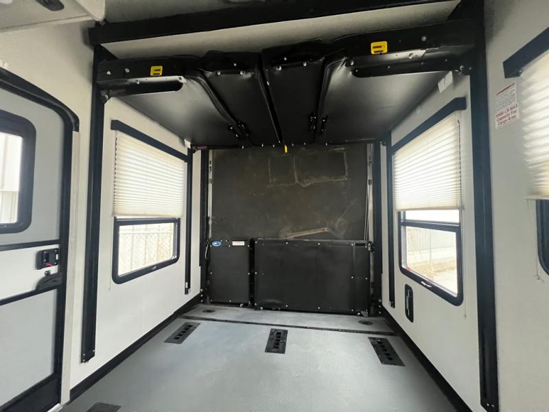 Riding the dunes and kicking up mud has never been more fun than in this toy hauler. Your guests will appreciate their own space in the 11' separate garage that includes a loft with a bunk mat, dual opposing sofas with a top queen bed, plus their own LED TV. The main living area includes a large slide for added space, plus a U-shaped kitchen with swing out stools the kids are sure to love. The swiveling entertainment center with a fireplace features a hidden pantry behind for convenient storage, and the 18.3 cu. ft. residential refrigerator can hold all your perishables for the week. The dual entry bath includes a residential shower with a seat, plus a private entrance into the front master suite for convenience.