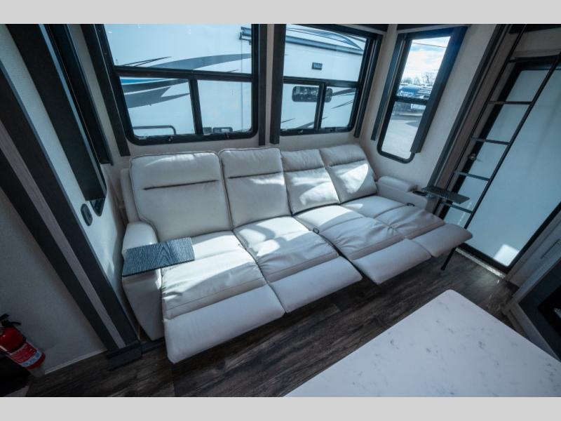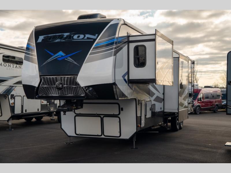 Seek new thrills and see new sights in a Fuzion toy hauler fifth wheel by Keystone. A few of the advantages you'll find with these models are Adjust-A-Track frame-welded tie-downs, Tru-fit slide construction, 12V color-coded wiring, plus much more. The Max Turn technology makes turning and parking easier than ever, and the MORryde CRE 3000 suspension will provide smooth towing to the campground. You will stay comfortable year around with the in-floor heating ducts and the Blade high performance air flow system that gives 20% more air flow. Each model includes many interior comforts, including residential-style furniture, extra tall ceilings with crown molding, and fiberglass backed linoleum floors. The garage features gas and oil resistant tuff-fly flooring, an 8' ramp door, a fuel station with dual 30 gallon tanks, and double electric beds with dual opposing sofas so you can invite more friends along!