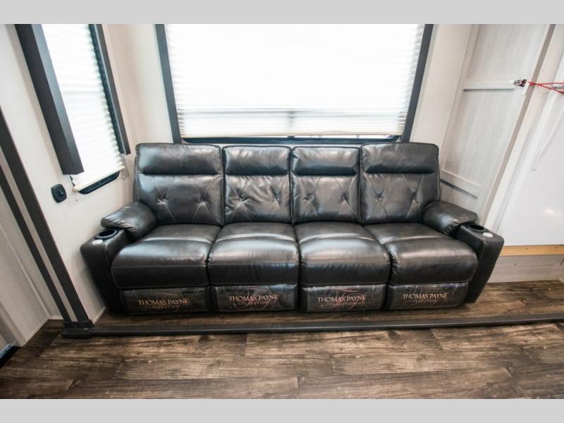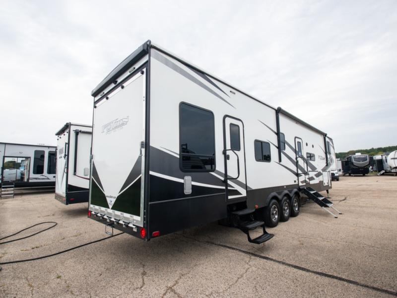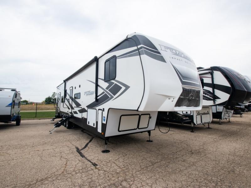 This Fuzion Impact Edition toy hauler is similar to model 359, but you will enjoy a larger 15' separate garage for your favorite riding toys on this unit. Your guests can sleep on the electric queen bed with dual opposing sofas underneath, and there is a loft with a bunk mat for the kids. Within the main living area you will find a unique U-shaped kitchen countertop with swing-out bar stools, a large slide out with a sofa and 12-cu. ft. refrigerator, plus an LED TV and fireplace for a more at-home feel. The full and half bath will make camping with friends and family easier than ever, and you will appreciate the outdoor TV prep if you choose to bring along your own TV for entertainment!