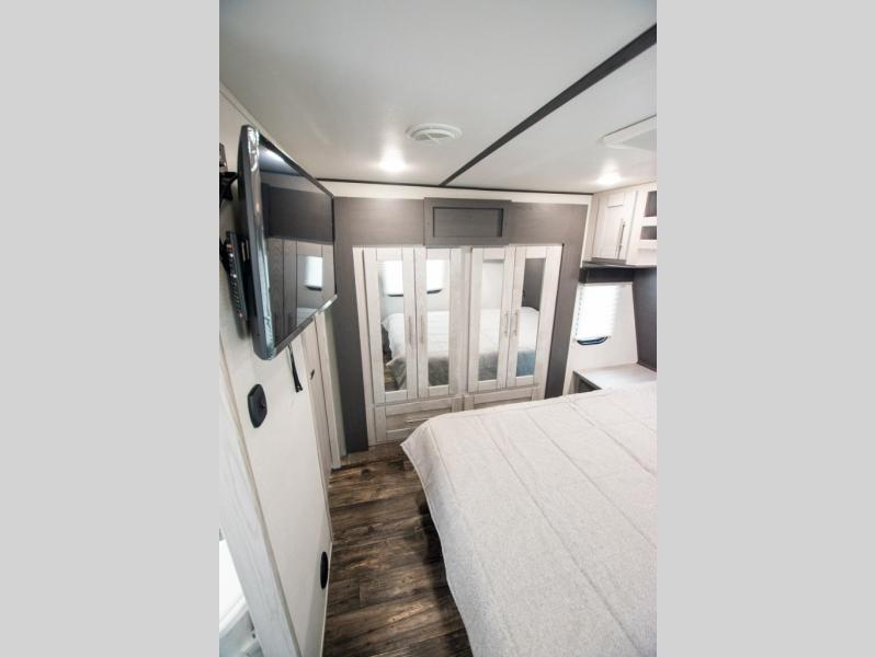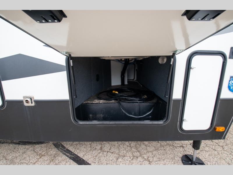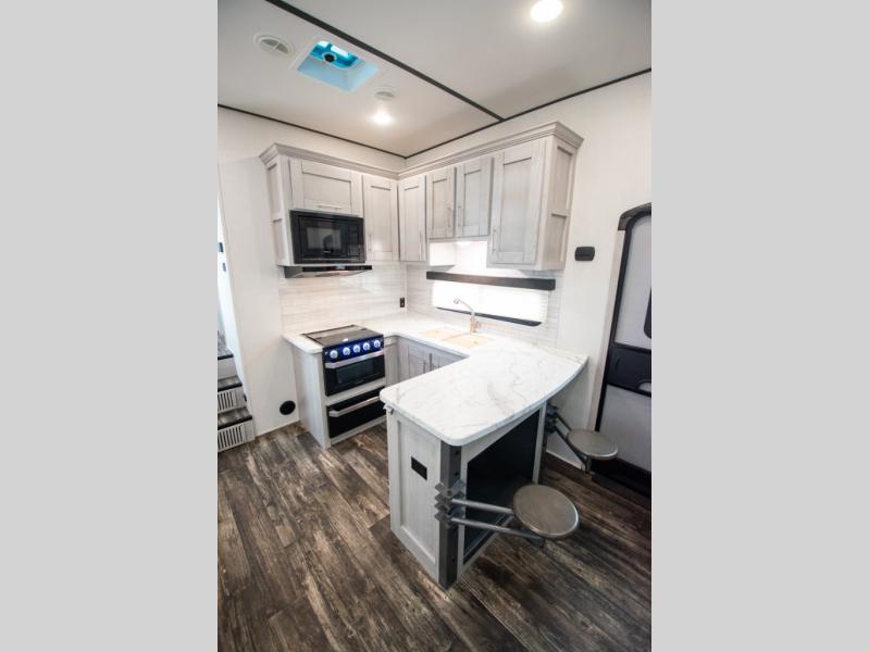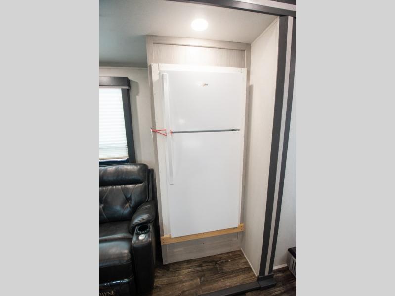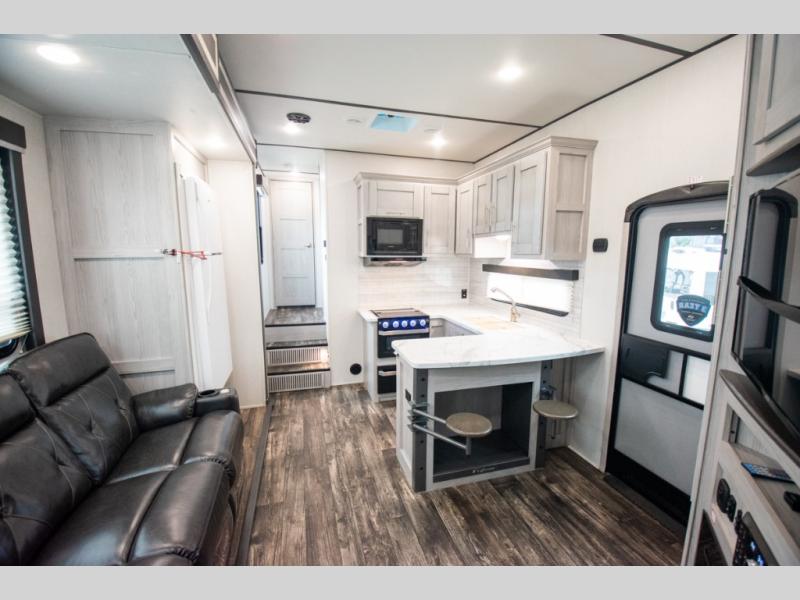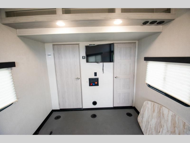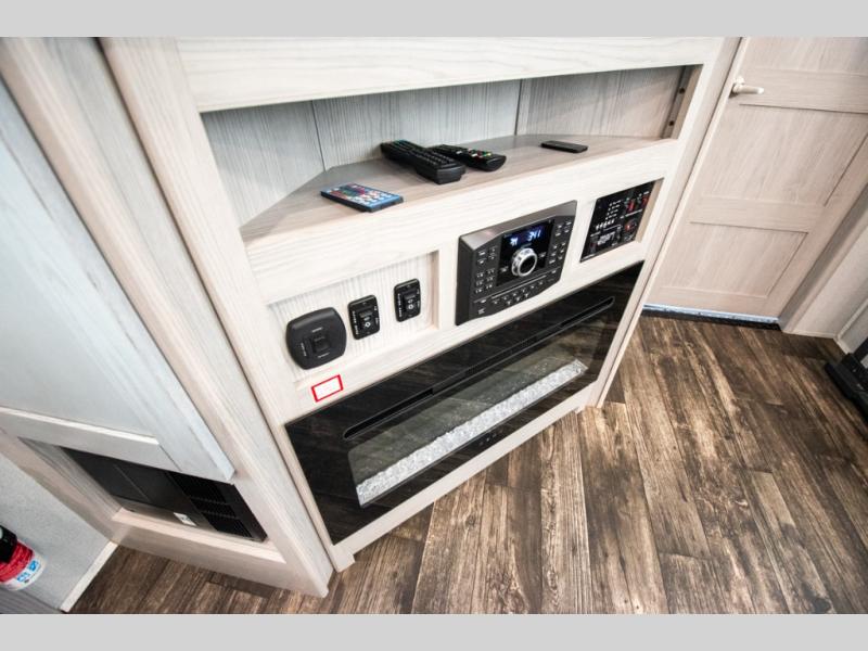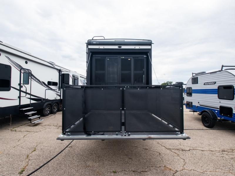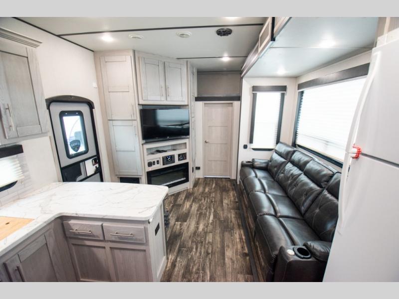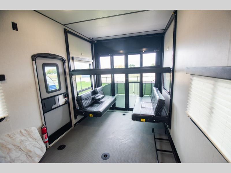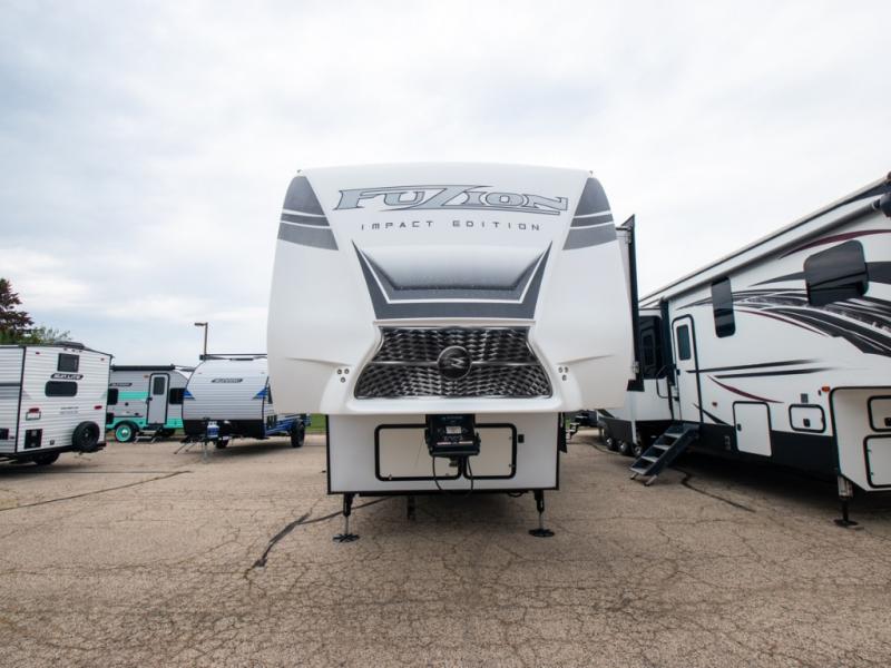 Keystone specifically keeps you, the customer, in mind as they construct and build each Fuzion Impact Edition toy hauler. The 100" wide body and 5k interlock system with frame-welded tie-downs ensure convenient and secure shipment of your favorite ride-on toys. You will appreciate the Keystone Exclusives, such as the Tru-fit slide construction, the in-floor heating ducts, 4G LTE and Wi-Fi prep, plus many more hassle-free features. Each model includes a 30-gal. fuel station with a 12V pump and a static line and the Omni-Chill A/C system, which is the highest-performing energy-efficient system available. Inside, you will love the hardwood cabinetry, pressed countertops in the kitchen, and large tinted safety-glass panoramic windows to let natural light in. These toy haulers also feature plenty of storage space for all your belongings, including under-bed storage and a lighted pass-through compartment!