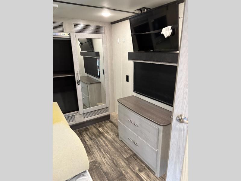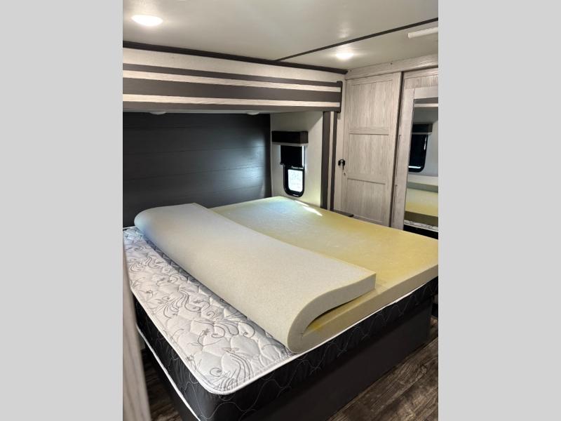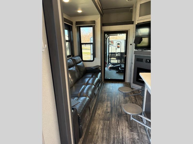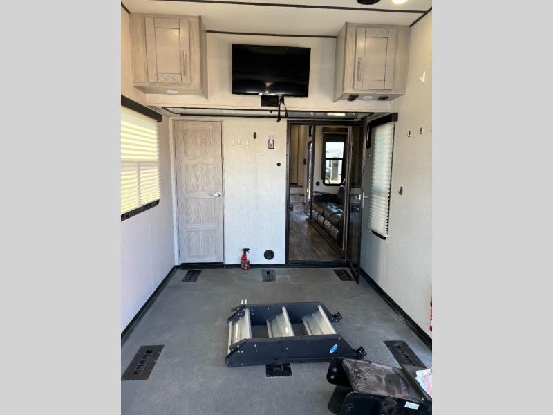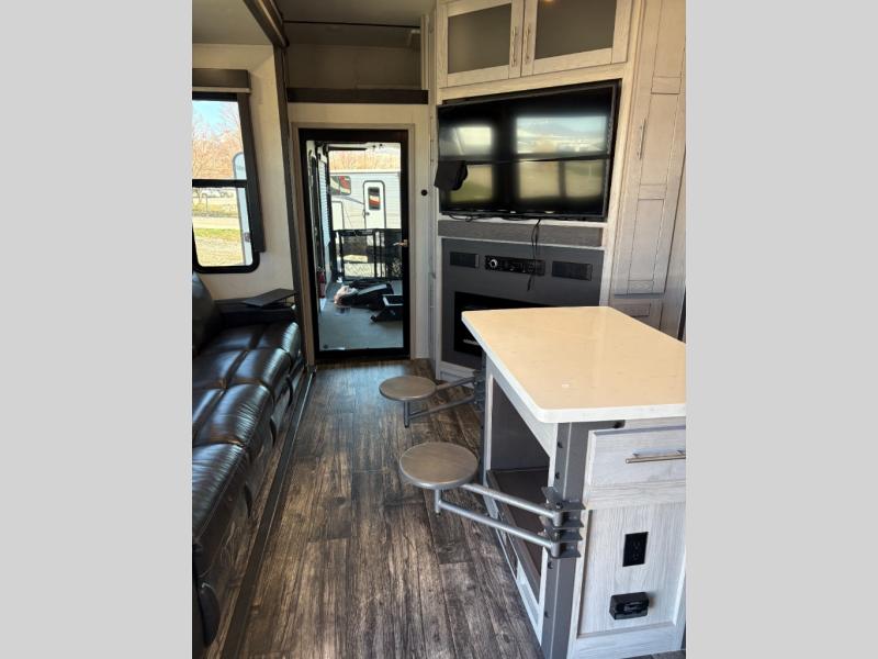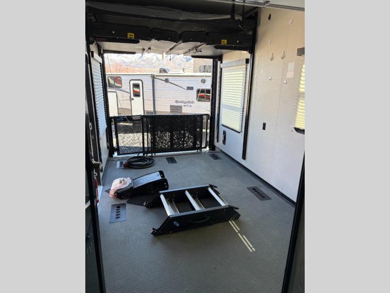 How does a bath and a half, triple slides, plus a 15' garage sound in this toy hauler? The 8' ramp door will make unloading a breeze, and the dual entry doors will create a smooth flow of traffic. The kids or your guests are sure to love the loft with a bunk mat, and you will feel right at home in the front master bedroom. Everyone can gather in the main living area to play a game of cards at the table with swing out stools, or watch a show on the large sofa. There is an LED TV here and a fireplace, plus two pantries for snacks galore!