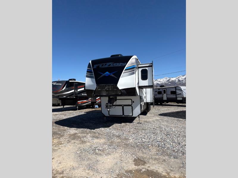 Seek new thrills and see new sights in a Fuzion toy hauler fifth wheel by Keystone. A few of the advantages you'll find with these models are Adjust-A-Track frame-welded tie-downs, Tru-fit slide construction, 12V color-coded wiring, plus much more. The Max Turn technology makes turning and parking easier than ever, and the MORryde CRE 3000 suspension will provide smooth towing to the campground. You will stay comfortable year around with the in-floor heating ducts and the Blade high performance air flow system that gives 20% more air flow. Each model includes many interior comforts, including residential-style furniture, extra tall ceilings with crown molding, and fiberglass backed linoleum floors. The garage features gas and oil resistant tuff-fly flooring, an 8' ramp door, a fuel station with dual 30 gallon tanks, and double electric beds with dual opposing sofas so you can invite more friends along!