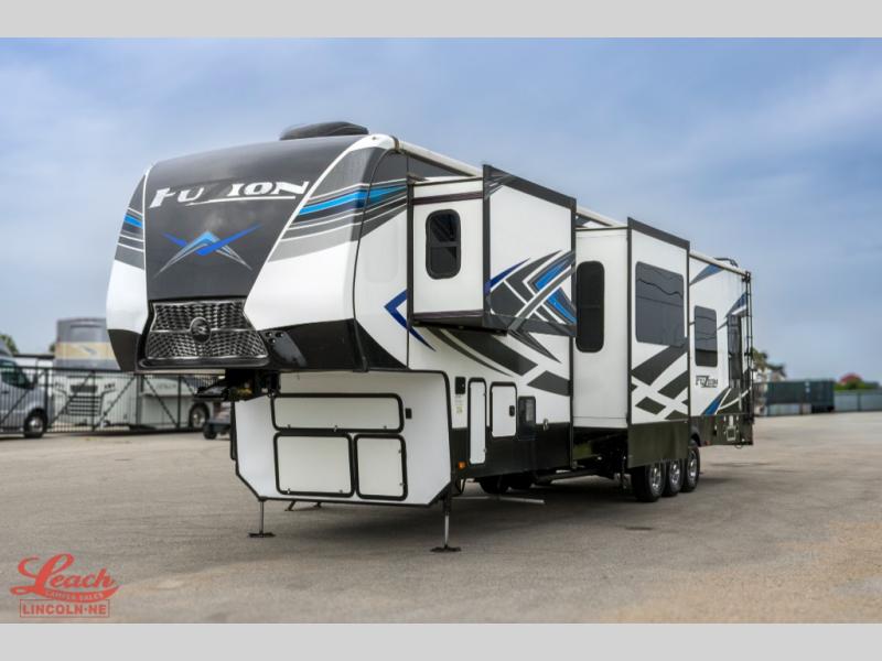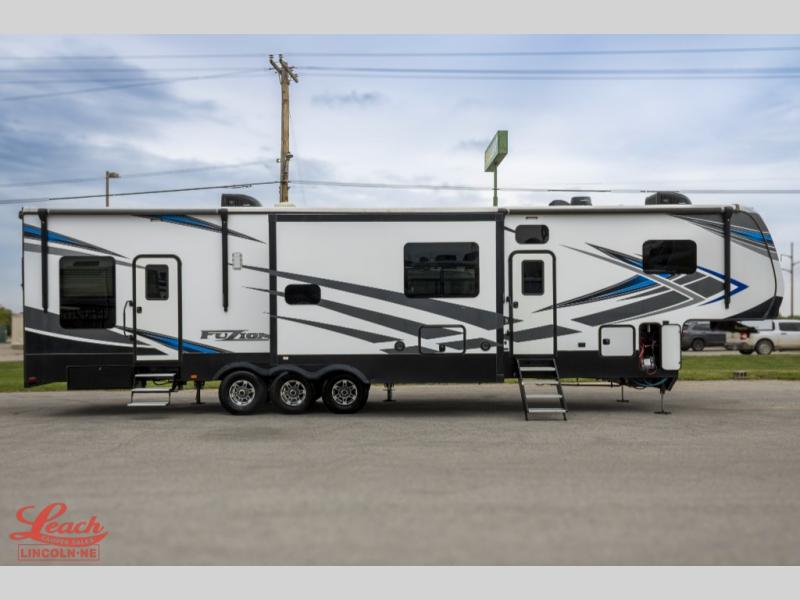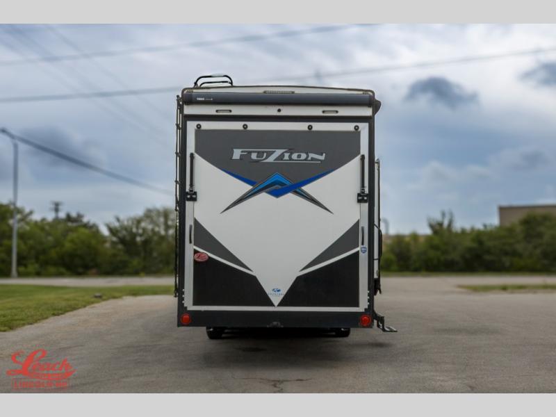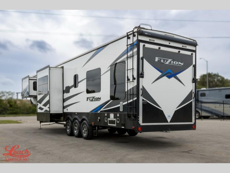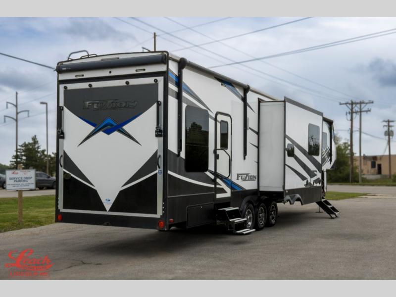 Seek new thrills and see new sights in a Fuzion toy hauler fifth wheel by Keystone. A few of the advantages you'll find with these models are Adjust-A-Track frame-welded tie-downs, Tru-fit slide construction, 12V color-coded wiring, plus much more. The Max Turn technology makes turning and parking easier than ever, and the MORryde CRE 3000 suspension will provide smooth towing to the campground. You will stay comfortable year around with the in-floor heating ducts and the Blade high performance air flow system that gives 20% more air flow. Each model includes many interior comforts, including residential-style furniture, extra tall ceilings with crown molding, and fiberglass backed linoleum floors. The garage features gas and oil resistant tuff-fly flooring, an 8' ramp door, a fuel station with dual 30 gallon tanks, and double electric beds with dual opposing sofas so you can invite more friends along!