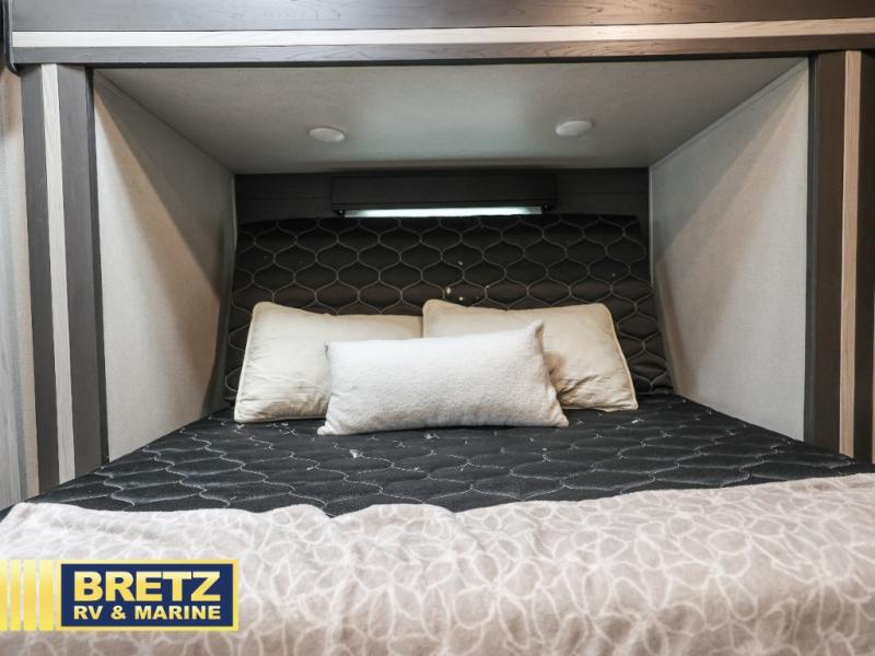 Keystone specifically keeps you, the customer, in mind as they construct and build each Fuzion Impact Edition toy hauler. The 100" wide body and 5k interlock system with frame-welded tie-downs ensure convenient and secure shipment of your favorite ride-on toys. You will appreciate the Keystone Exclusives, such as the Tru-fit slide construction, the in-floor heating ducts, 4G LTE and Wi-Fi prep, plus many more hassle-free features. Each model includes a 30-gal. fuel station with a 12V pump and a static line and the Omni-Chill A/C system, which is the highest-performing energy-efficient system available. Inside, you will love the hardwood cabinetry, pressed countertops in the kitchen, and large tinted safety-glass panoramic windows to let natural light in. These toy haulers also feature plenty of storage space for all your belongings, including under-bed storage and a lighted pass-through compartment!