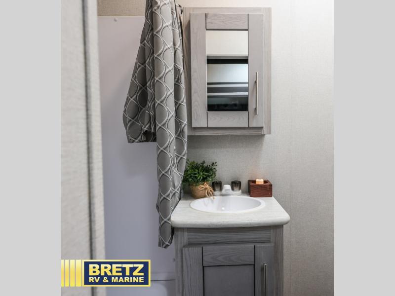 You will make a great impact on your camping trips with this Fuzion Impact Edition Vapor Lite toy hauler! The interior not only has a 15' garage for bringing along the four-wheelers, but it also has a comfortable lounging space with the dual opposing sofas and two lounge chairs with table once all of the toys have been removed. There is an entertainment center with LED TV, so you can watch a few movies if you get tired from riding the trails. And, even more comfort will come from the front master suite. This space has a dual-entry bathroom that can be accessed from the main area or the bedroom, and the bedroom has an RV queen bed slide to create some more space in the bedroom for you to change out of your clothes.