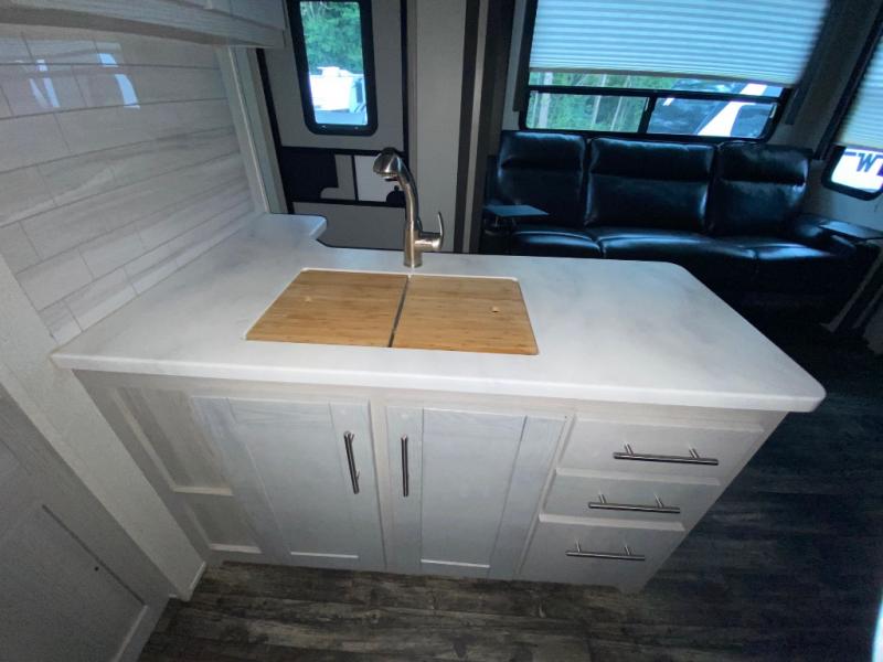 Step inside this Fuzion Impact Edition fifth wheel toy hauler for a fun trail-riding weekend. You can easily unload your toys from the 13' separate garage using the 8' garage door. Once the toys are unloaded, relax on the dual opposing sofas, or take a rest on the electric queen bed. The kids or guests can climb up into the loft that includes a bunk mat, and there is a half bath in the garage for added convenience. This model includes a peninsula countertop with plenty of space to prep meals and clean up, and there is a 12-cu. ft. refrigerator for perishables. You'll find a residential shower with a seat in the dual-entry bath, and the front bedroom will feel just like home with its residential queen bed and wardrobe slide for all your clothes.