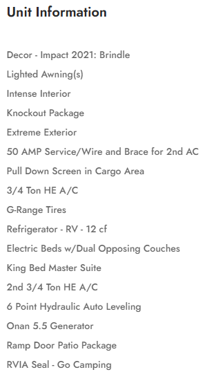 | Awning Info | 13' Electric with Adjustable Arms, Auto Dump, LED Lights |
