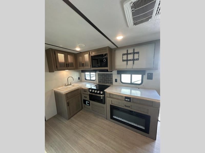 The whole family will love camping in this Hideout travel trailer! It features a front private bedroom with a queen-size bed for you to enjoy a good night's rest and a rear set of 52" x 74" bunk beds for the kids, plus the 72" sofa can convert into an extra sleeping space. The central vacuum is conveniently located in the kitchen, and the pull-out pantry is by the fireplace so that you can grab a snack before turning on the fireplace. The rear corner bathroom has a 38" walk-in shower for you to get squeaky clean and a closet just outside the bathroom for your storage needs. There is also storage underneath the sofa that doubles as seating, as well as a front exterior pass-through storage area and a rear exterior storage access!