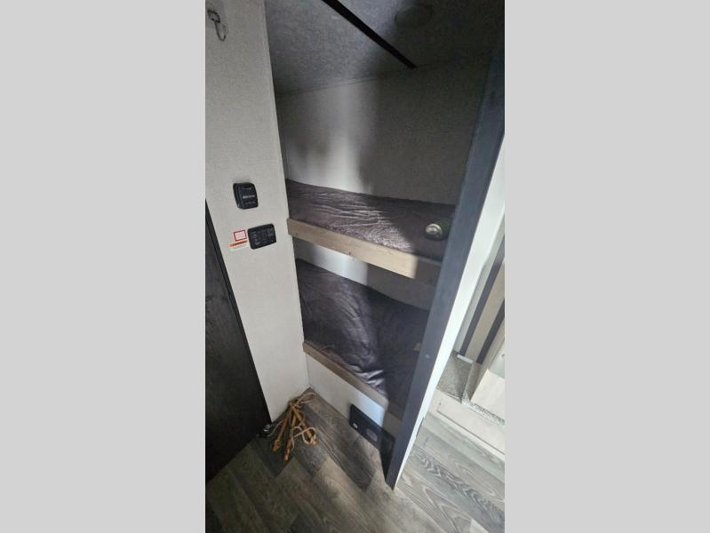 This Hideout Single Axle travel trailer is a great way for your family to get away and enjoy all that nature has to offer. There are bunk beds for the children, a booth dinette slide for added interior space when cooking or for when the kids are playing inside, and a queen-size bed for mom and dad. You will find plenty of storage for your clothing, dishes, or kitchen gadgets with the interior cabinets, and the pass-through storage compartment on the exterior can hold your outdoor games, fishing poles, and more. To help you enjoy spending more time outside, this unit comes standard with a power awning for a little protection from the sun.
