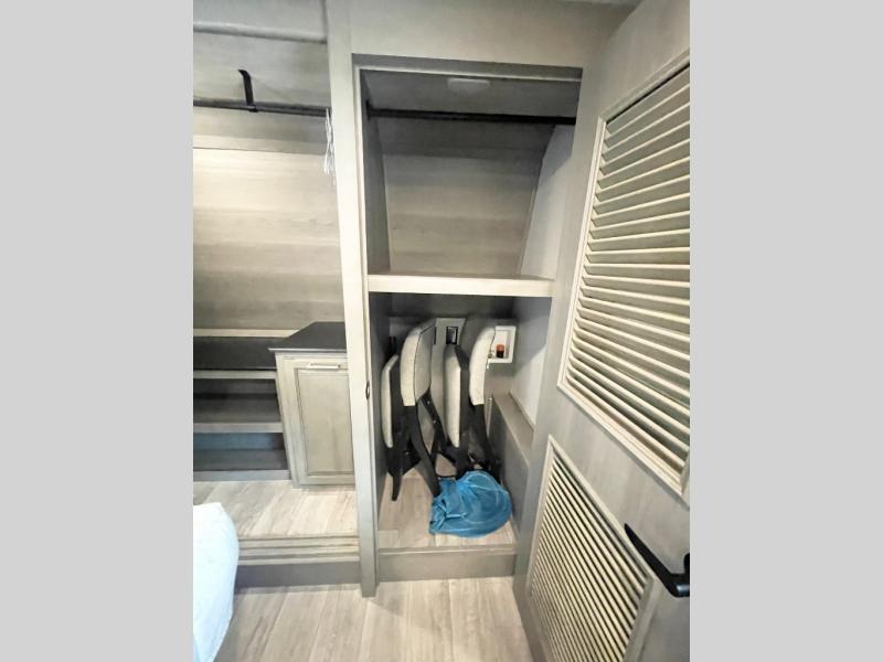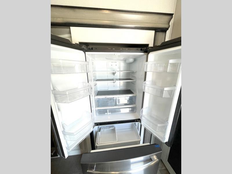 With this Montana fifth wheel, you can have adventures any time! The private bedroom has a barn door that closes it off from the rest of the unit, and the bedroom is fully equipped for comfort with a queen bed slide, a dresser with 32" LED HDTV, a clothing hamper, a huge closet, and an area prepped for the optional washer/dryer. The main living area is also going to feel exceptionally comfortable with its hide-a-bed sofa, power theater seating, fireplace, and 50" LED HDTV. As you spend your afternoon working on dinner, you'll appreciate that the large island provides you with additional prep space, and the coffee station is going to be a fun feature to use both in the morning and in the afternoon for a pick-me-up.