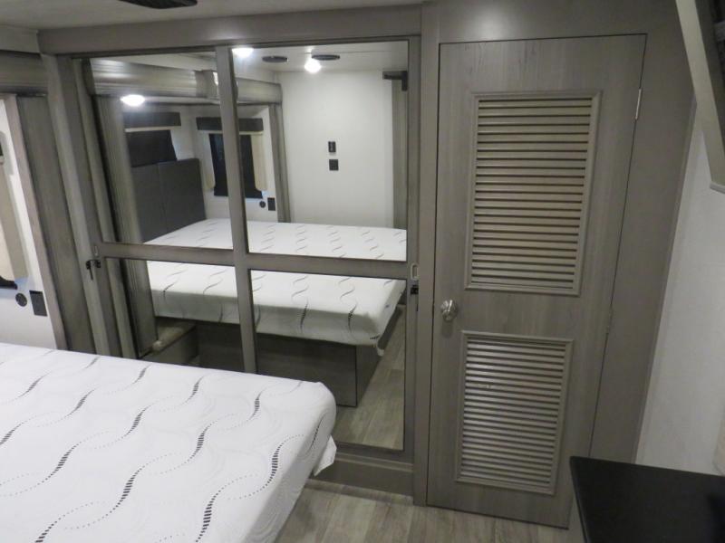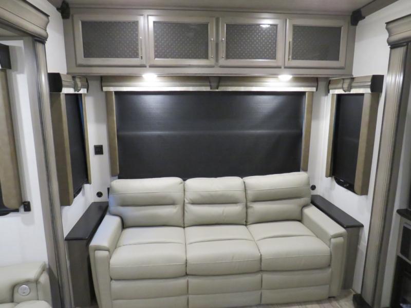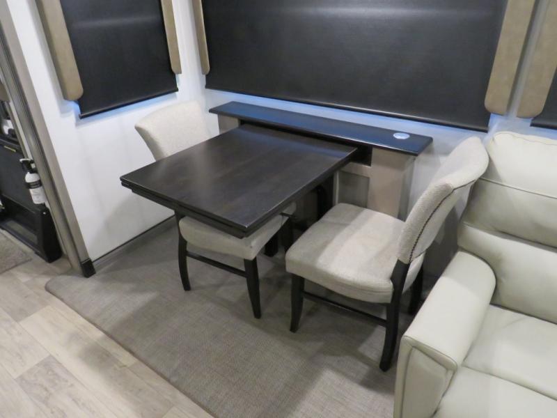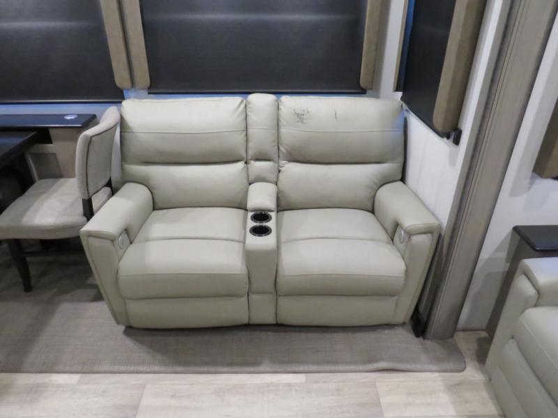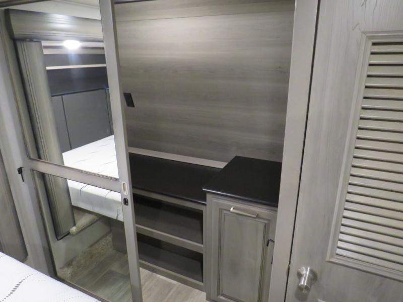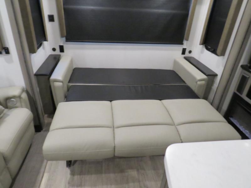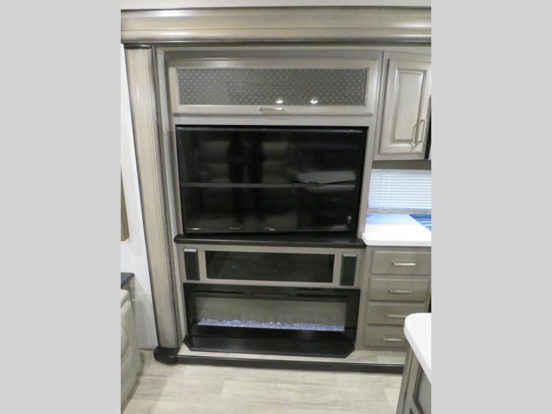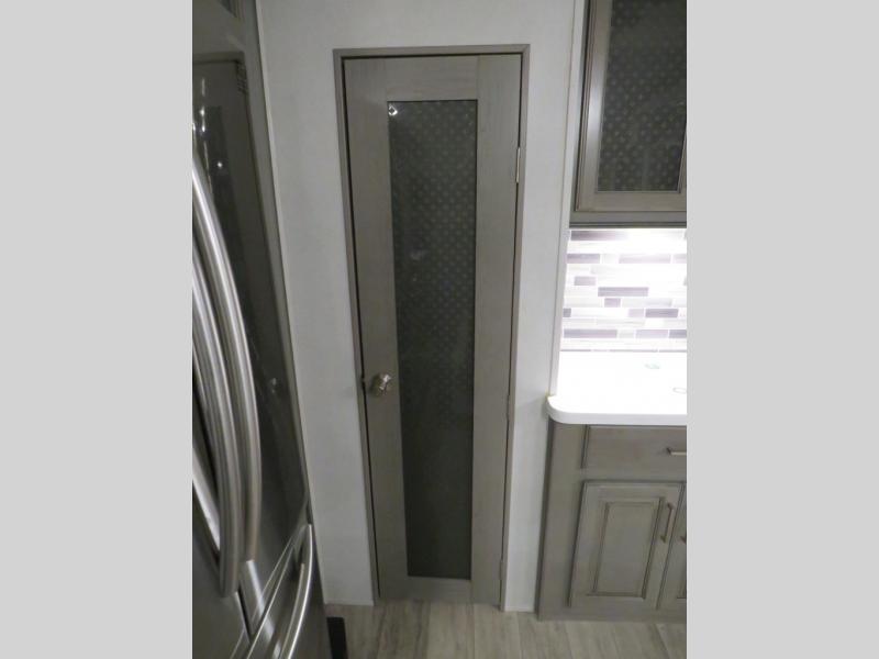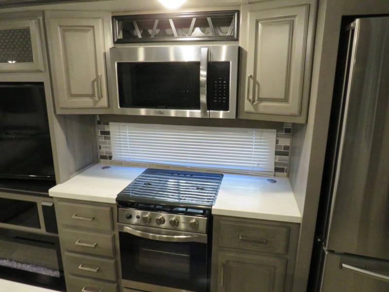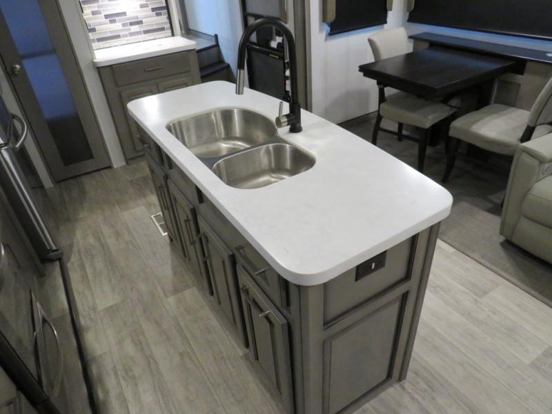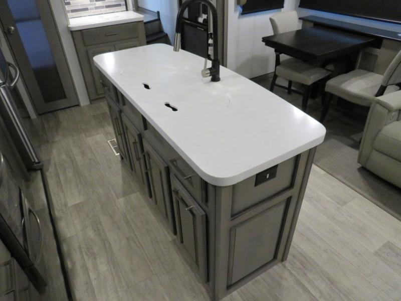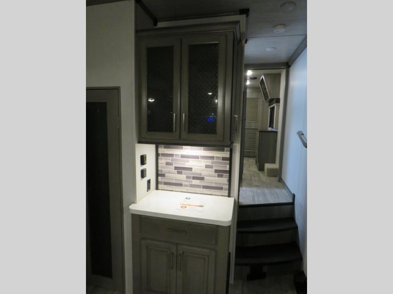 With this Montana fifth wheel, you can have adventures any time! The private bedroom has a barn door that closes it off from the rest of the unit, and the bedroom is fully equipped for comfort with a queen bed slide, a dresser with 32" LED HDTV, a clothing hamper, a huge closet, and an area prepped for the optional washer/dryer. The main living area is also going to feel exceptionally comfortable with its hide-a-bed sofa, power theater seating, fireplace, and 50" LED HDTV. As you spend your afternoon working on dinner, you'll appreciate that the large island provides you with additional prep space, and the coffee station is going to be a fun feature to use both in the morning and in the afternoon for a pick-me-up.