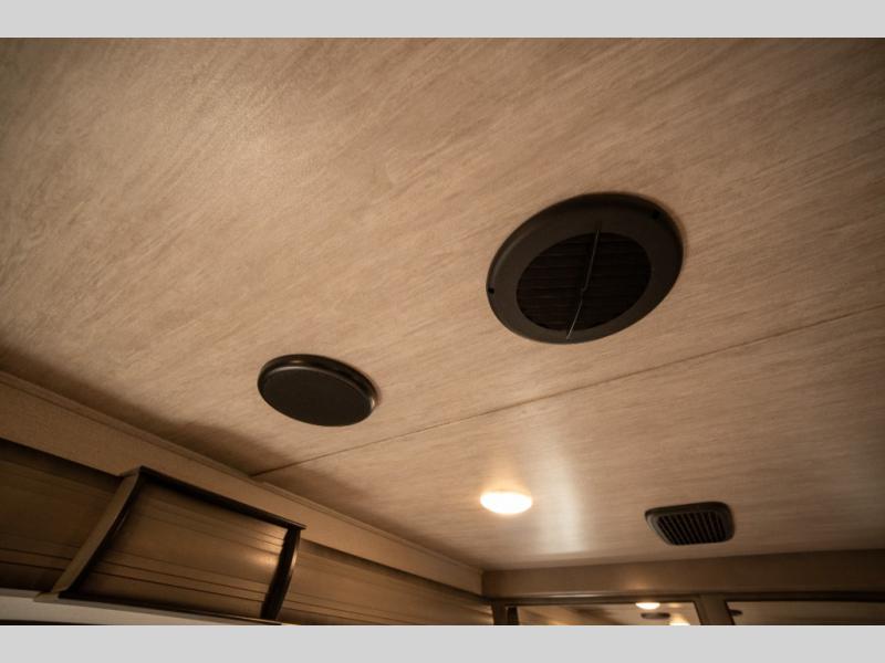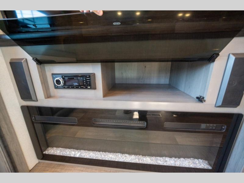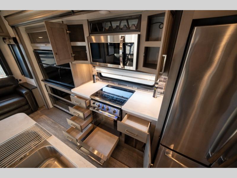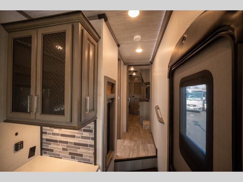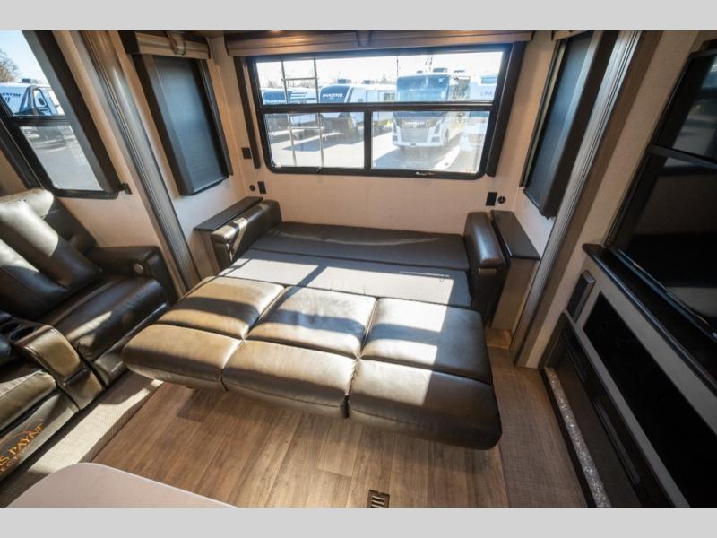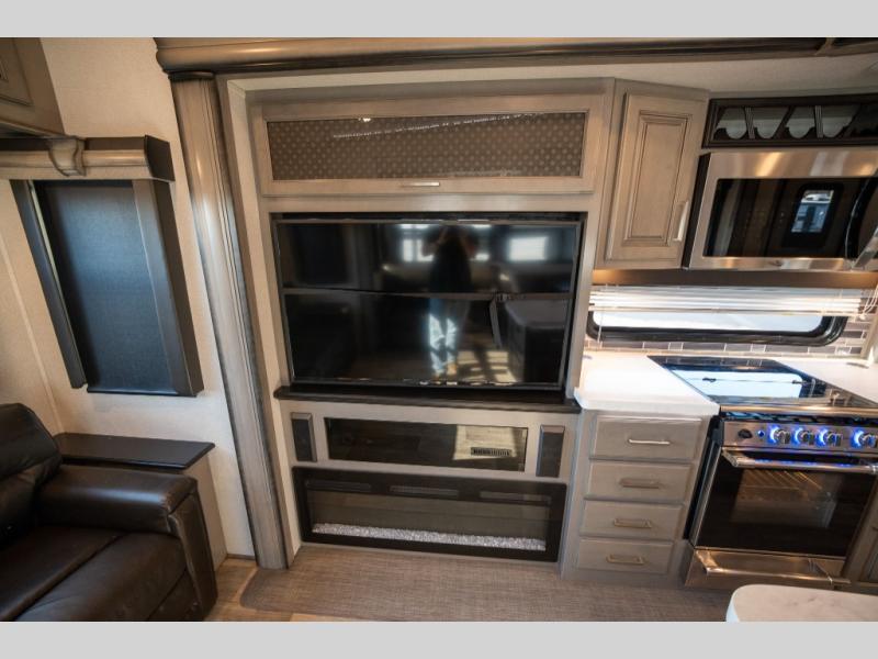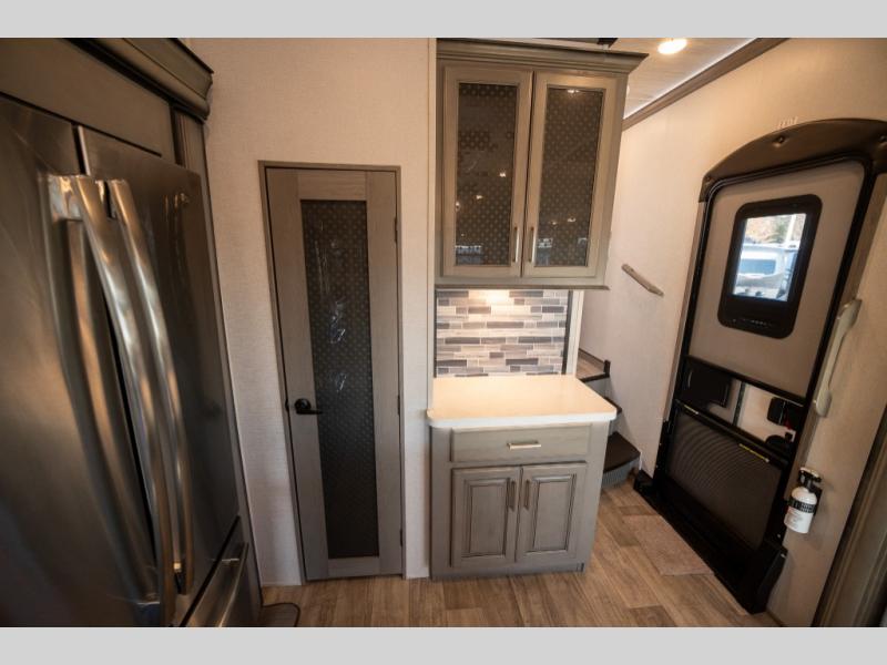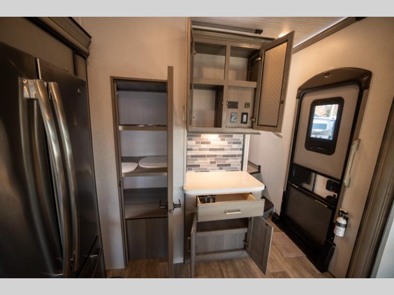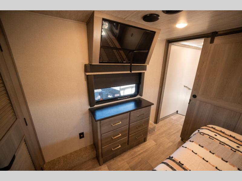 With this Montana fifth wheel, you can have adventures any time! The private bedroom has a barn door that closes it off from the rest of the unit, and the bedroom is fully equipped for comfort with a queen bed slide, a dresser with 32" LED HDTV, a clothing hamper, a huge closet, and an area prepped for the optional washer/dryer. The main living area is also going to feel exceptionally comfortable with its hide-a-bed sofa, power theater seating, fireplace, and 50" LED HDTV. As you spend your afternoon working on dinner, you'll appreciate that the large island provides you with additional prep space, and the coffee station is going to be a fun feature to use both in the morning and in the afternoon for a pick-me-up.