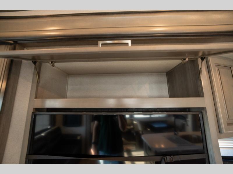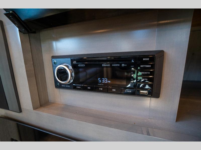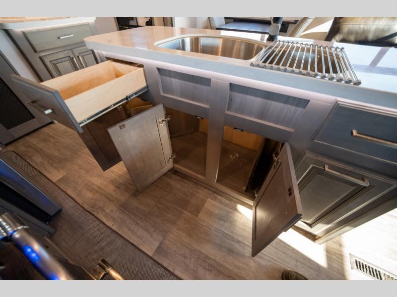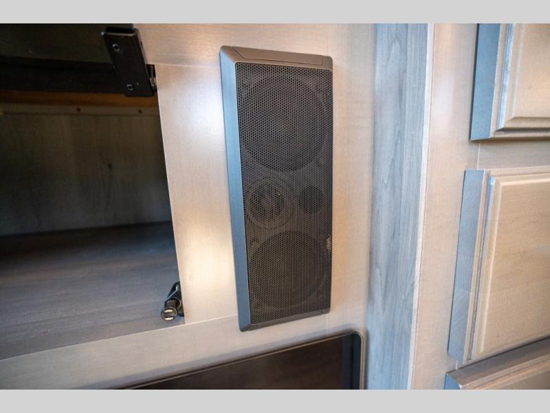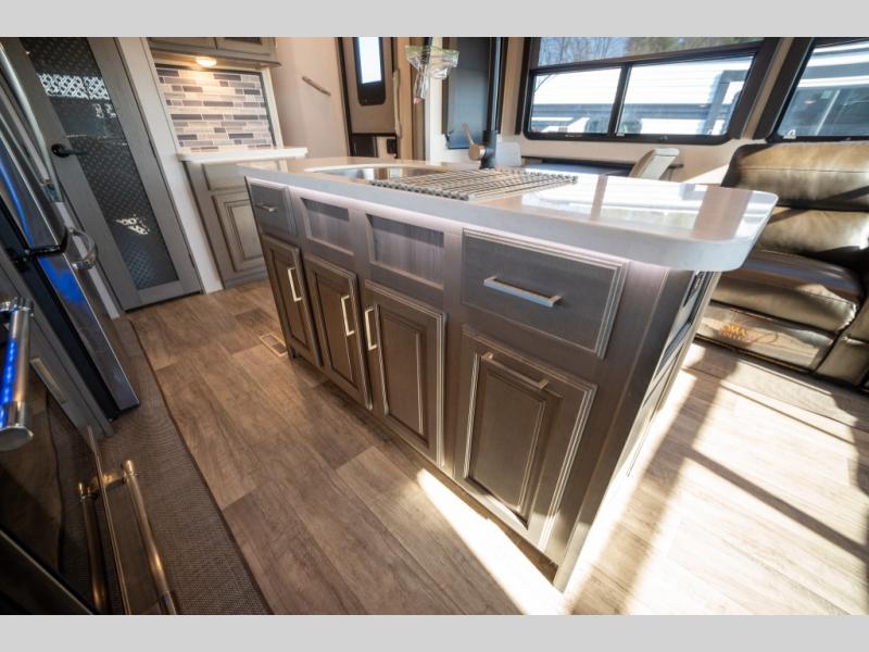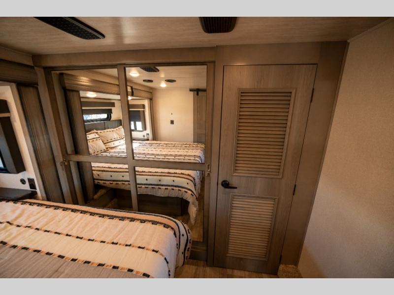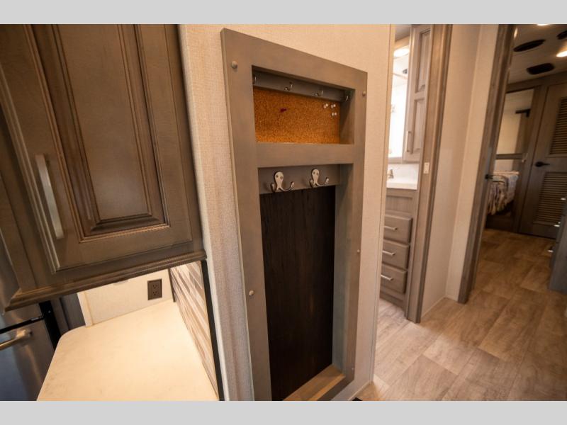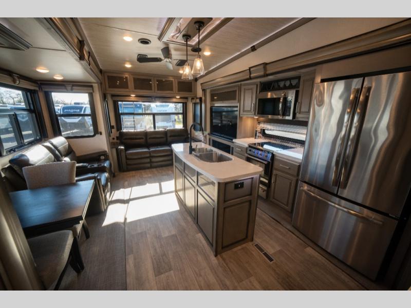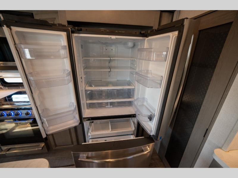 With this Montana fifth wheel, you can have adventures any time! The private bedroom has a barn door that closes it off from the rest of the unit, and the bedroom is fully equipped for comfort with a queen bed slide, a dresser with 32" LED HDTV, a clothing hamper, a huge closet, and an area prepped for the optional washer/dryer. The main living area is also going to feel exceptionally comfortable with its hide-a-bed sofa, power theater seating, fireplace, and 50" LED HDTV. As you spend your afternoon working on dinner, you'll appreciate that the large island provides you with additional prep space, and the coffee station is going to be a fun feature to use both in the morning and in the afternoon for a pick-me-up.