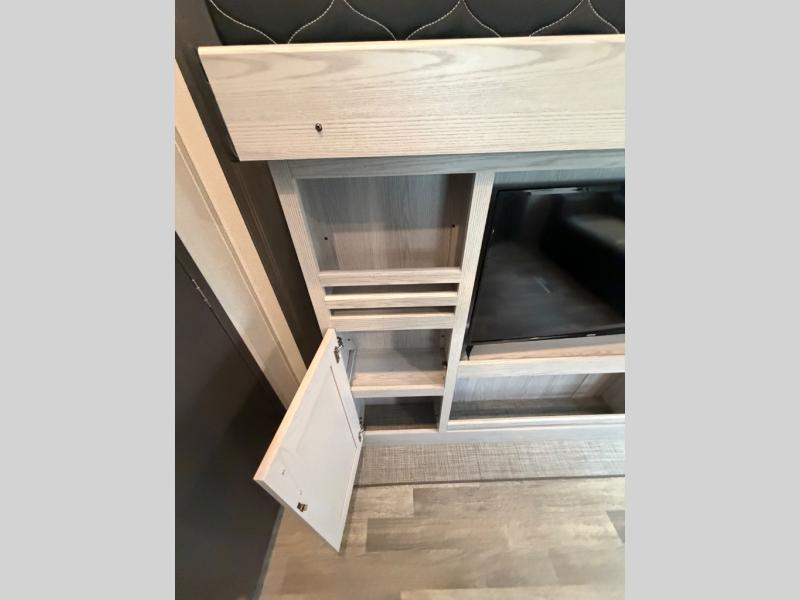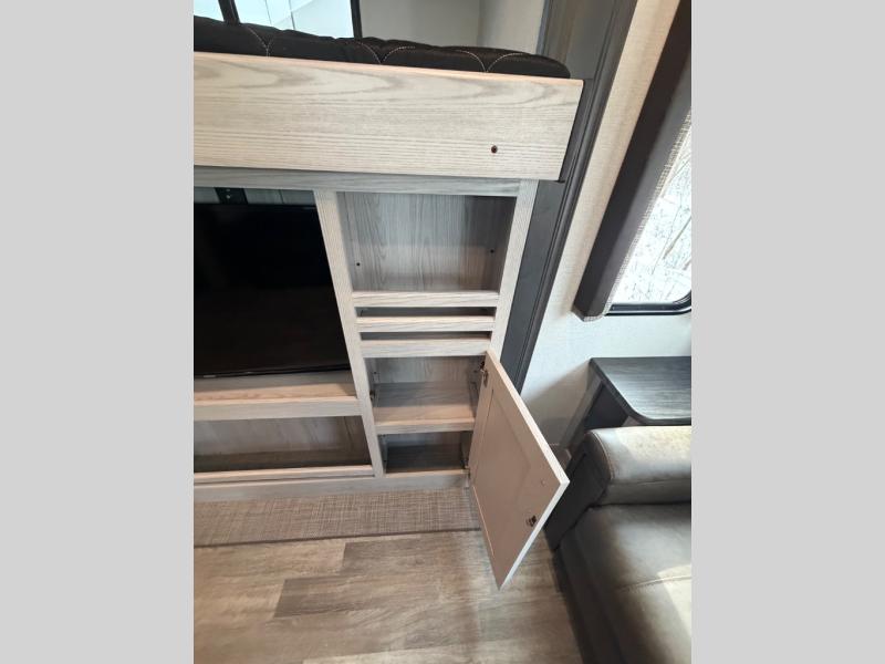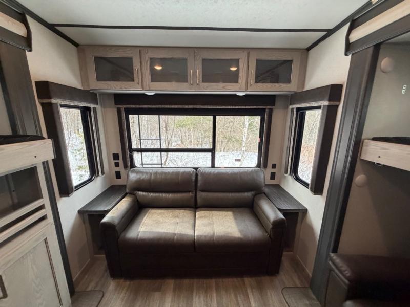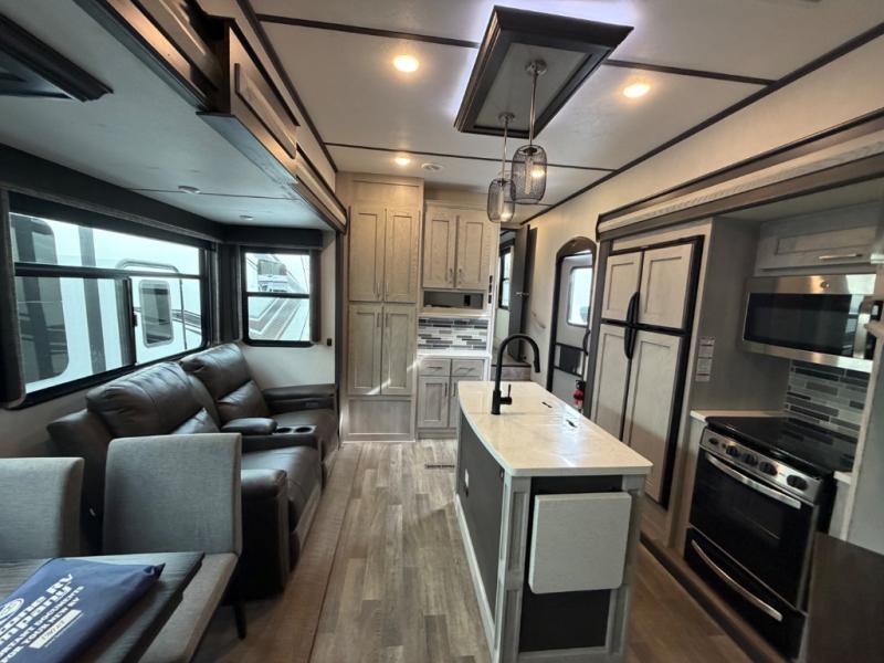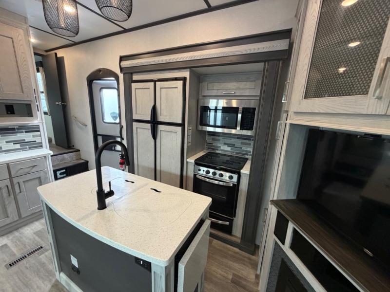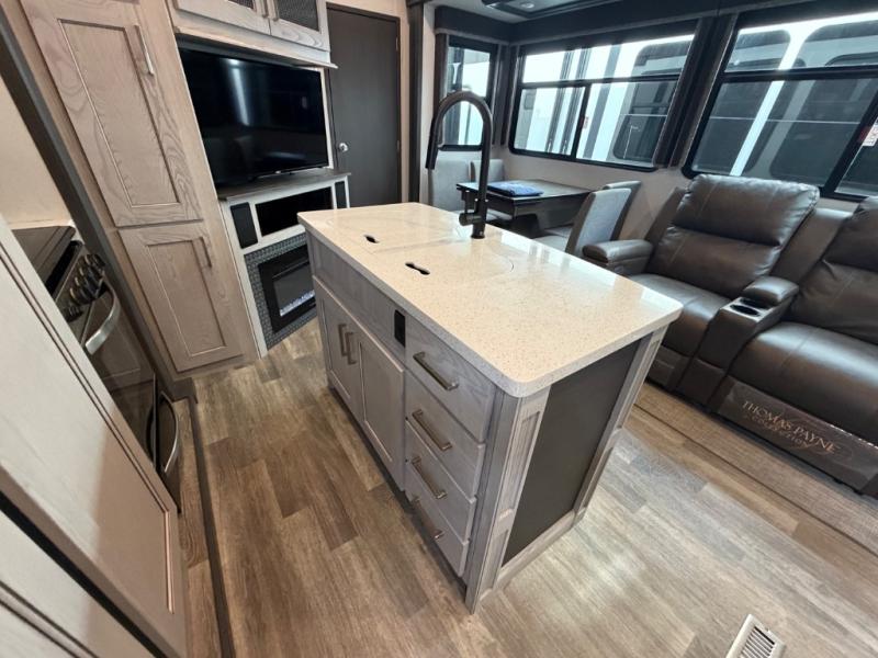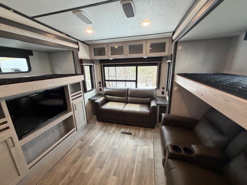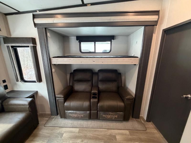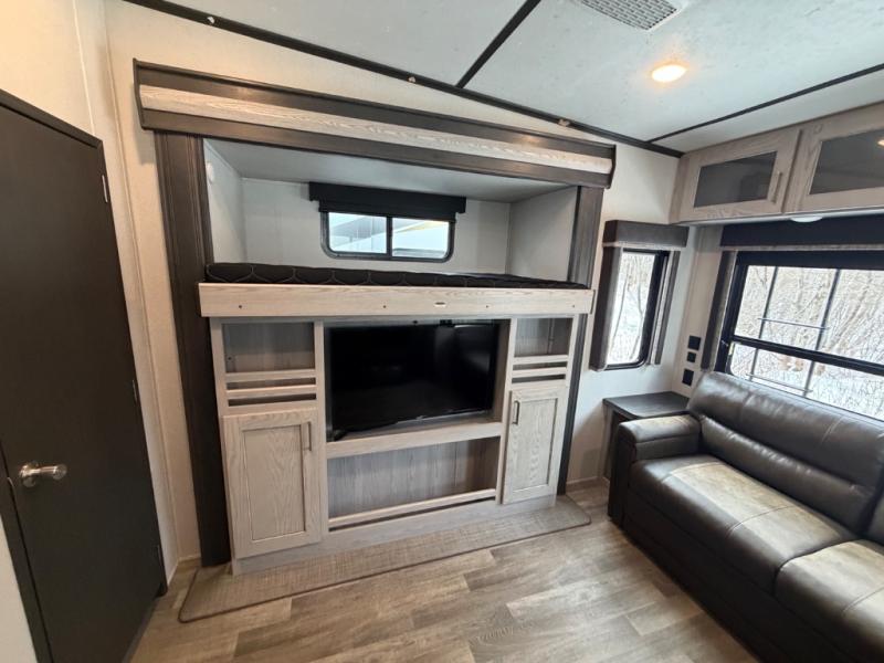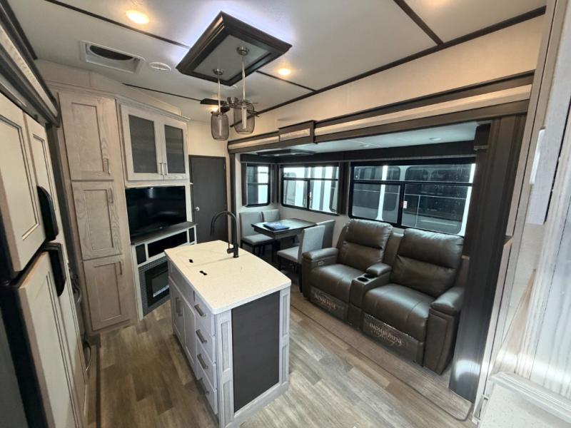 This family-friendly fifth wheel offers a private den that can also be utilized as a bunkhouse with two bunk beds, an LCD TV, and access to the half bath which also allows access from the exterior. The cook will enjoy the kitchen island with counter extension for extra prep space, a hutch for displaying decor, and a 13 cu. ft. RV refrigerator for plenty of storage for ingredients and food. The main living area combined with the kitchen offers power theater seats, a fireplace, and all the appliances needed to make meals. Mom and dad will love to retreat each night to the front master suite with a slide out queen bed and a large wardrobe and more storage. Outside you can make meals on the outdoor kitchen with a two burner cooktop drawer, a microwave, and a refrigerator. You will also find a water station, an awning, and a 2" receiver hitch on the rear.